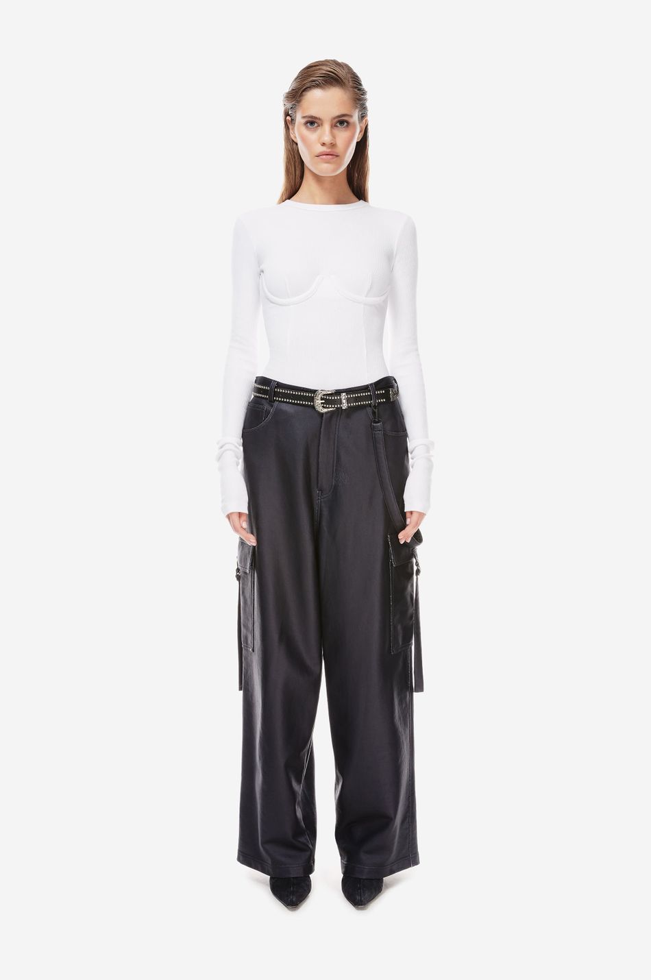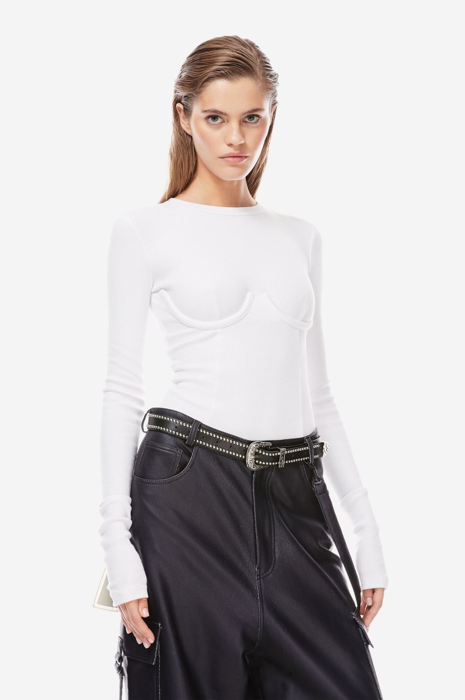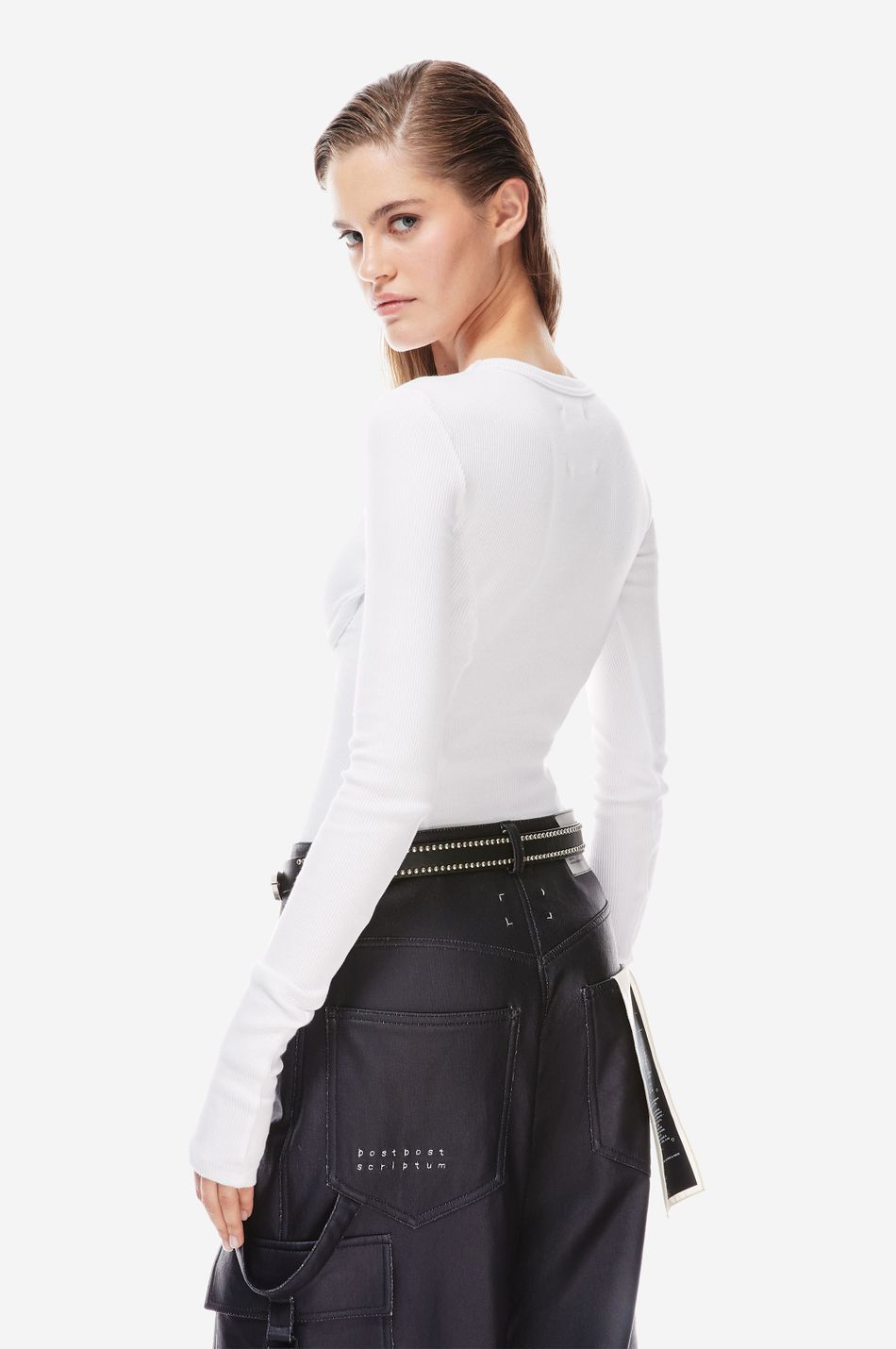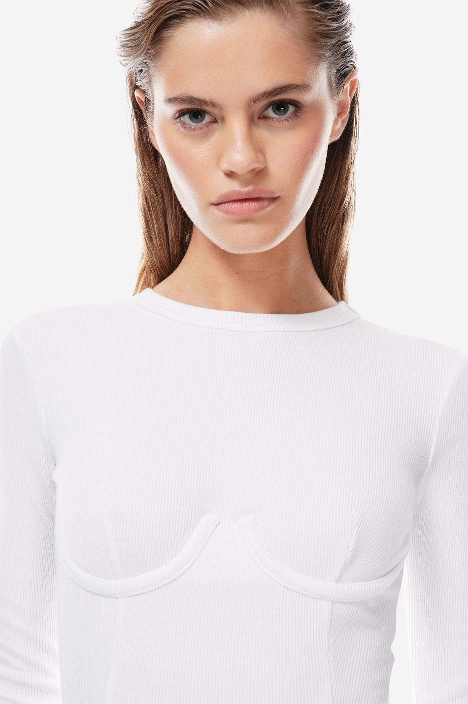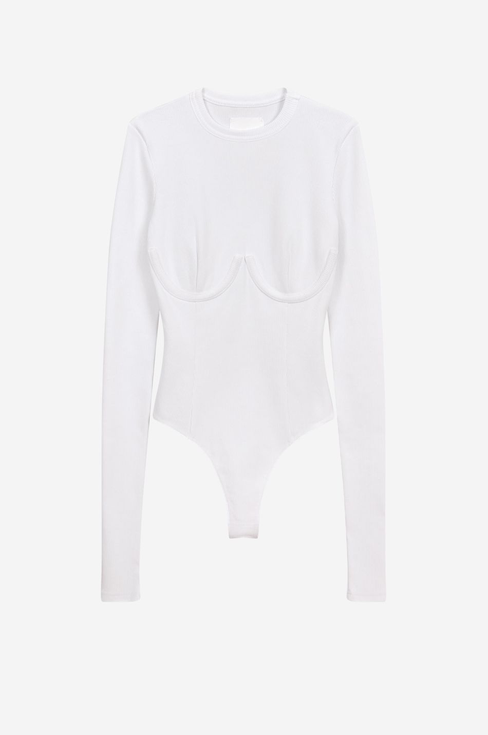 хлопковый боди в рубчик на косточках, очерчивающих форму груди. круглый вырез, удлиненные рукава и декоративные швы спереди