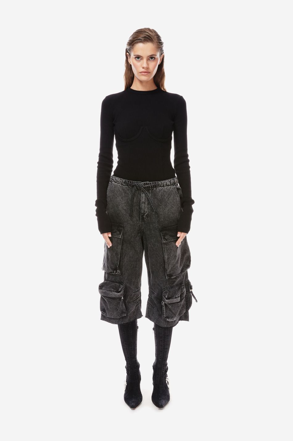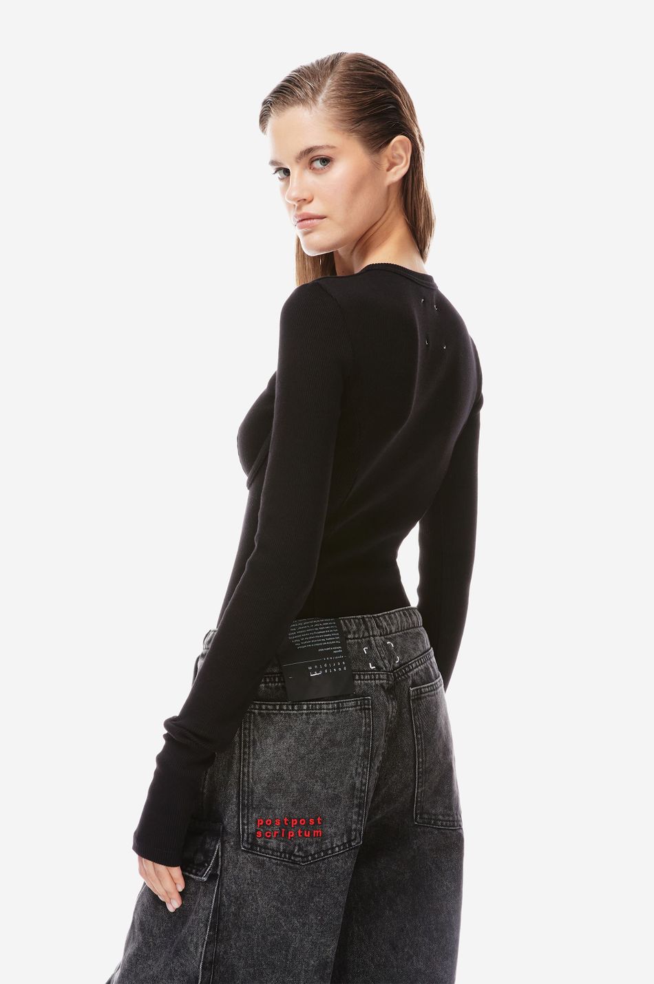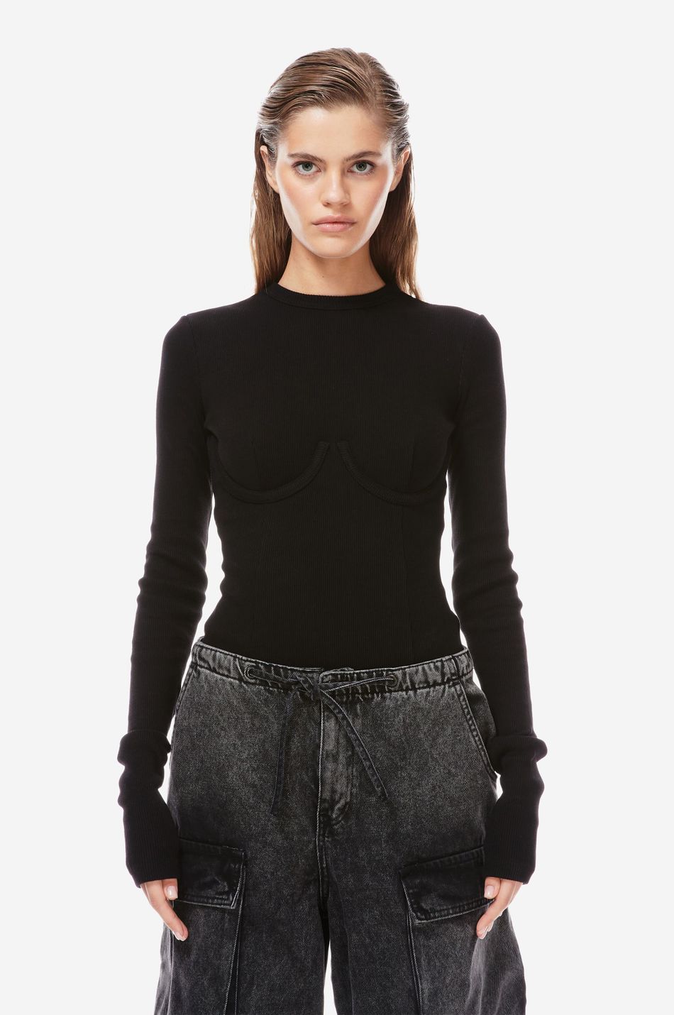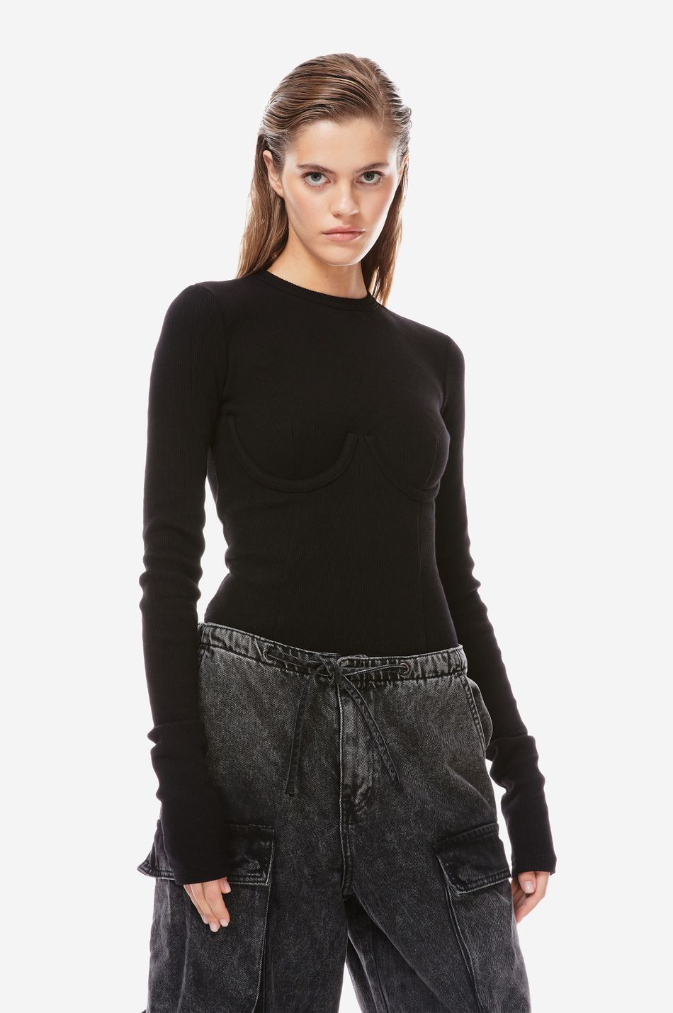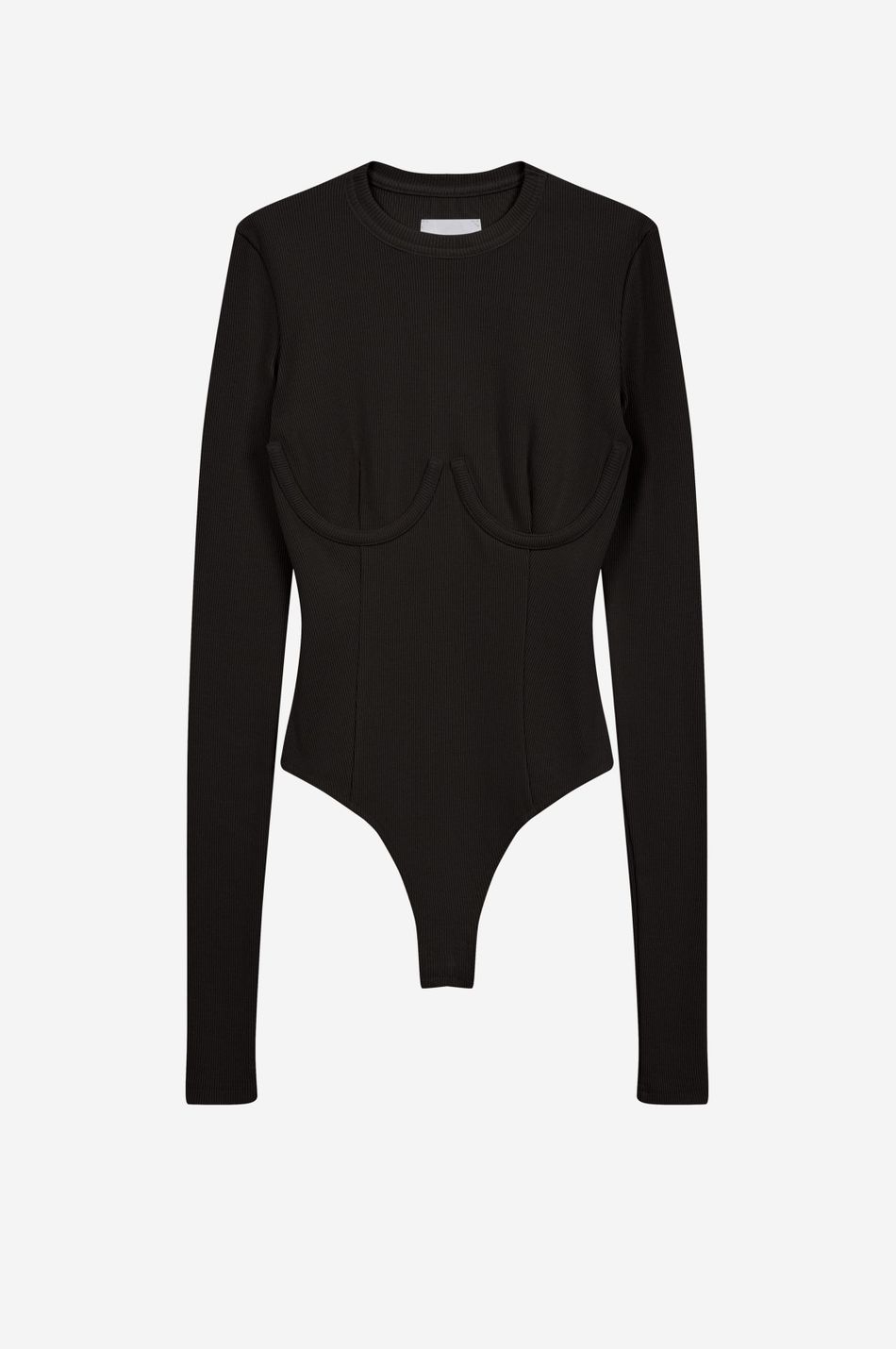 хлопковый боди в рубчик на косточках, очерчивающих форму груди. круглый вырез, удлиненные рукава и декоративные швы спереди