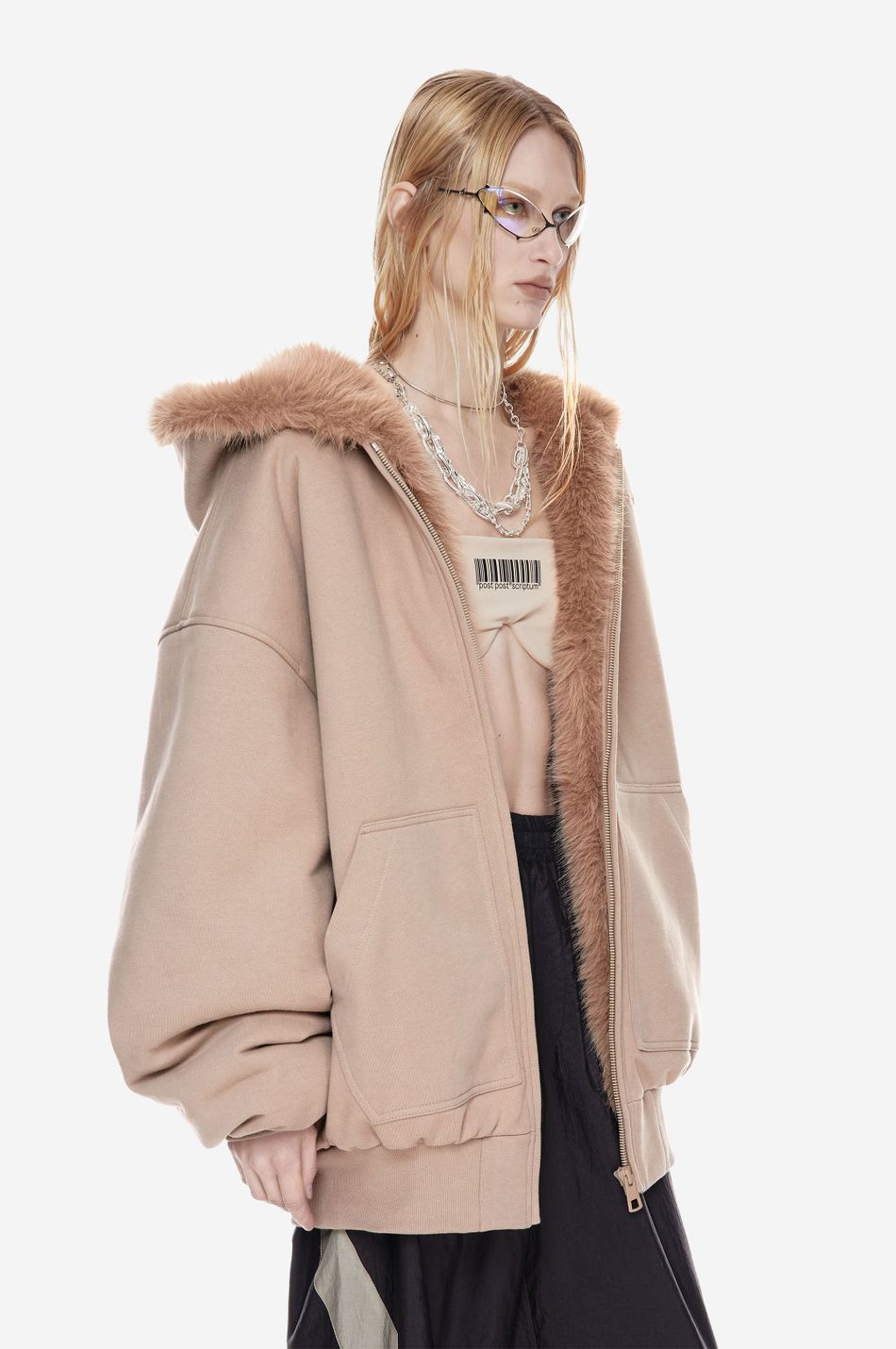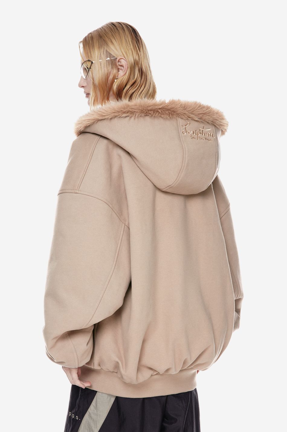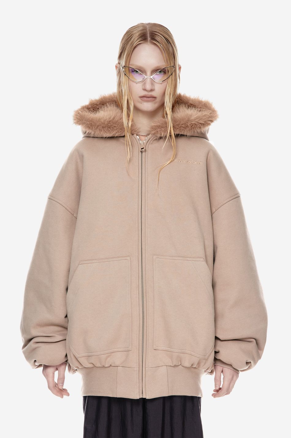 объёмный бомбер фирменного оверсайз кроя с отделкой капюшона искусственным мехом в тон. функциональная молния, карманы-кенгуру и плотные трикотажные манжеты делают модель удобной для повседневного ношения.