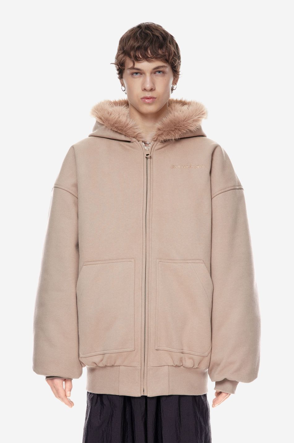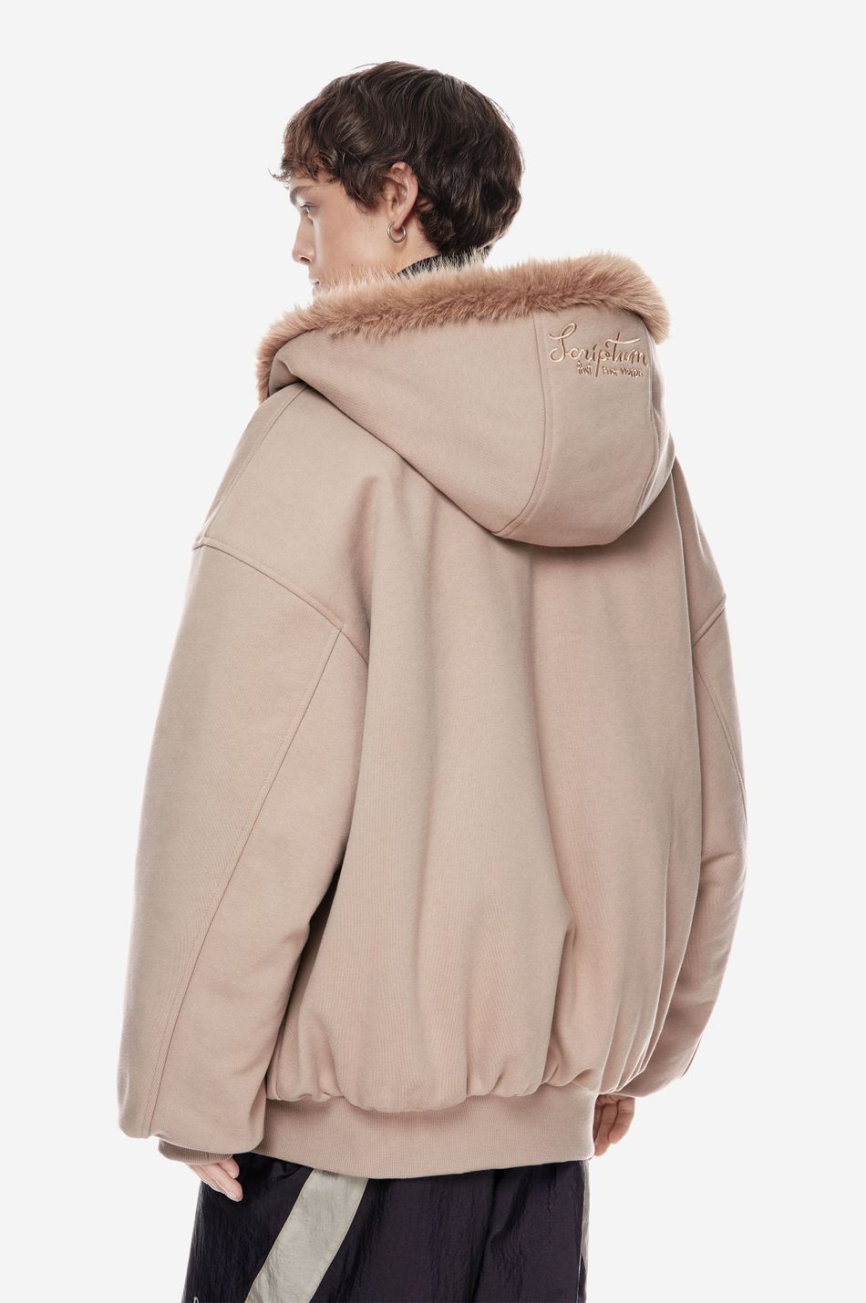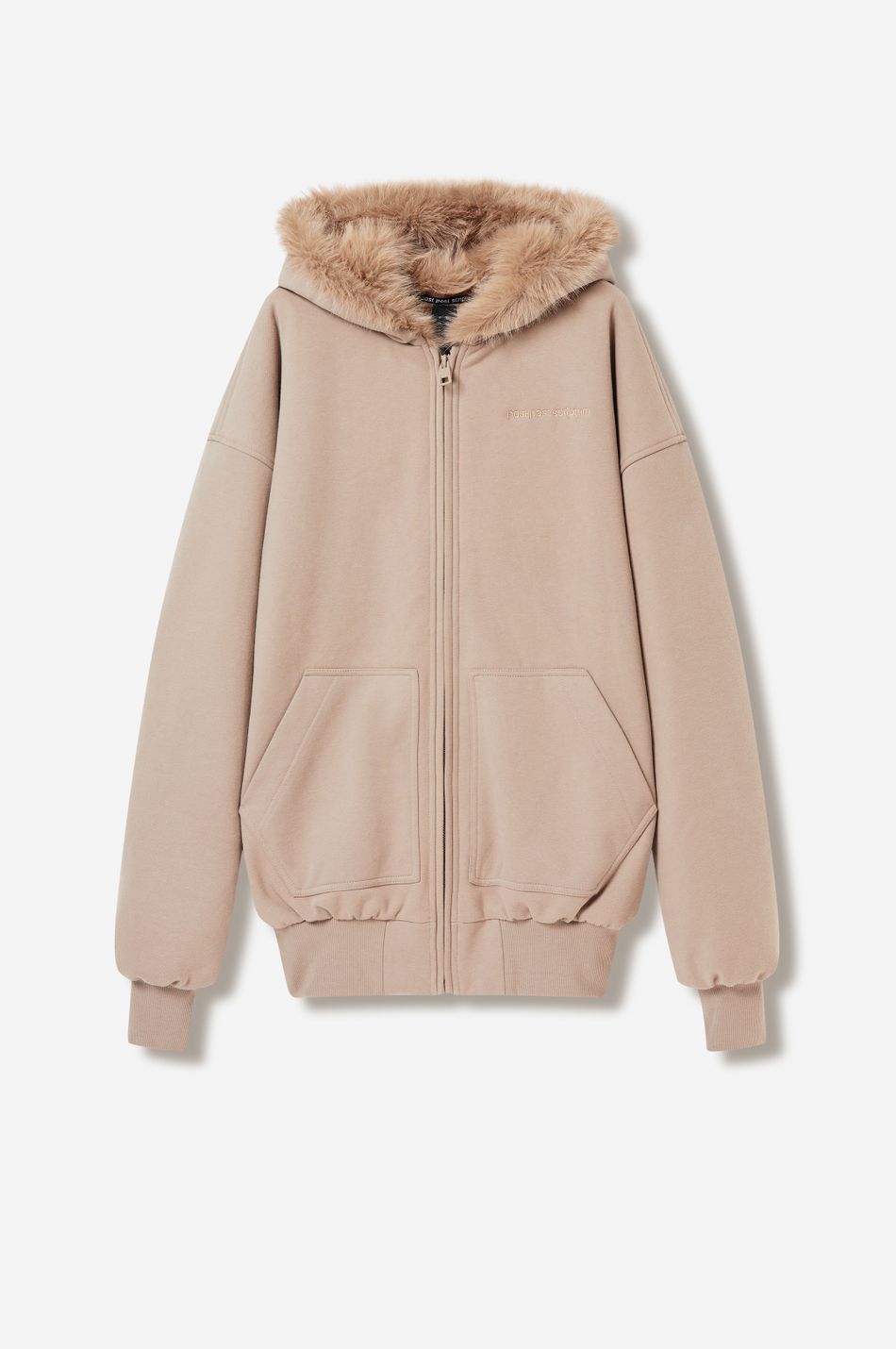объёмный бомбер фирменного оверсайз кроя с отделкой капюшона искусственным мехом в тон. функциональная молния, карманы-кенгуру и плотные трикотажные манжеты делают модель удобной для повседневного ношения.