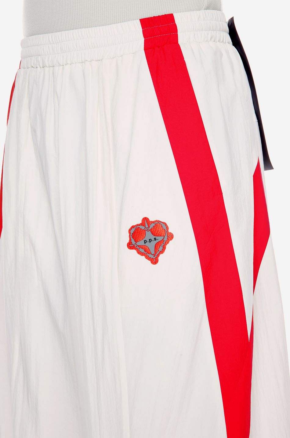 Брюки Chrome Heart — переосмысление архивного спортивного силуэта в эстетике Y2K. Контрастные красные вставки в форме шеврона по бокам и фирменный шеврон с логотипом на бедре формируют динамичный образ на стыке спорта, урбанистики и индивидуального стиля.