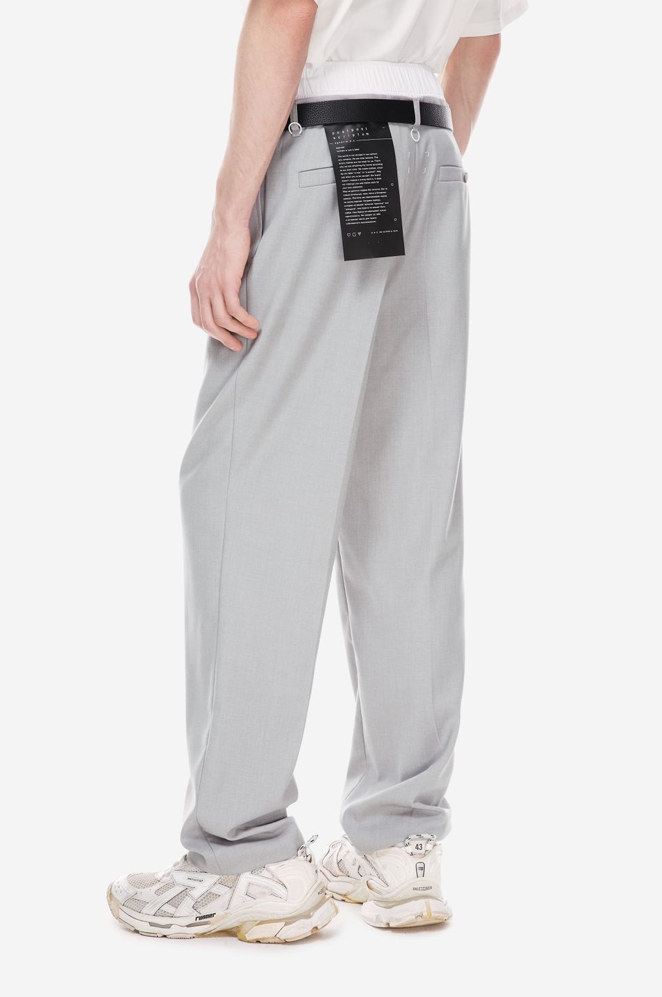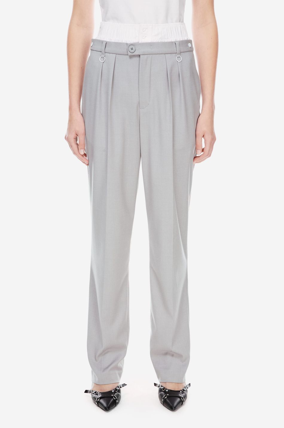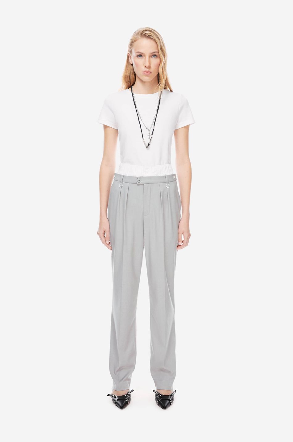 брюки прямого кроя с защипами спереди и декоративными кольцами на шлёвках. особенность модели заключается в комбинированном и эластичном двойном поясе, напоминающем нижнее белье. прорезные карманы на пуговицах сзади, контрастные декоративные пуговицы на нижнем поясе, застегиваются на молниию и пуговицу.