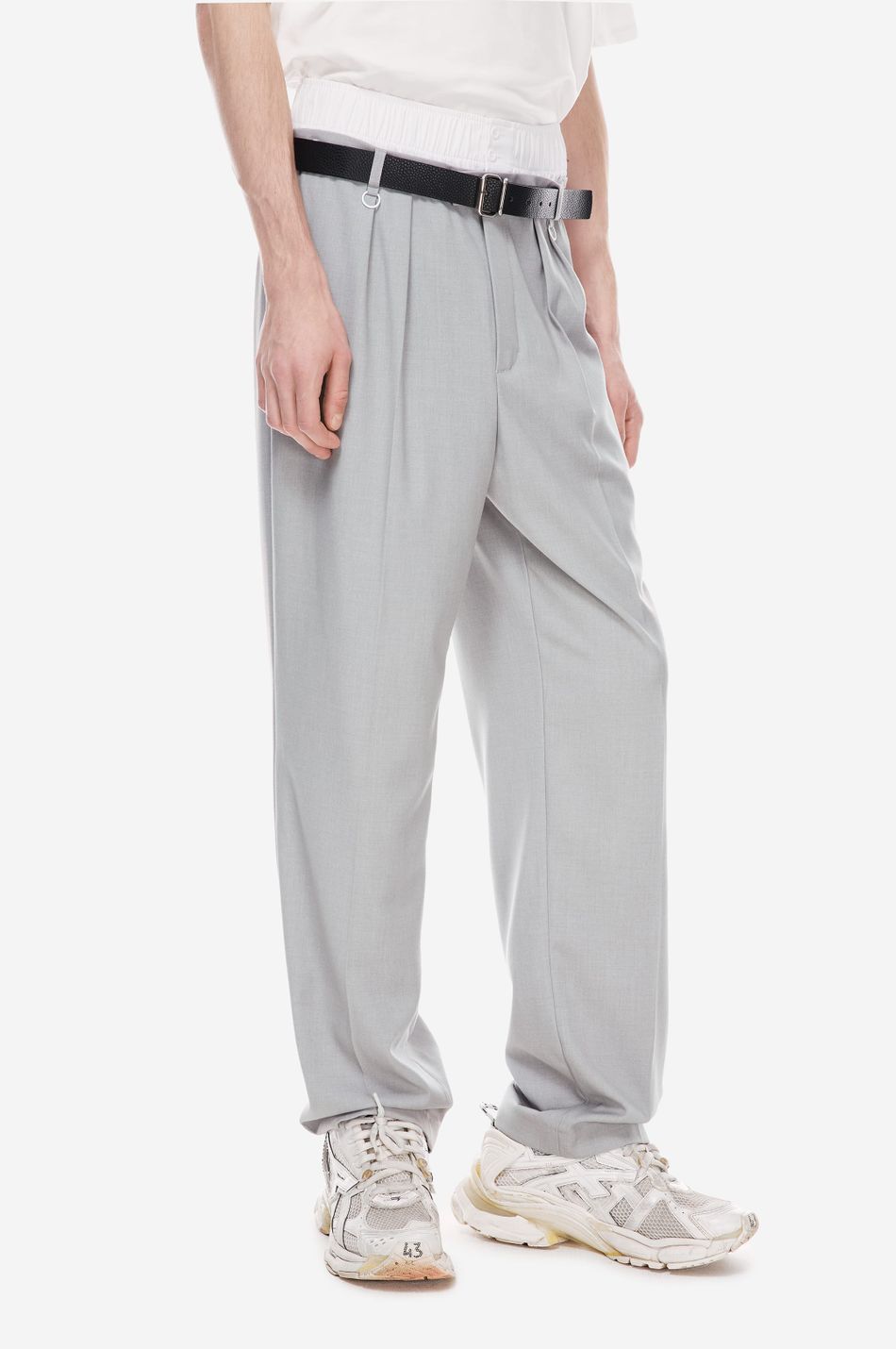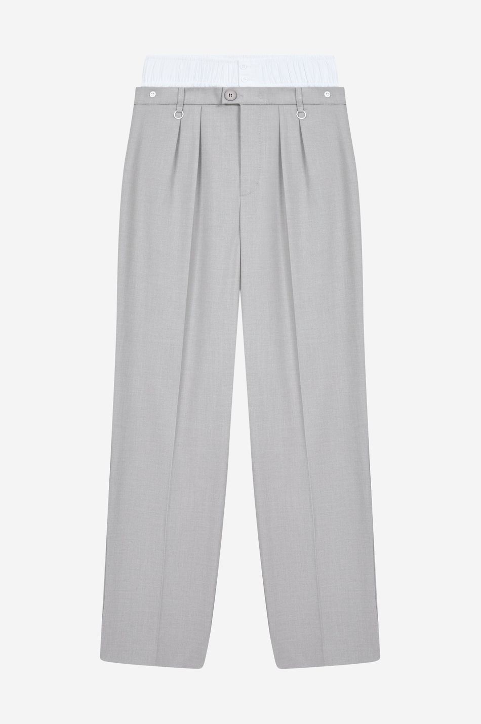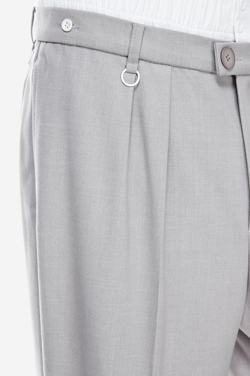 брюки прямого кроя с защипами спереди и декоративными кольцами на шлёвках. особенность модели заключается в комбинированном и эластичном двойном поясе, напоминающем нижнее белье. прорезные карманы на пуговицах сзади, контрастные декоративные пуговицы на нижнем поясе, застегиваются на молниию и пуговицу.