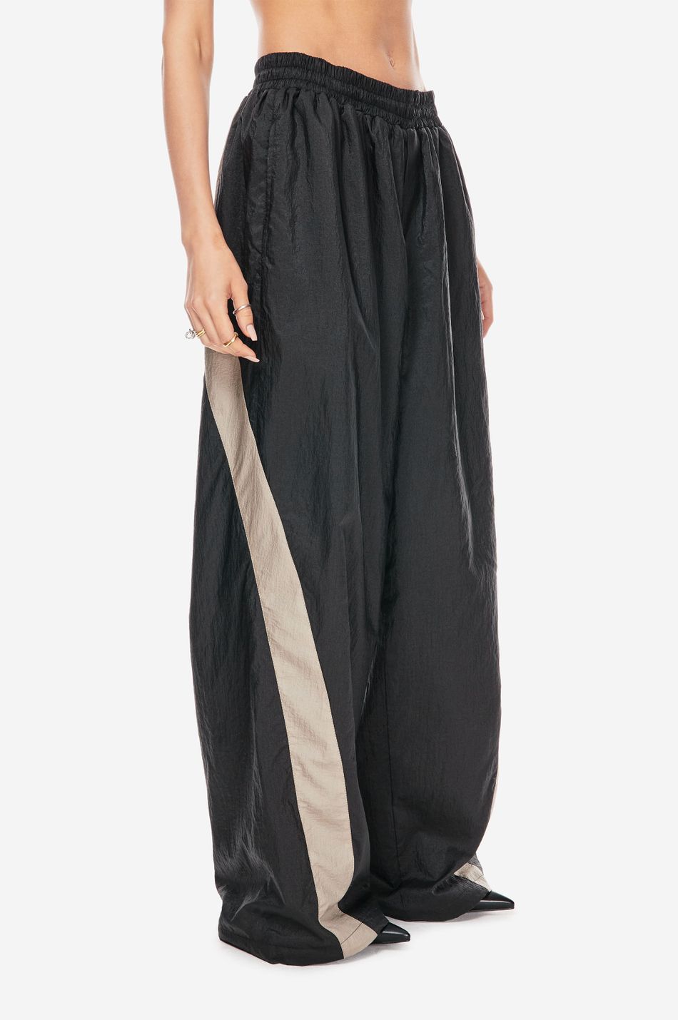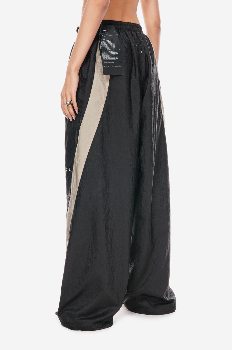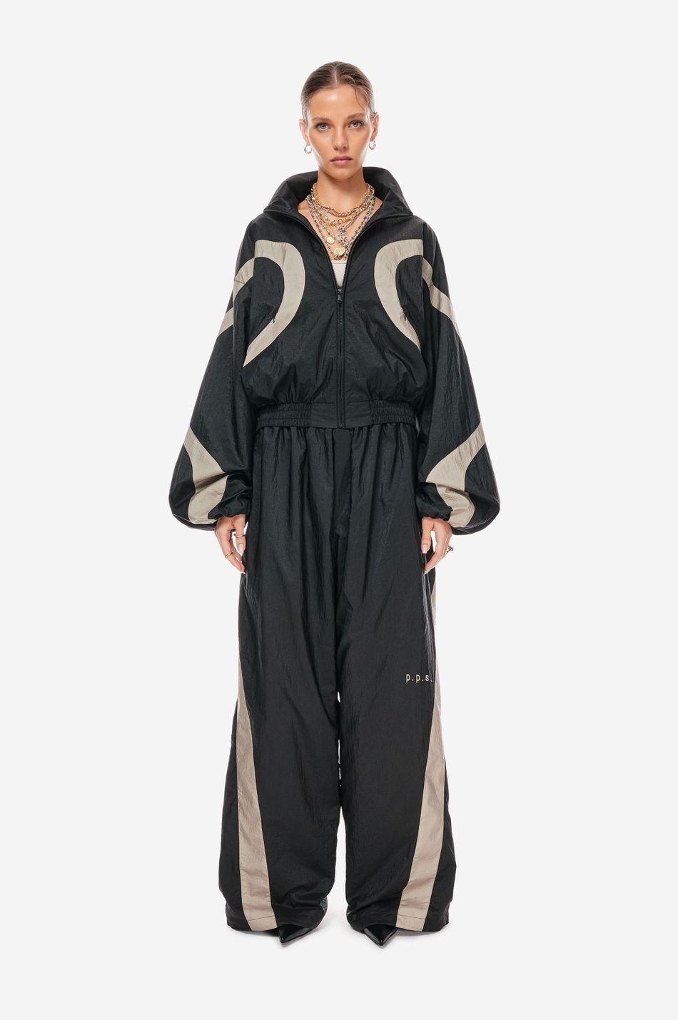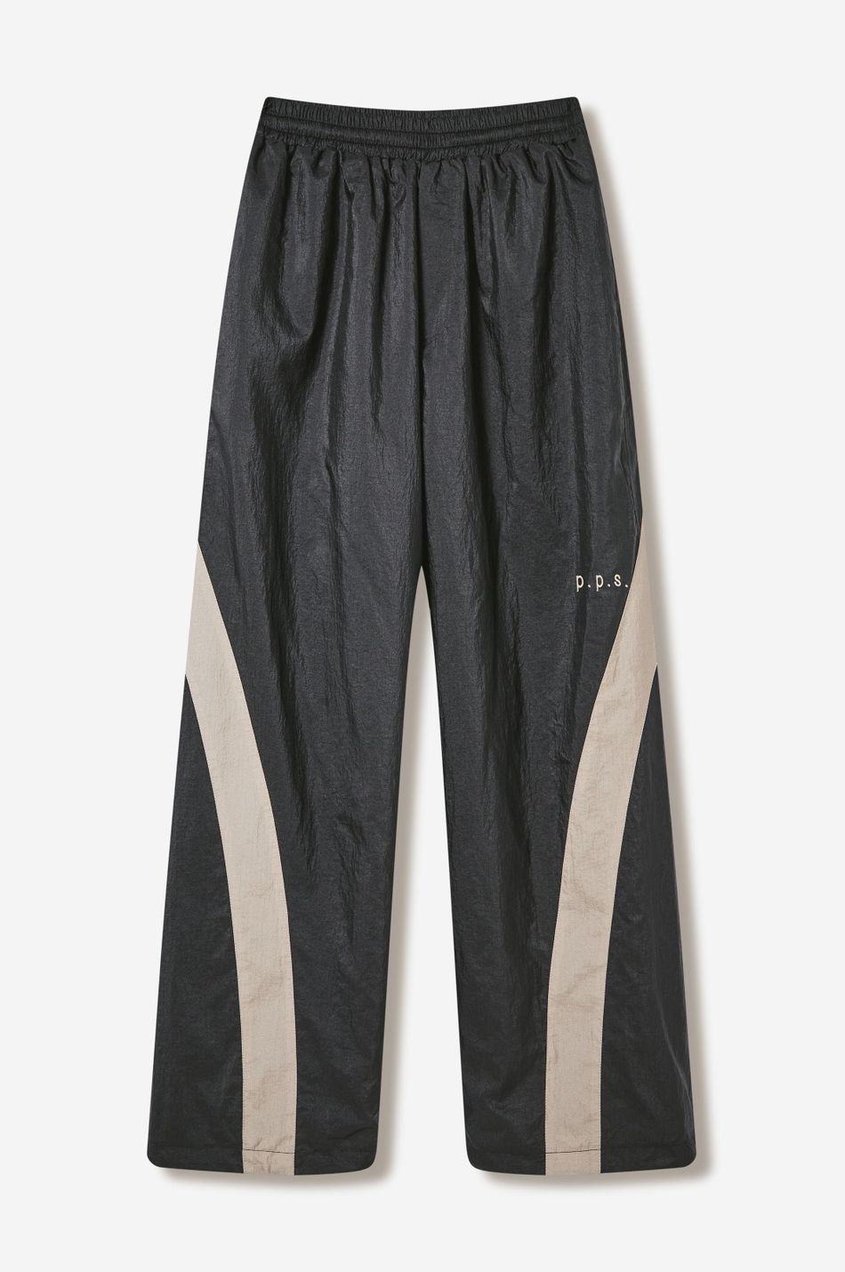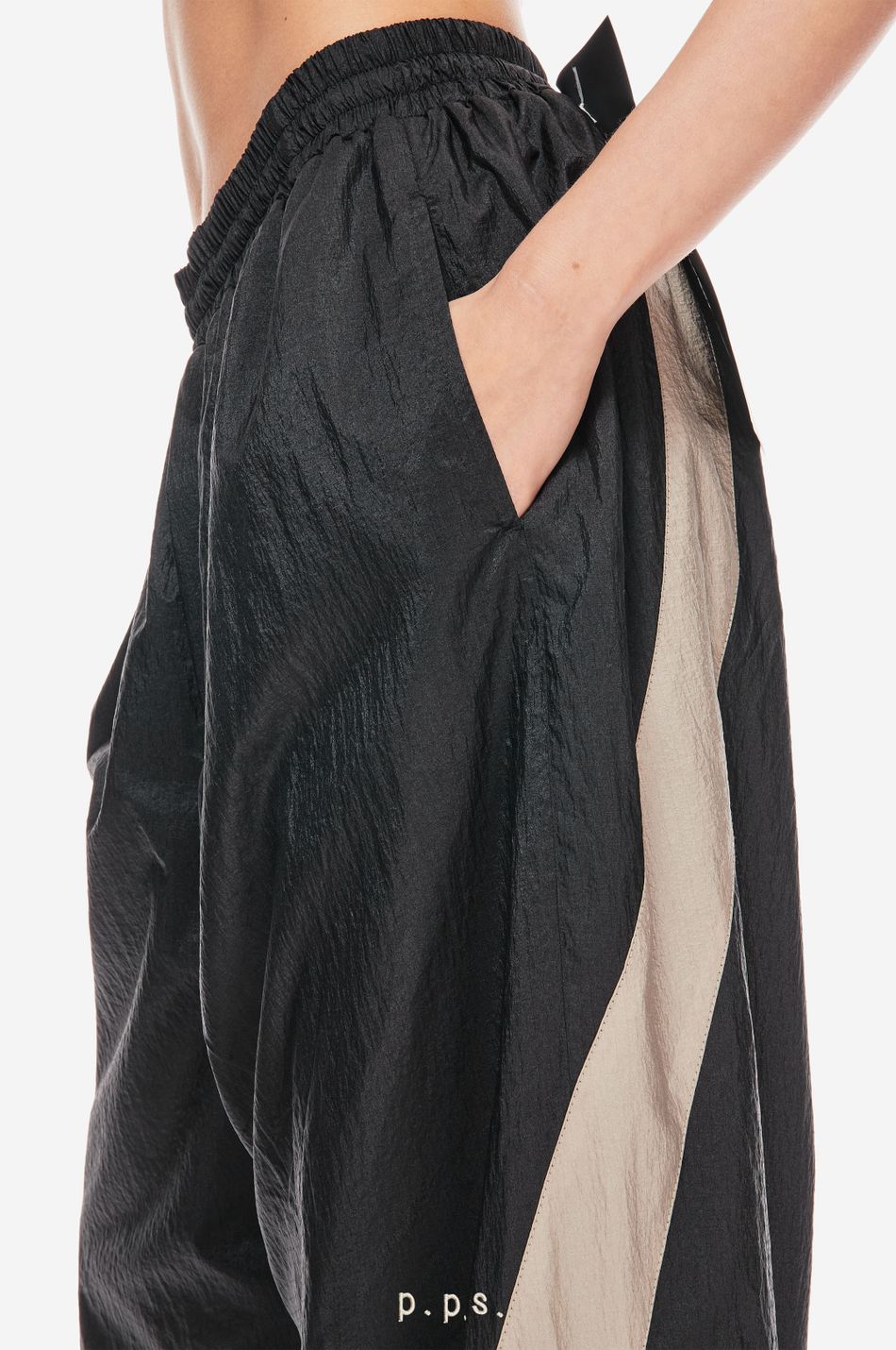 брюки Loop Comfy: широкий крой, контрастные вставки, регулируемый низ. фирменные детали — вышитые скобки и патч-манифест. новый код в коллекции от post post scriptum.