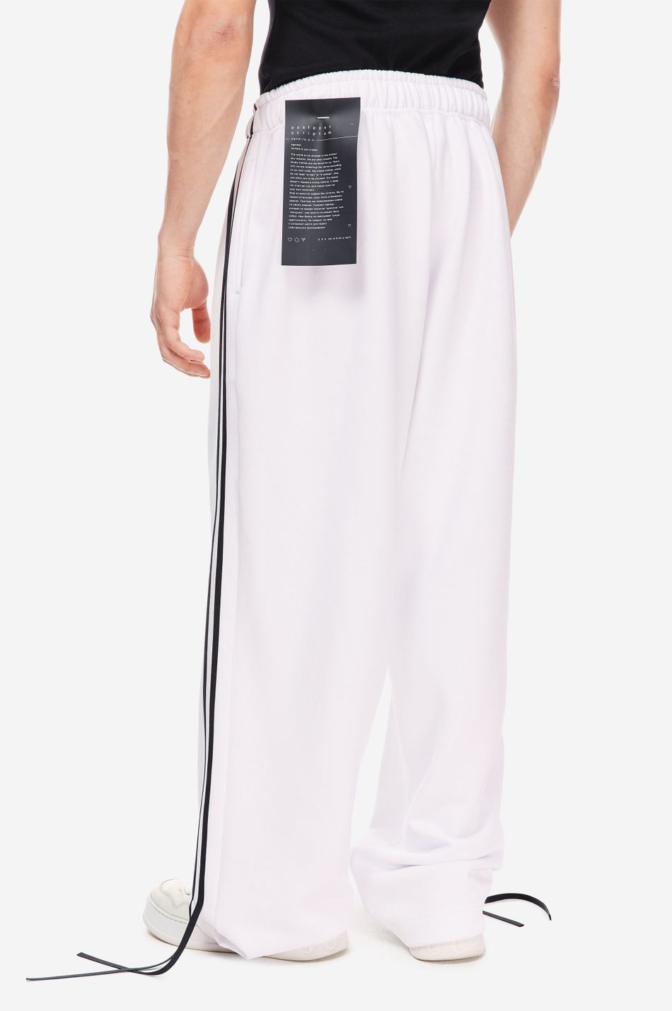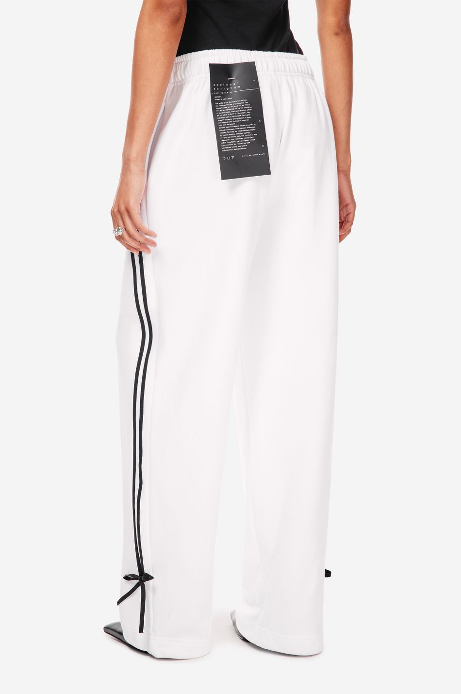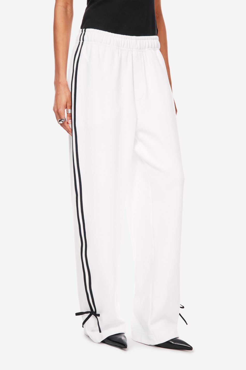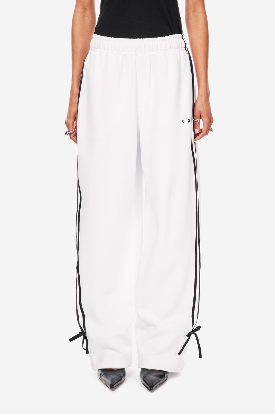 при пошиве брюк свободного кроя с широким эластичным поясом взяли мягкий хлопок. модель объединила в себе спортивные элементы в виде лампасов в тон по бокам и легкую романтичность, которую обеспечили бантики снизу. левую брючину украсили небольшой контрастной вышивкой с логотипом бренда.