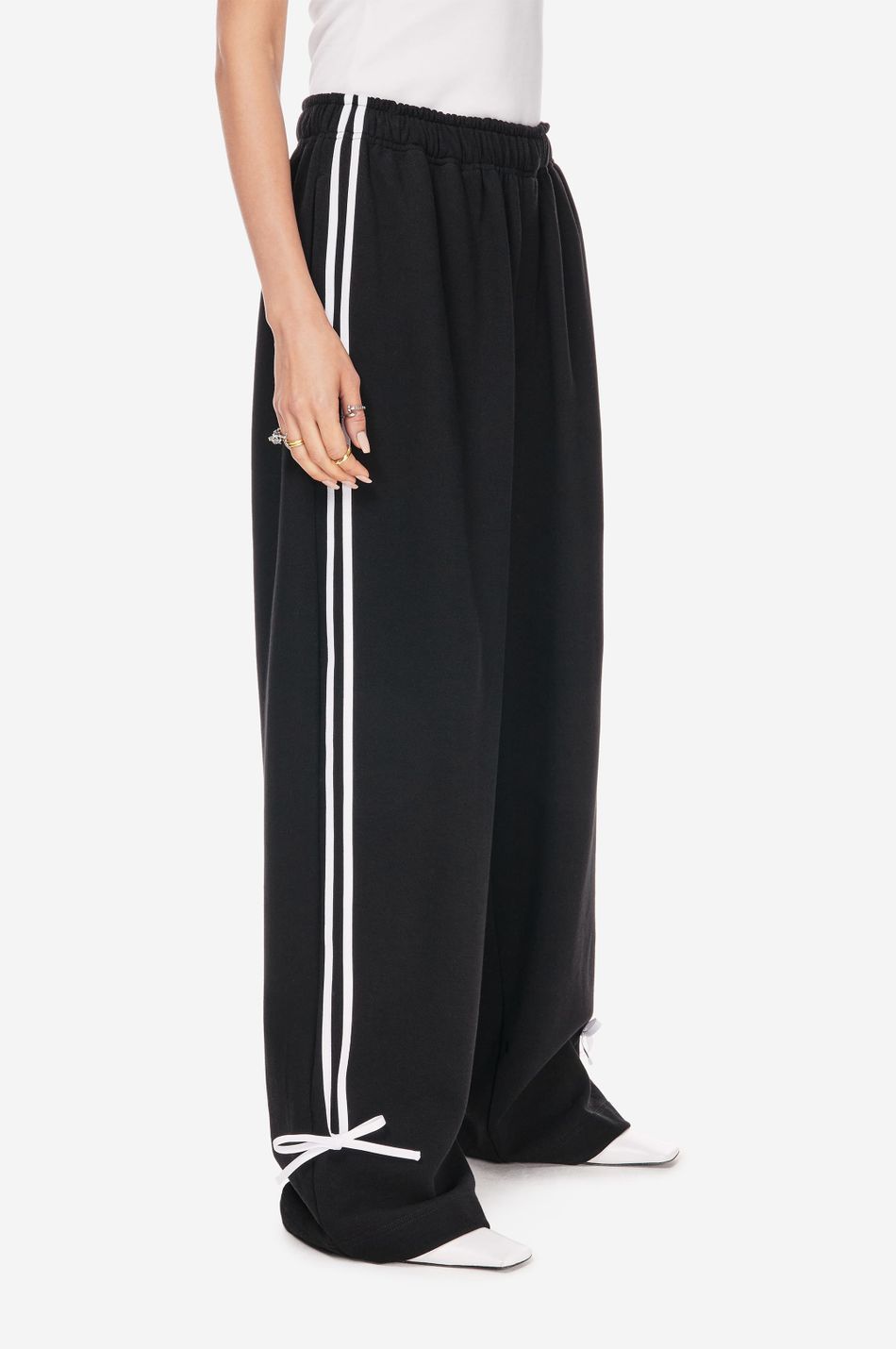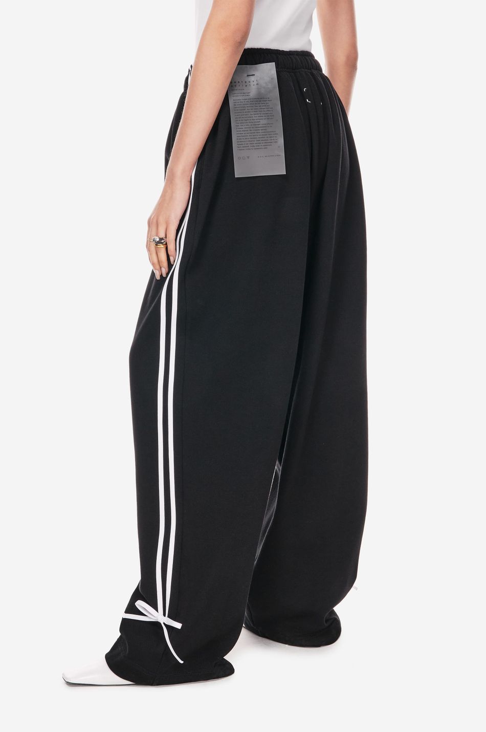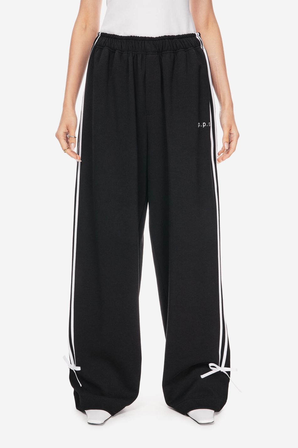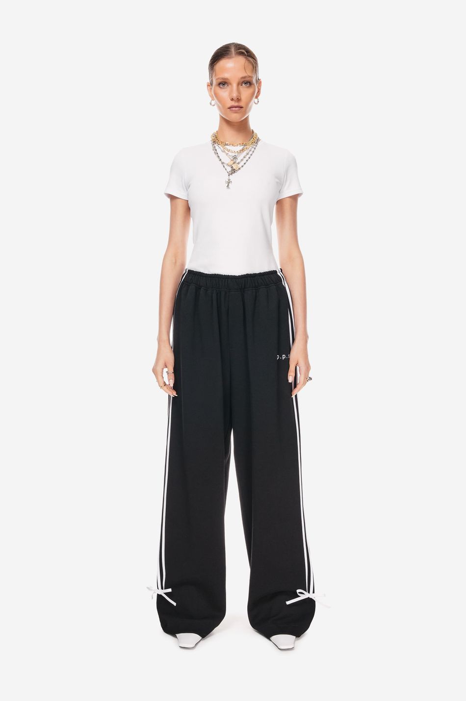Бестселлер коллекции и один из самых узнаваемых кодов post post scriptum. Трикотажные брюки свободного кроя с контрастными лампасами и декоративными бантами раскрывают стиль глэм-спорта в интерпретации эстетики бренда.