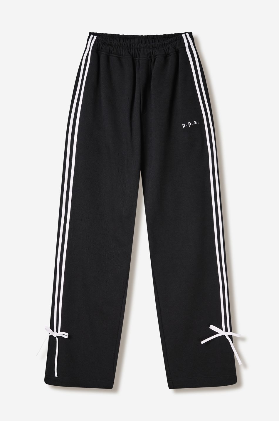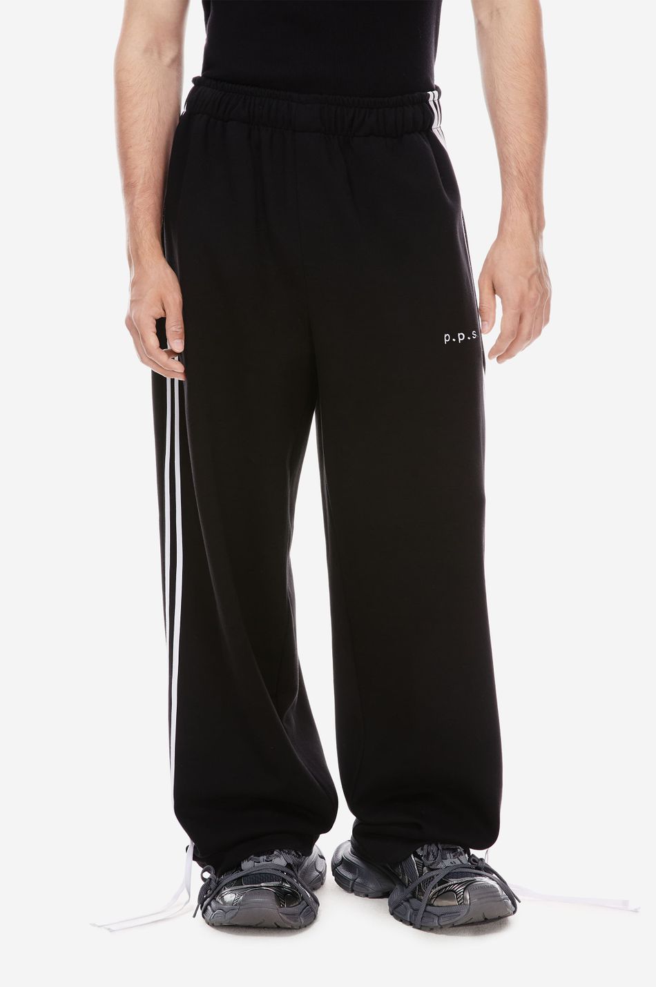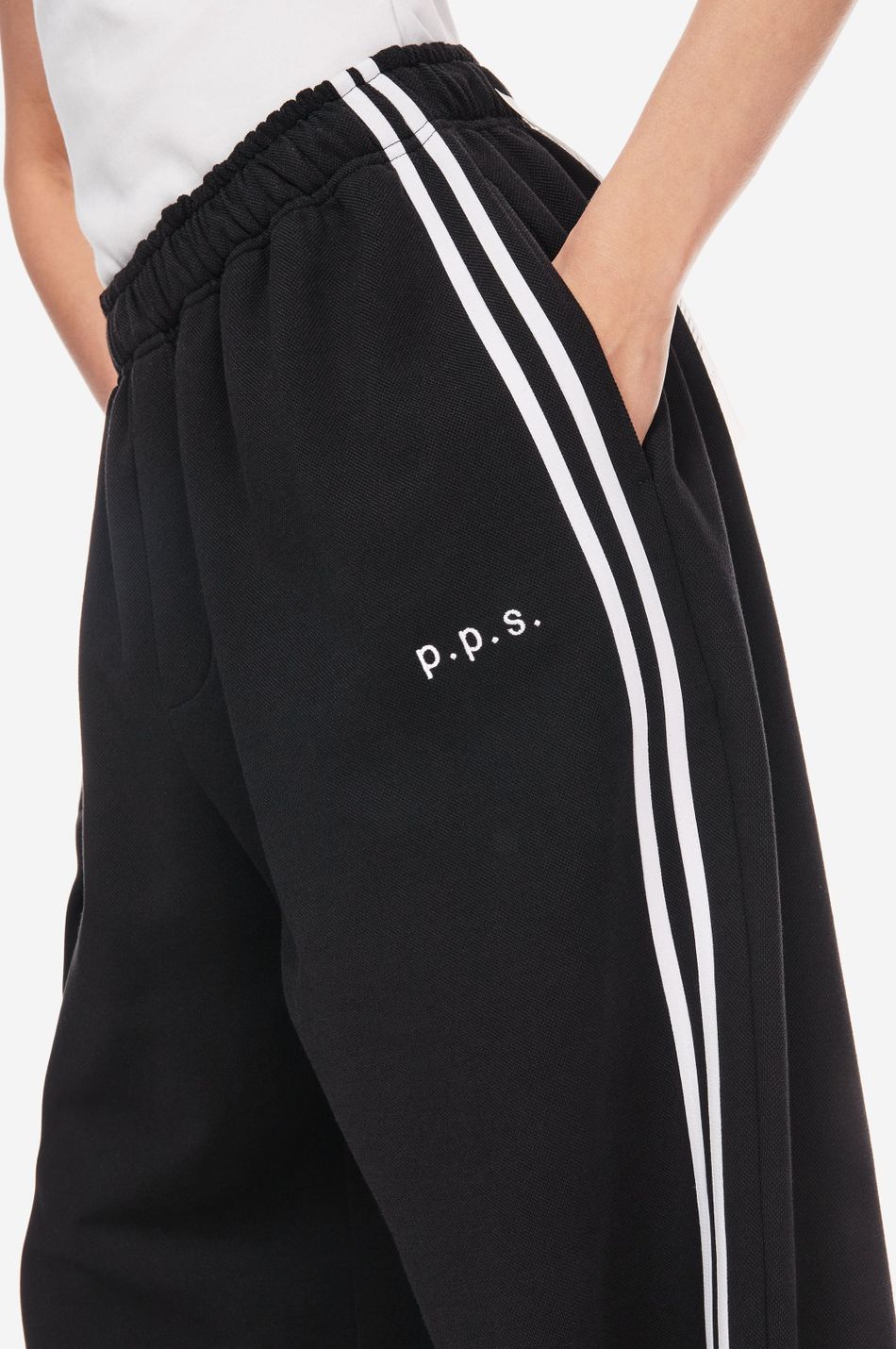 Бестселлер коллекции и один из самых узнаваемых кодов post post scriptum. Трикотажные брюки свободного кроя с контрастными лампасами и декоративными бантами раскрывают стиль глэм-спорта в интерпретации эстетики бренда.