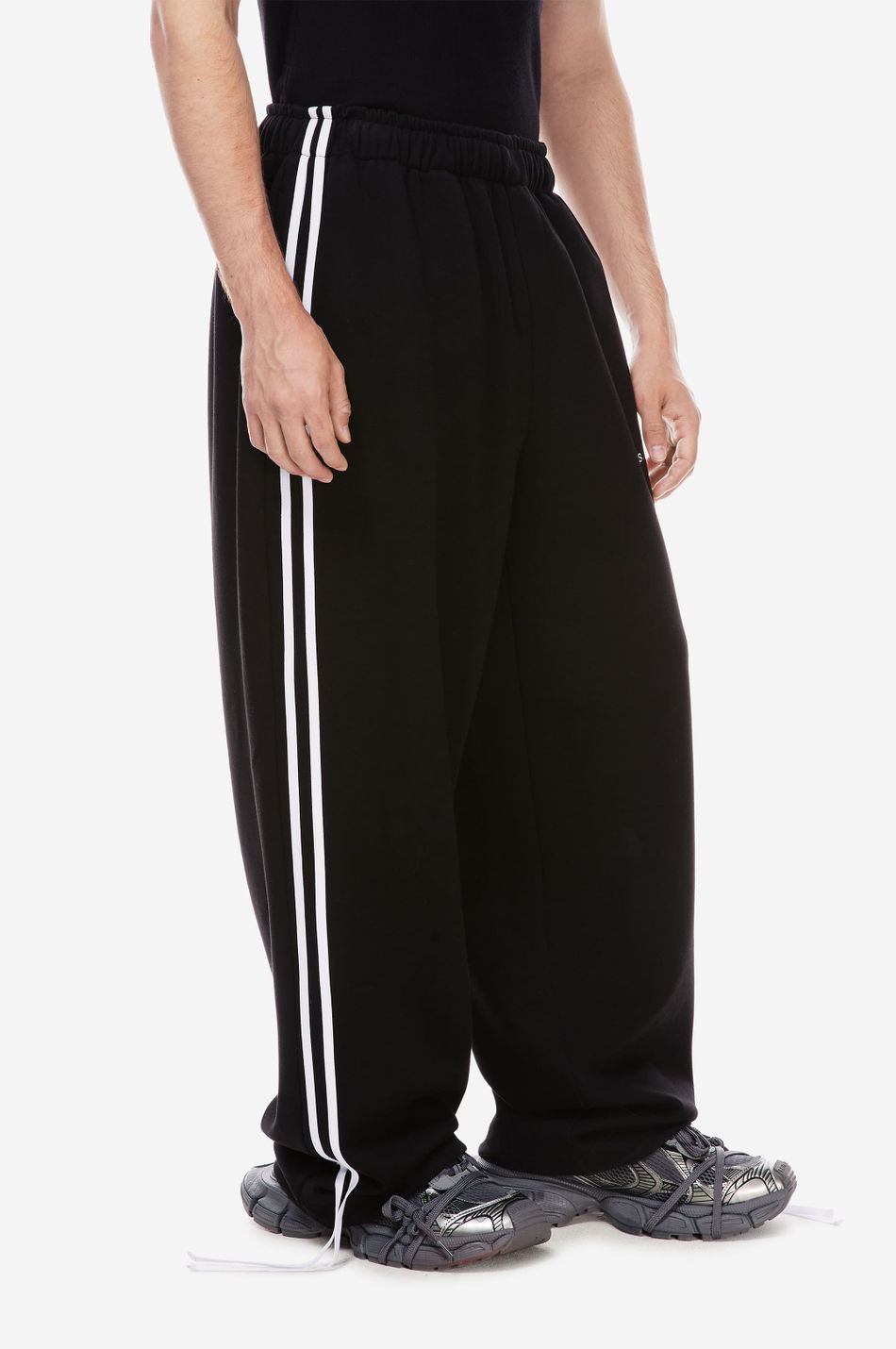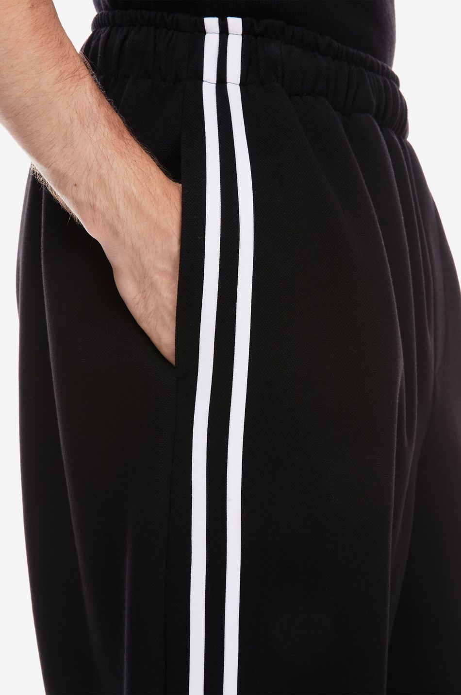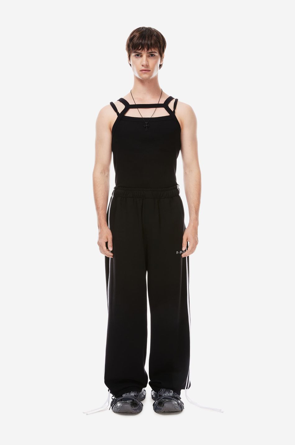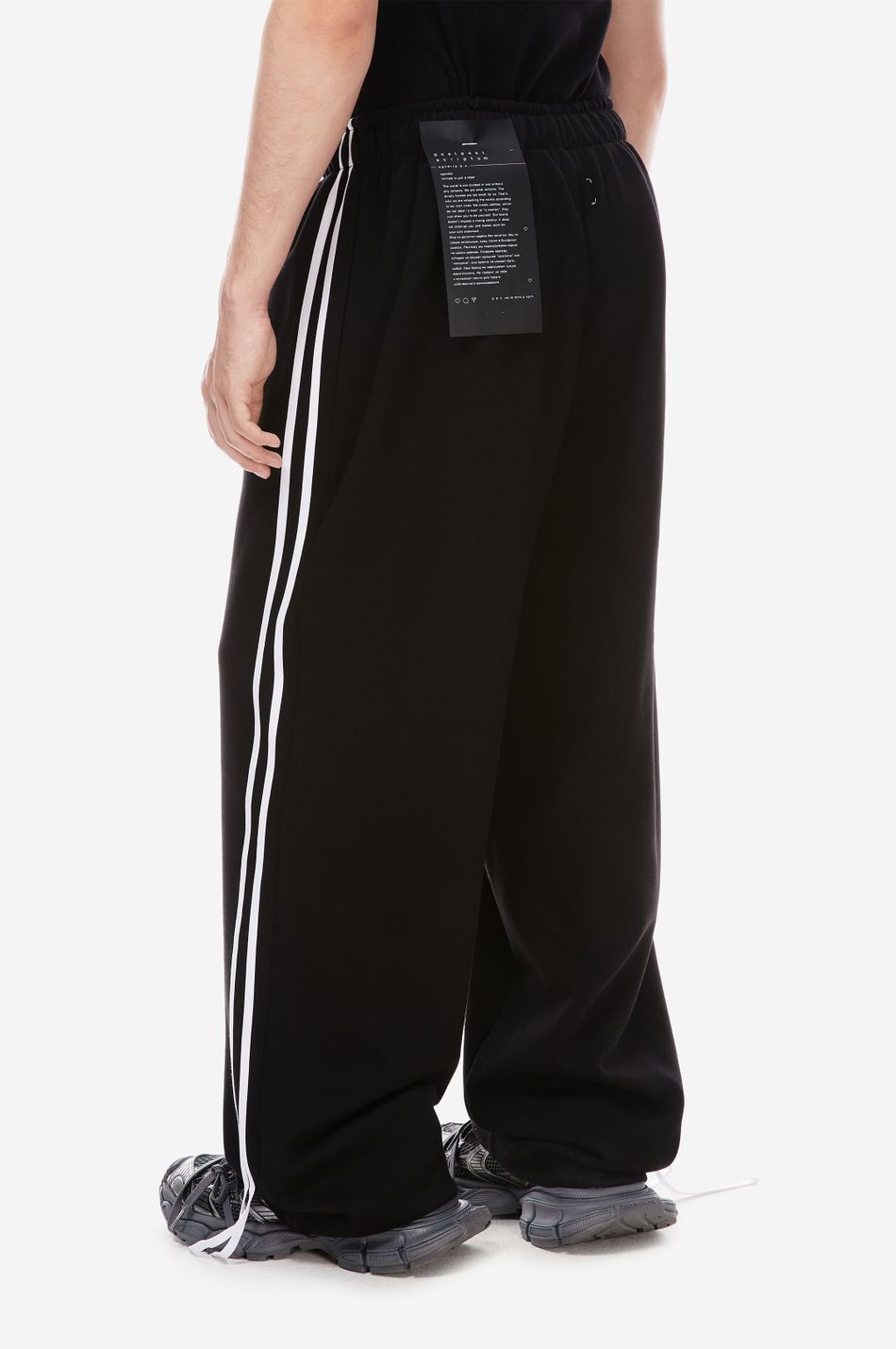 Бестселлер коллекции и один из самых узнаваемых кодов post post scriptum. Трикотажные брюки свободного кроя с контрастными лампасами и декоративными бантами раскрывают стиль глэм-спорта в интерпретации эстетики бренда.
