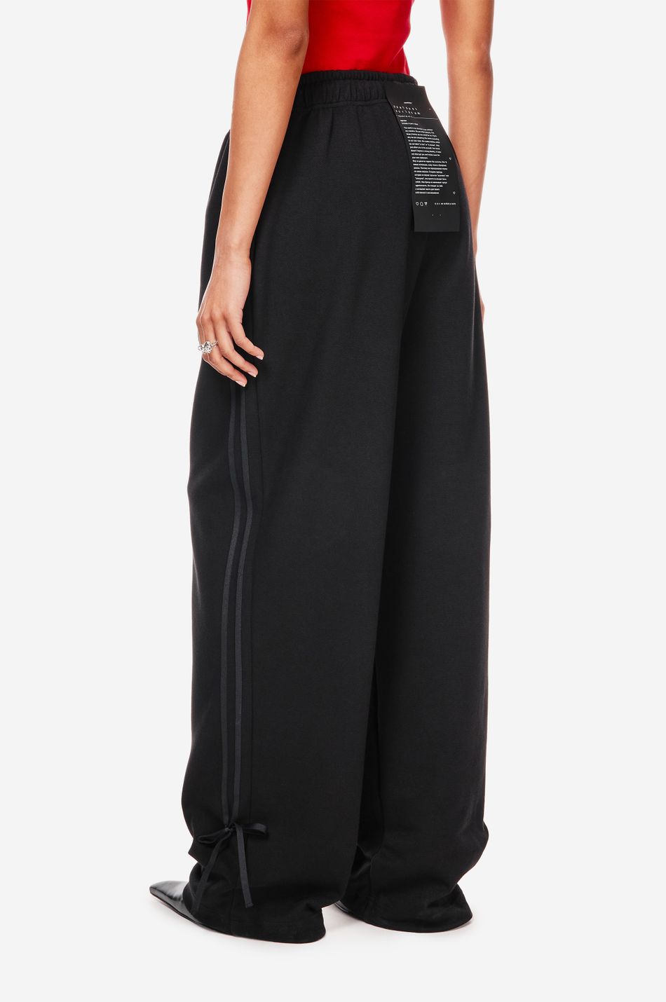 при пошиве брюк свободного кроя с широким эластичным поясом взяли мягкий хлопок. модель объединила в себе спортивные элементы в виде лампасов в тон по бокам и легкую романтичность, которую обеспечили бантики снизу. левую брючину украсили небольшой контрастной вышивкой с логотипом бренда.