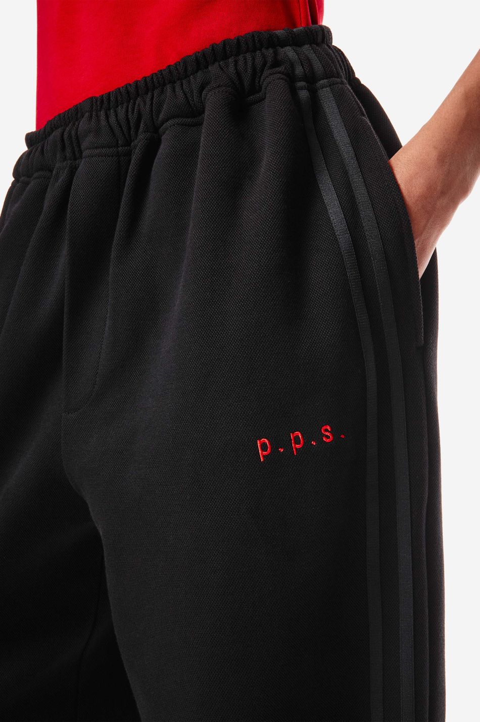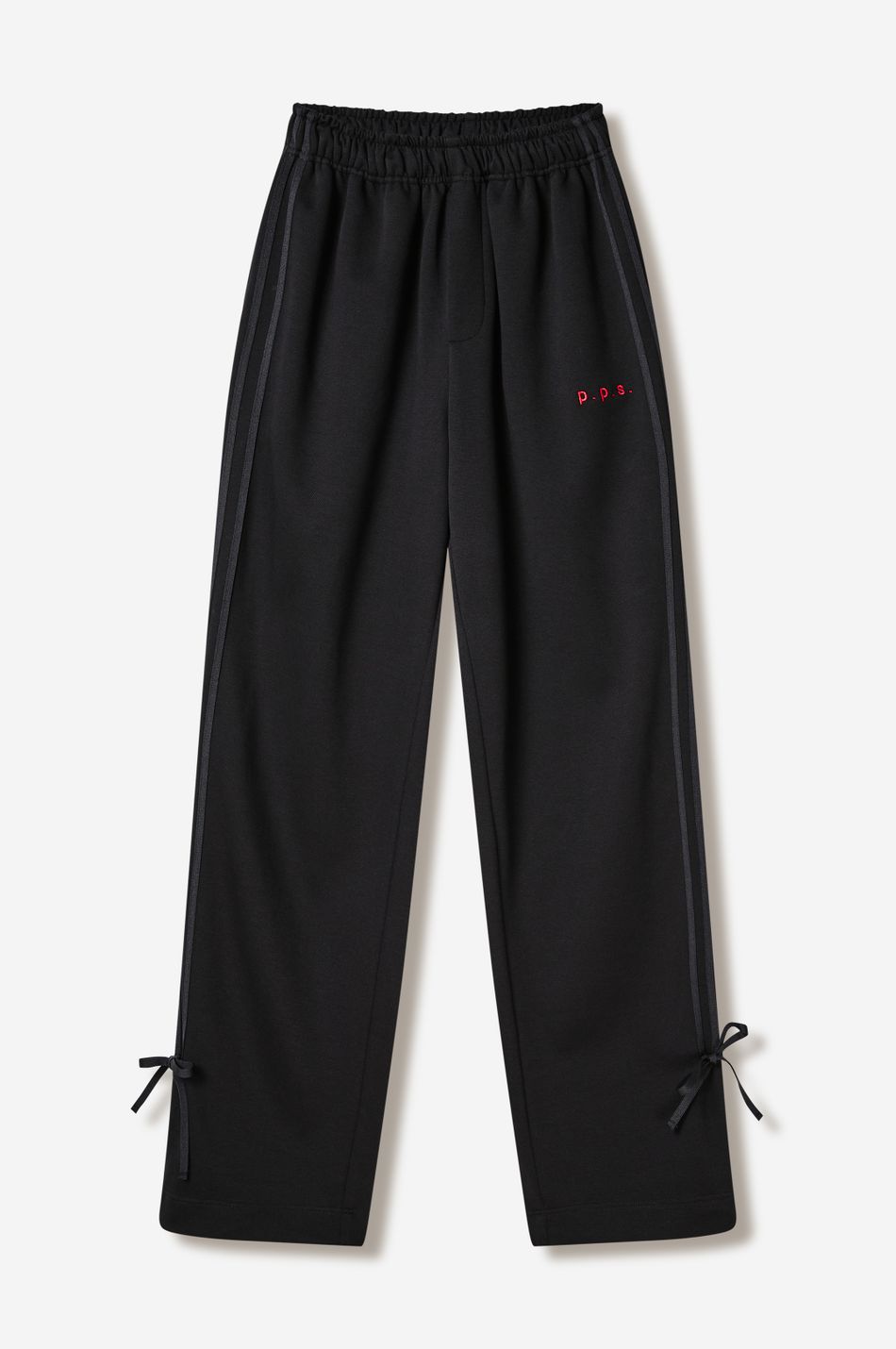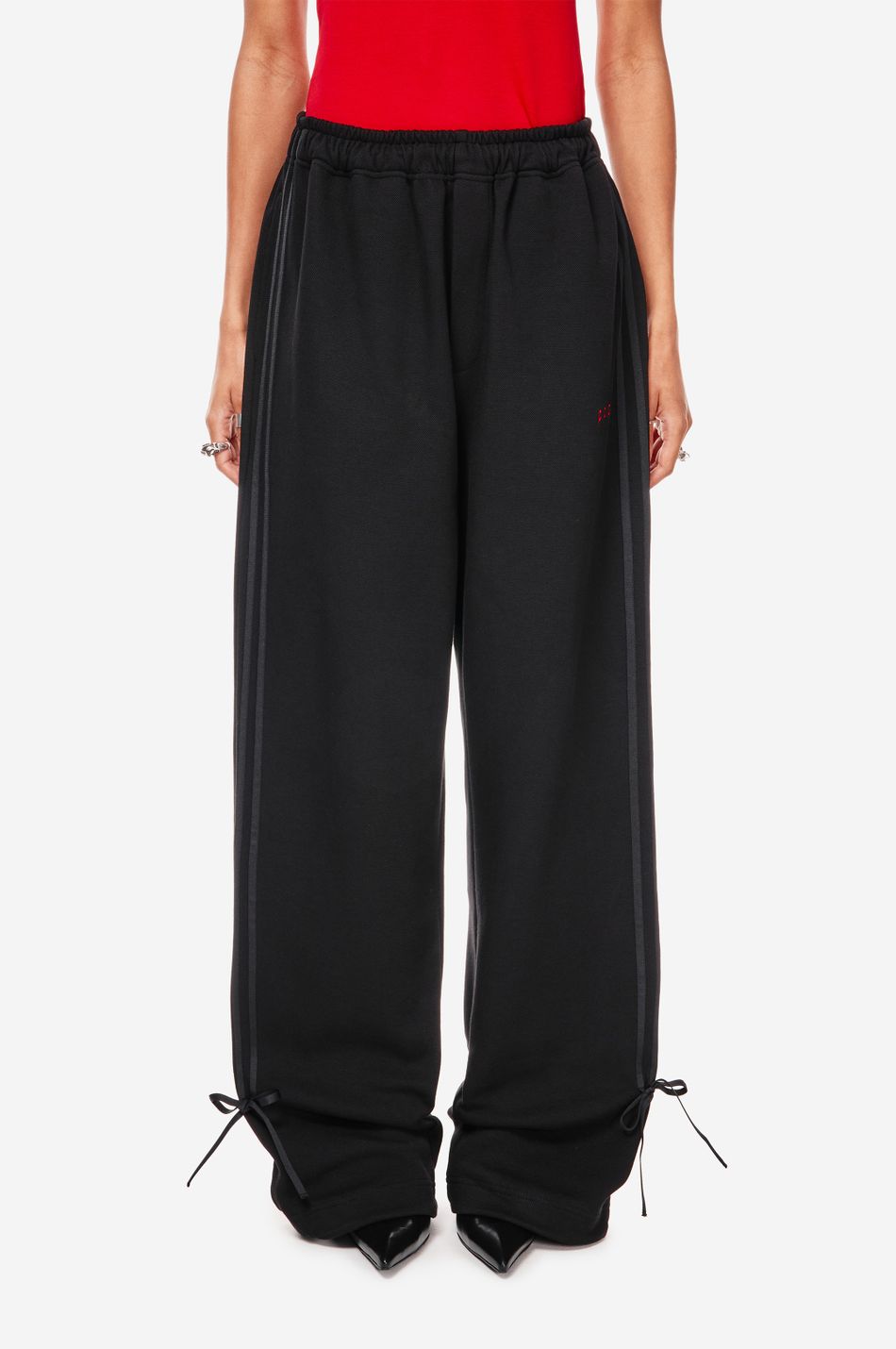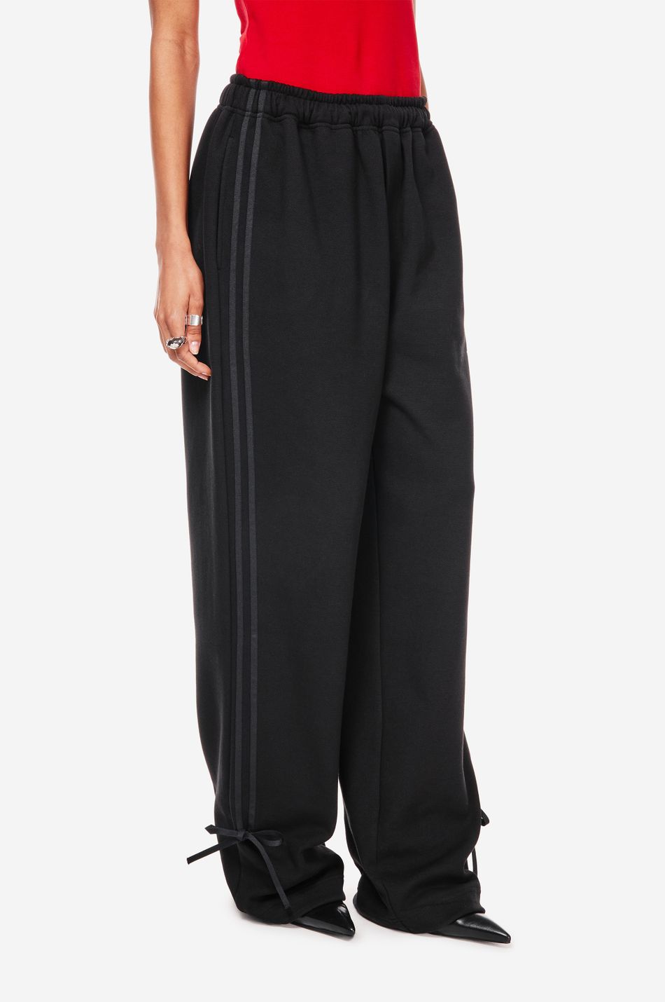 при пошиве брюк свободного кроя с широким эластичным поясом взяли мягкий хлопок. модель объединила в себе спортивные элементы в виде лампасов в тон по бокам и легкую романтичность, которую обеспечили бантики снизу. левую брючину украсили небольшой контрастной вышивкой с логотипом бренда.