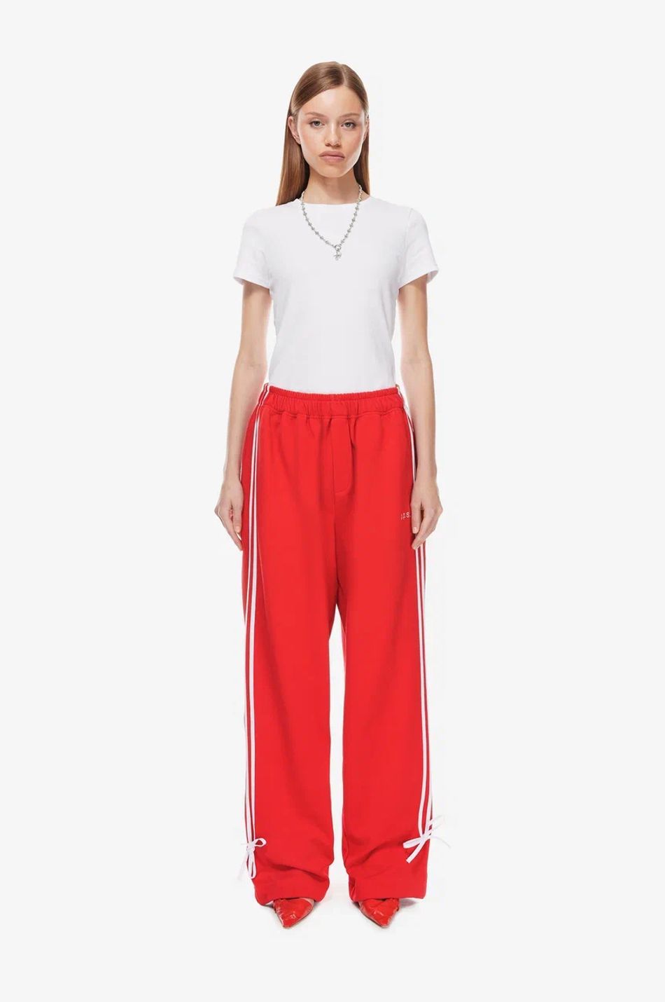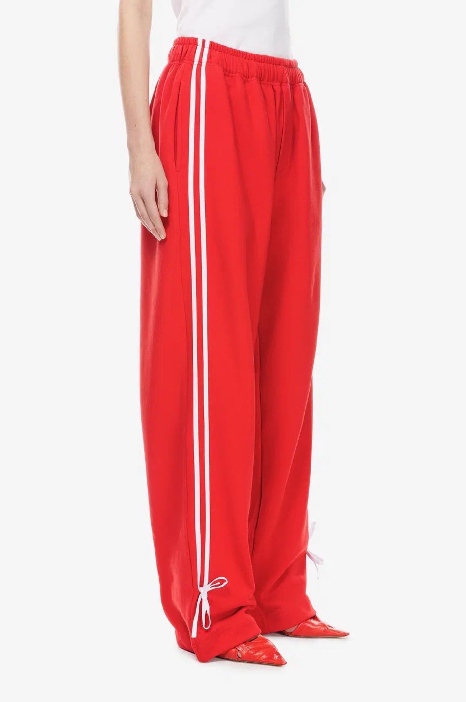 при пошиве брюк свободного кроя с широким эластичным поясом взяли мягкий хлопок. модель объединила в себе спортивные элементы в виде лампасов в тон по бокам и легкую романтичность, которую обеспечили бантики снизу. левую брючину украсили небольшой контрастной вышивкой с логотипом бренда.
