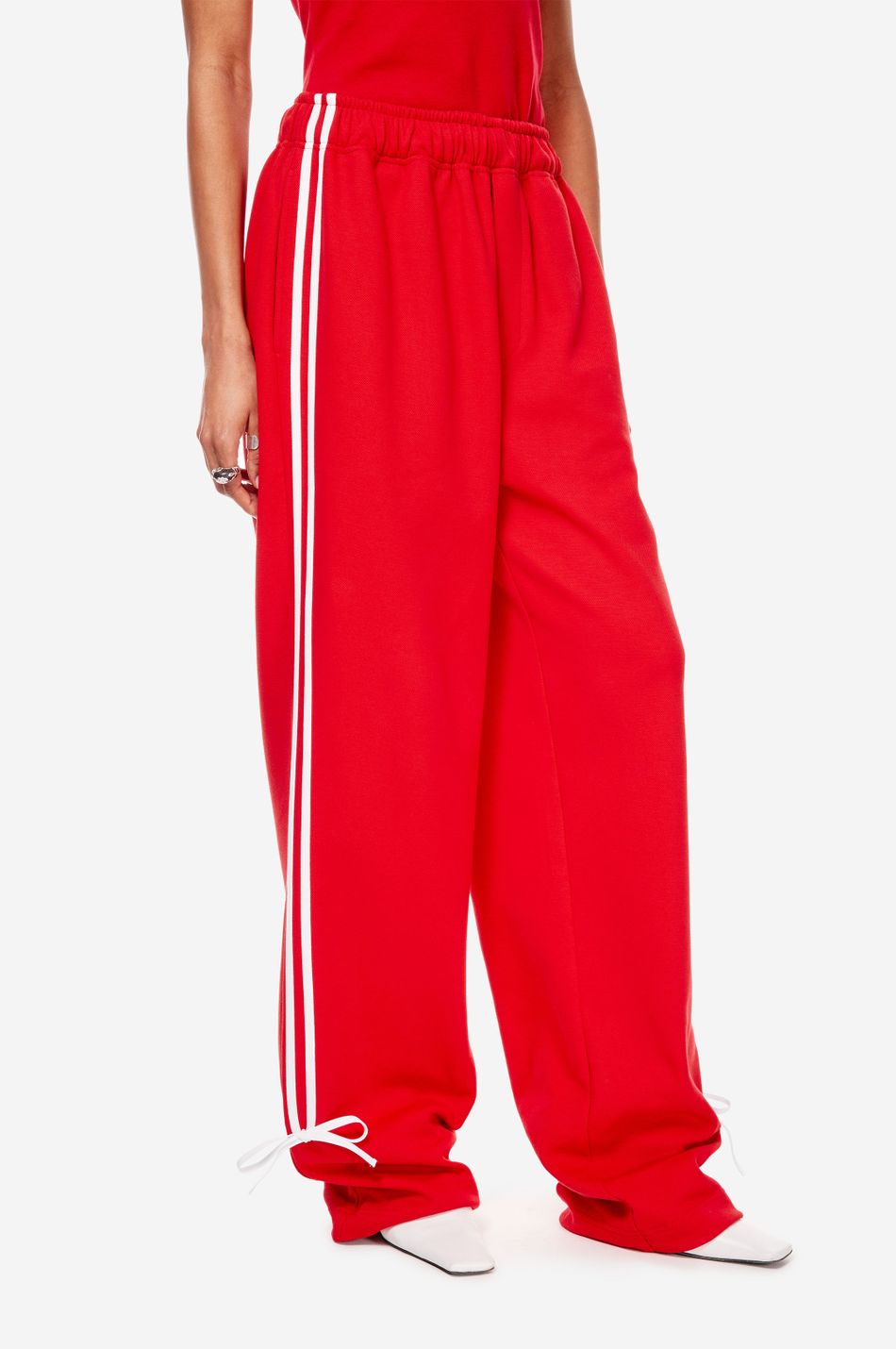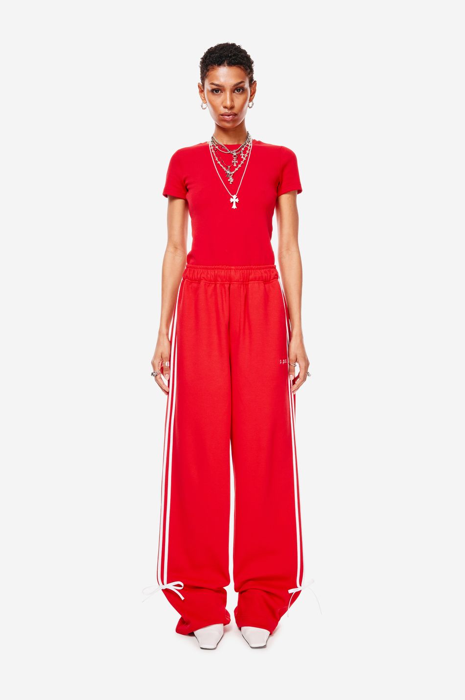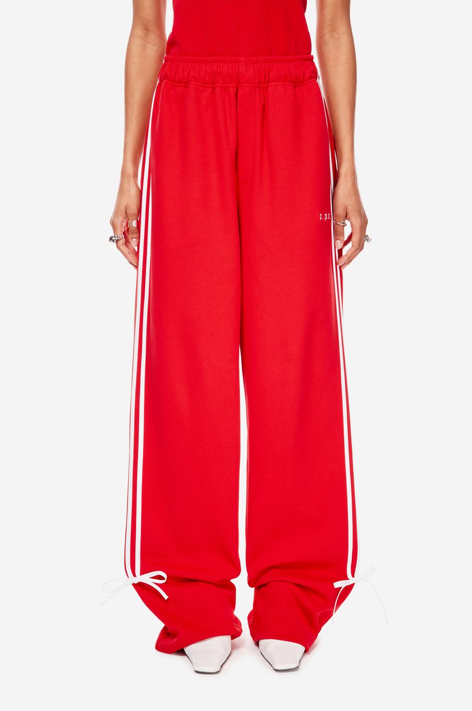 при пошиве брюк свободного кроя с широким эластичным поясом взяли мягкий хлопок. модель объединила в себе спортивные элементы в виде лампасов в тон по бокам и легкую романтичность, которую обеспечили бантики снизу. левую брючину украсили небольшой контрастной вышивкой с логотипом бренда.