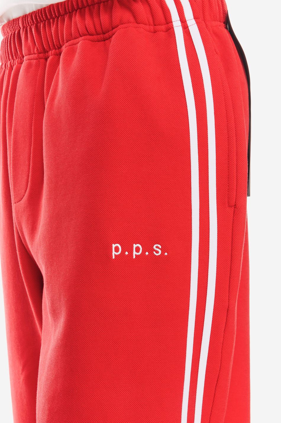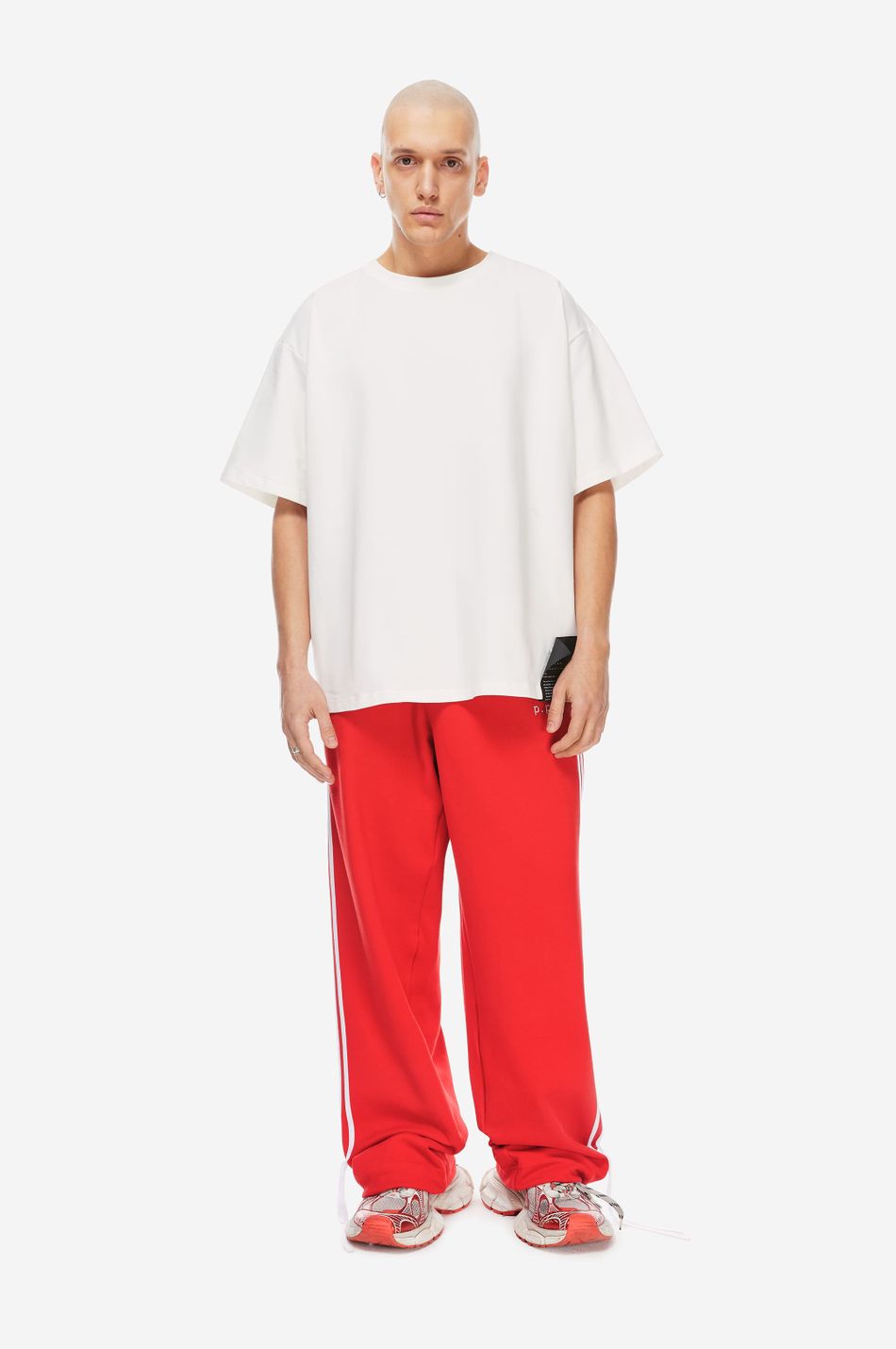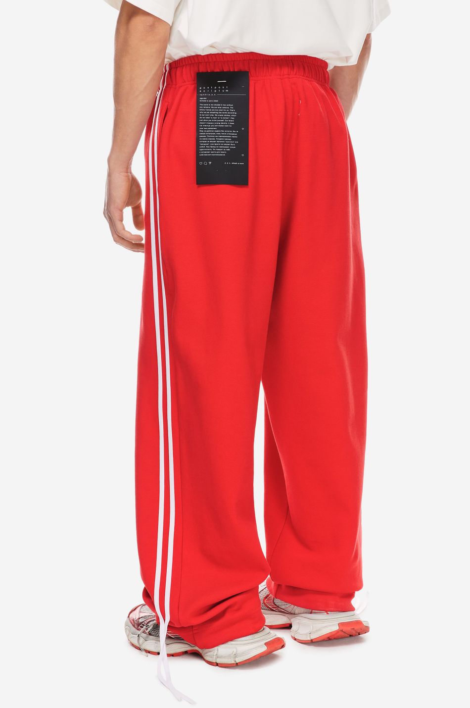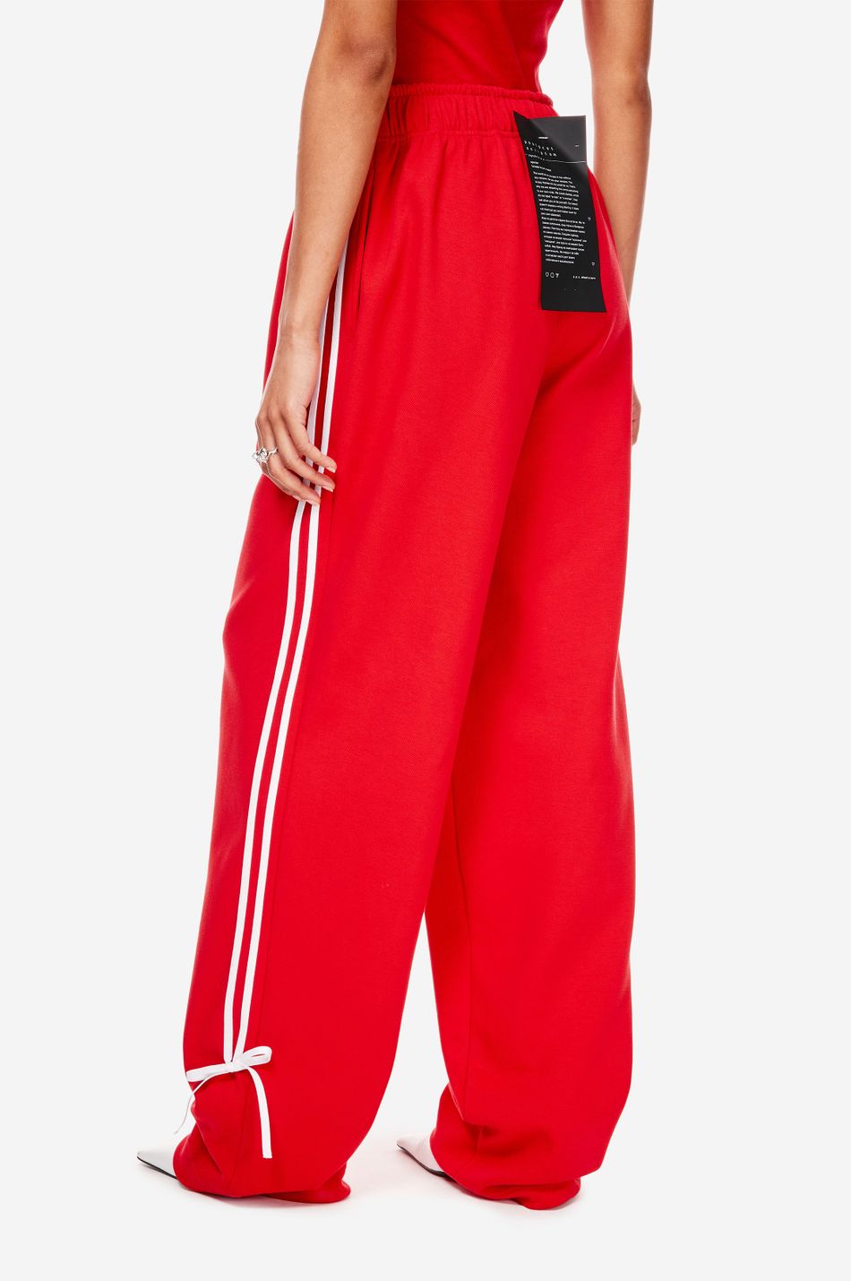при пошиве брюк свободного кроя с широким эластичным поясом взяли мягкий хлопок. модель объединила в себе спортивные элементы в виде лампасов в тон по бокам и легкую романтичность, которую обеспечили бантики снизу. левую брючину украсили небольшой контрастной вышивкой с логотипом бренда.