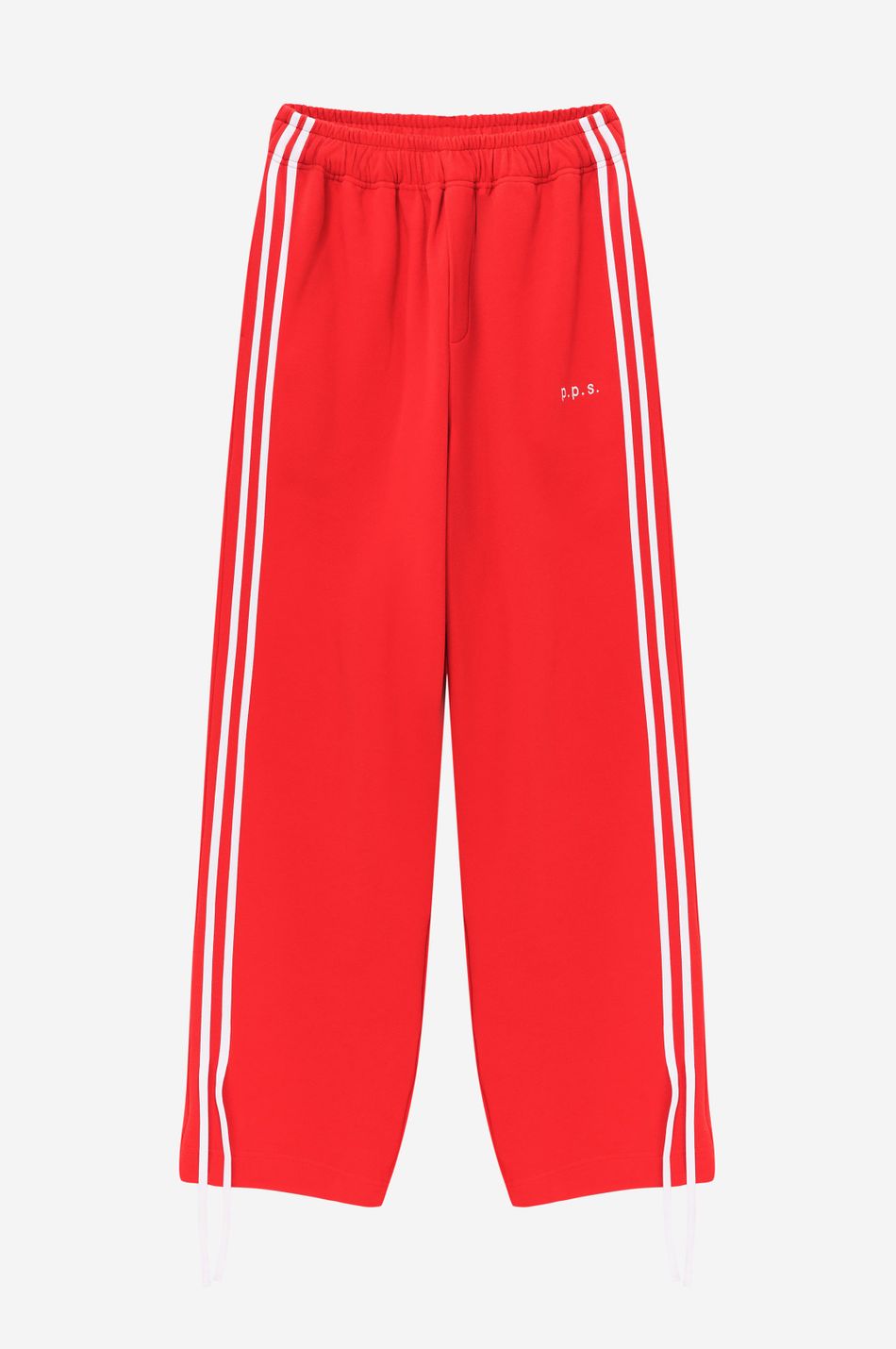 при пошиве брюк свободного кроя с широким эластичным поясом взяли мягкий хлопок. модель объединила в себе спортивные элементы в виде лампасов в тон по бокам и легкую романтичность, которую обеспечили бантики снизу. левую брючину украсили небольшой контрастной вышивкой с логотипом бренда.