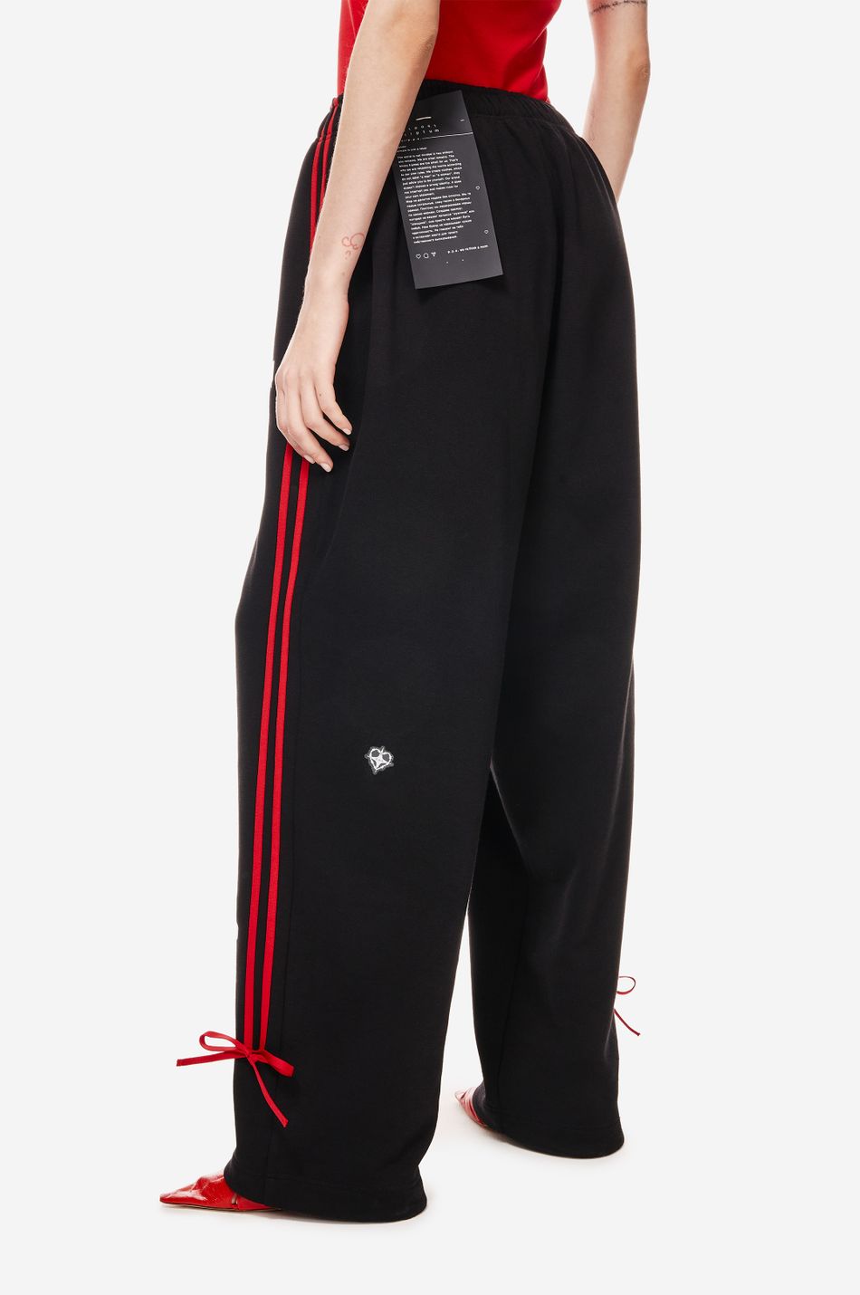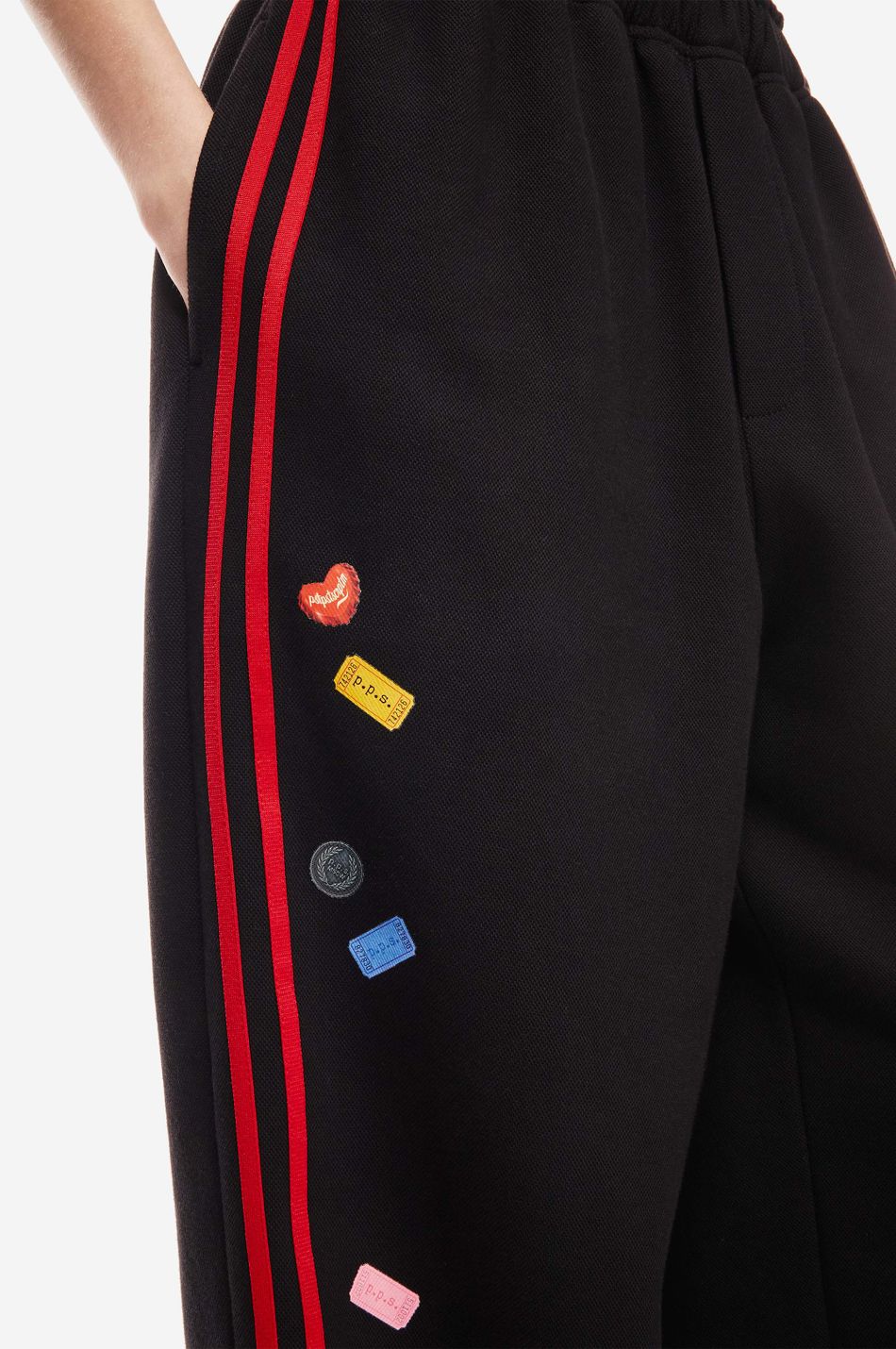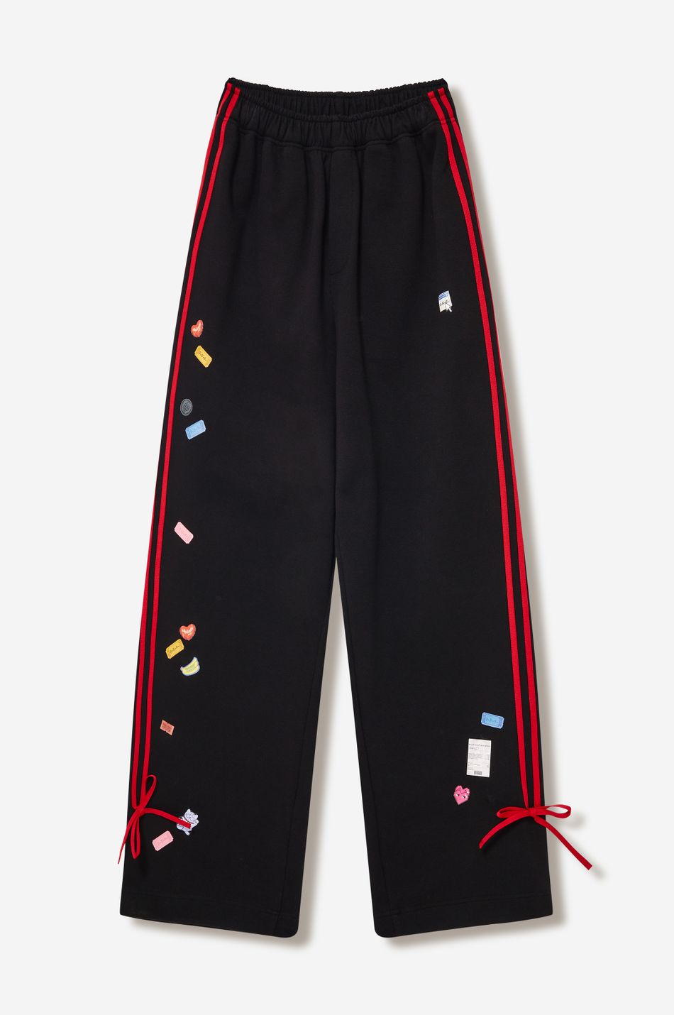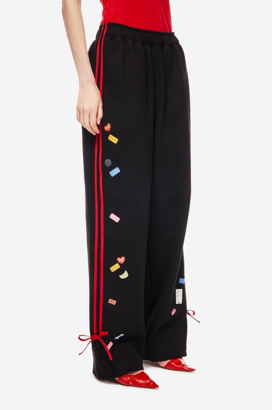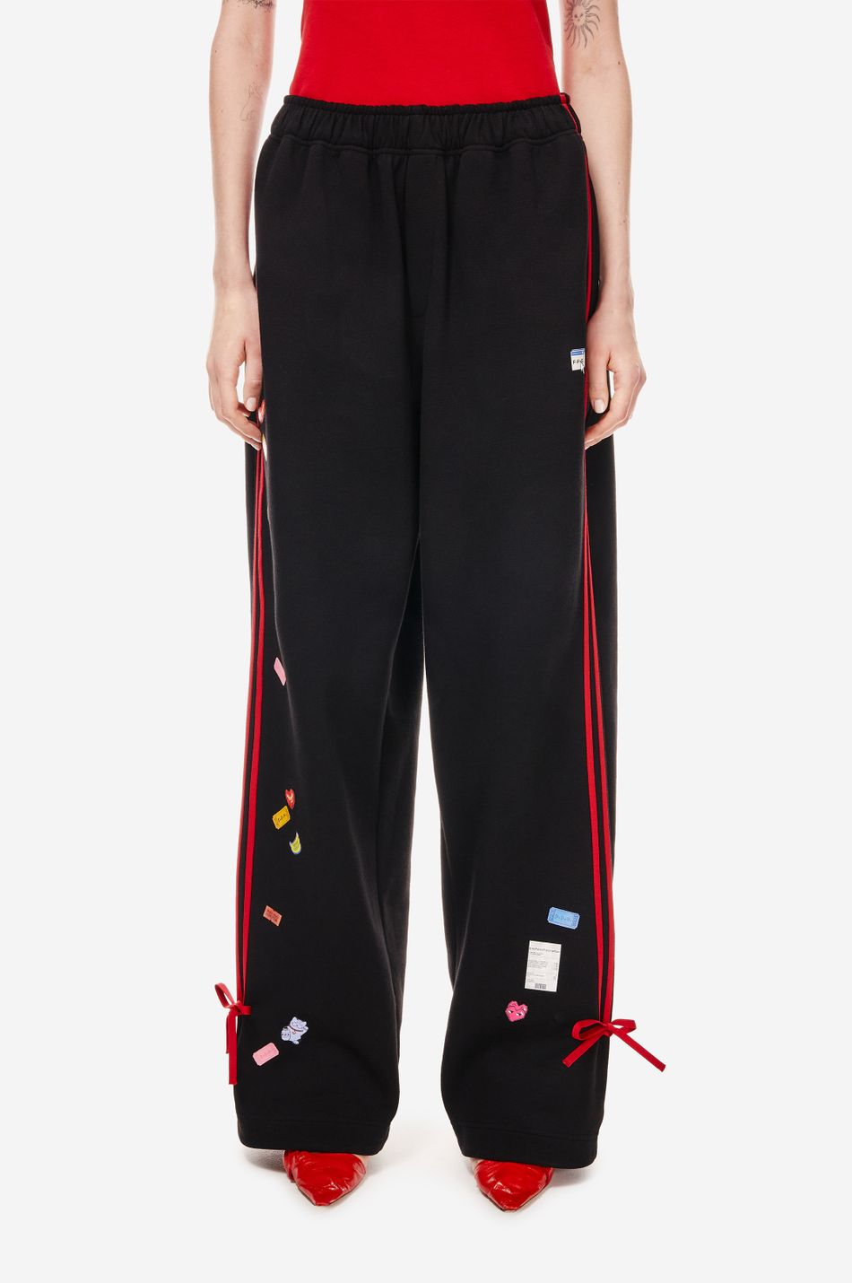 при пошиве брюк свободного кроя с широким эластичным поясом взяли мягкий хлопок. модель объединила в себе спортивные элементы в виде лампасов в тон по бокам и легкую романтичность, которую обеспечили бантики снизу. левую брючину украсили небольшой контрастной вышивкой с логотипом бренда.