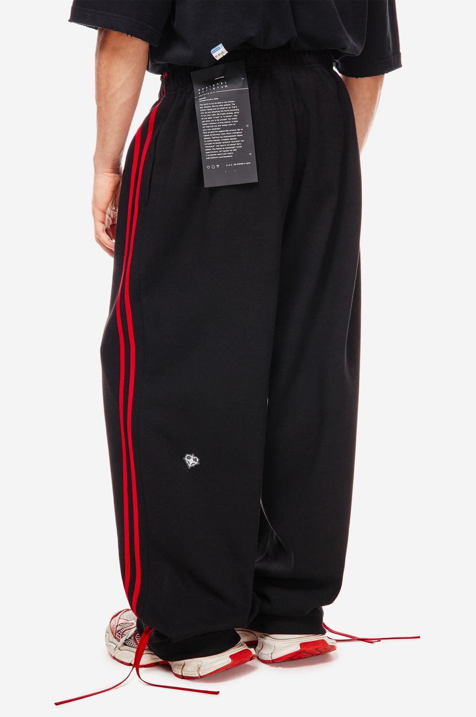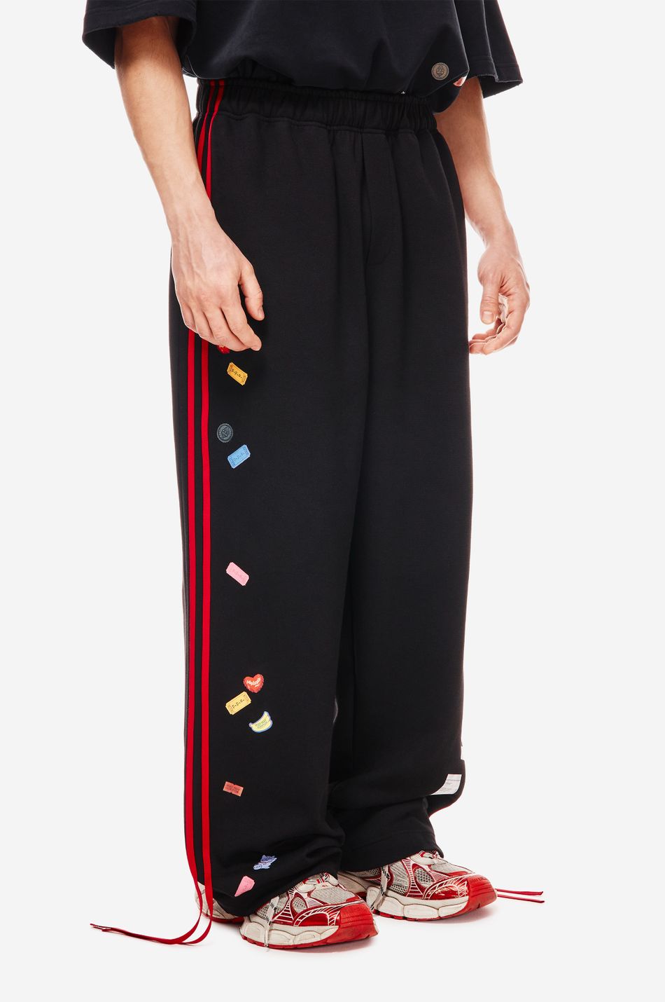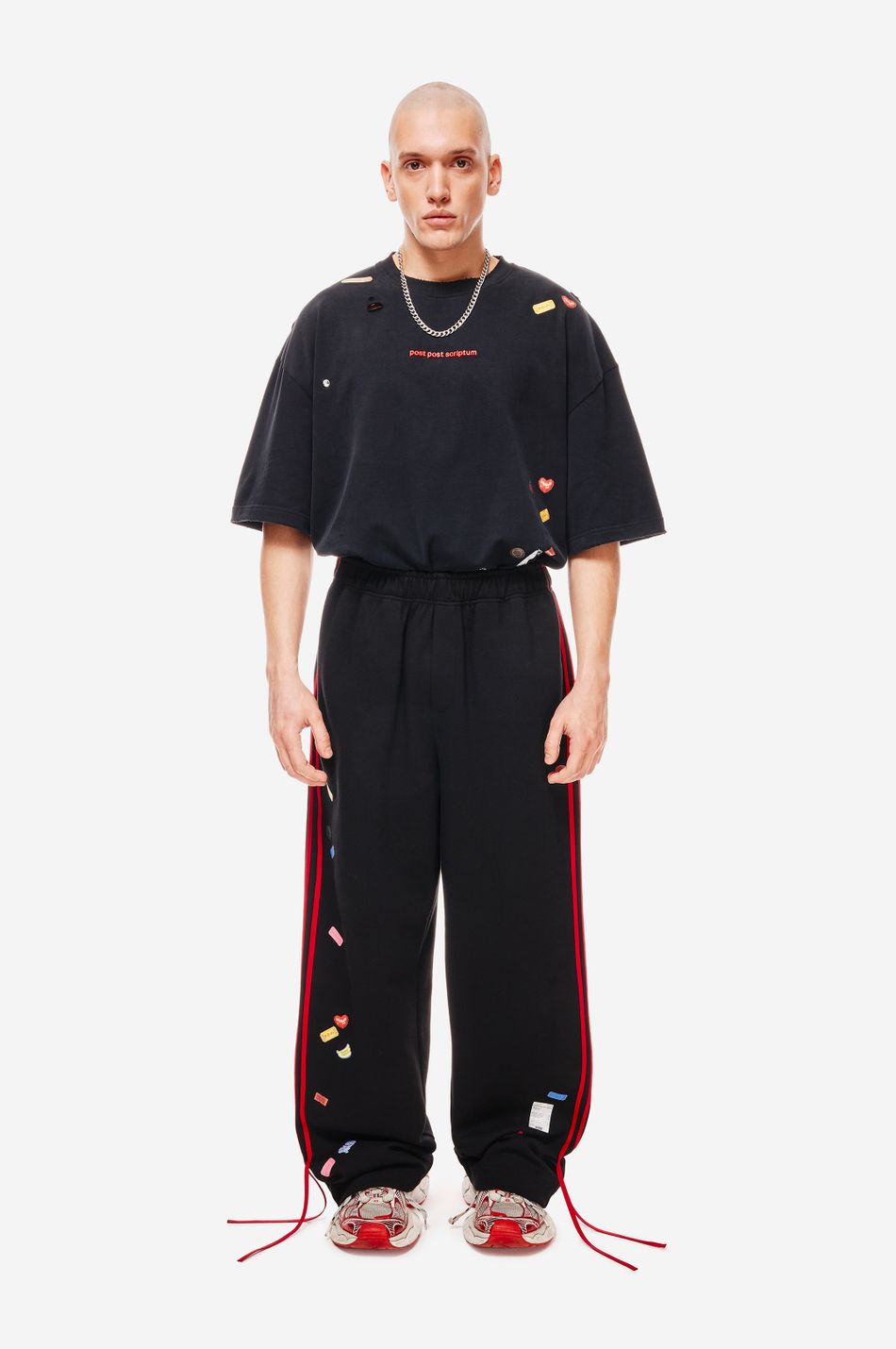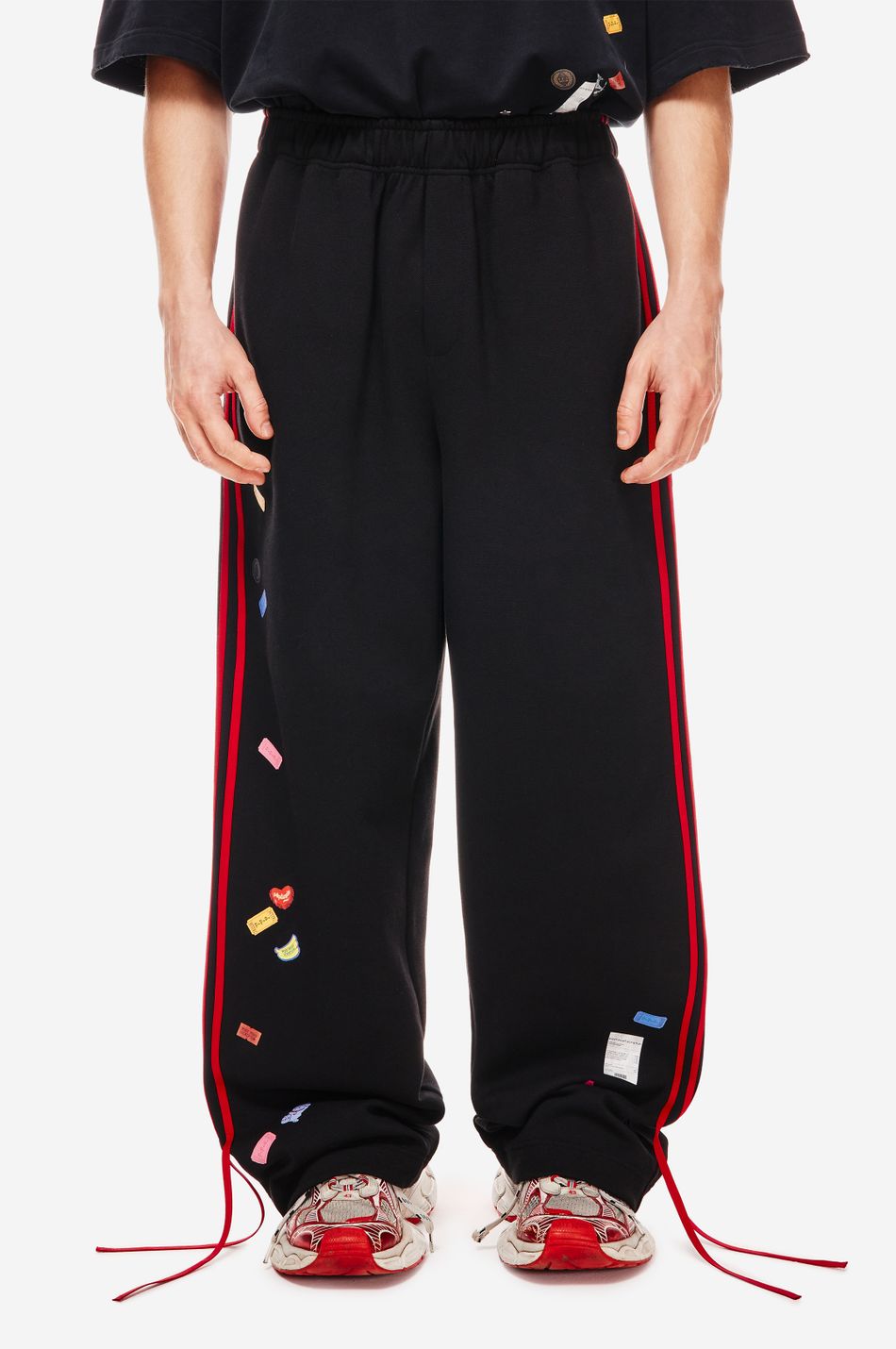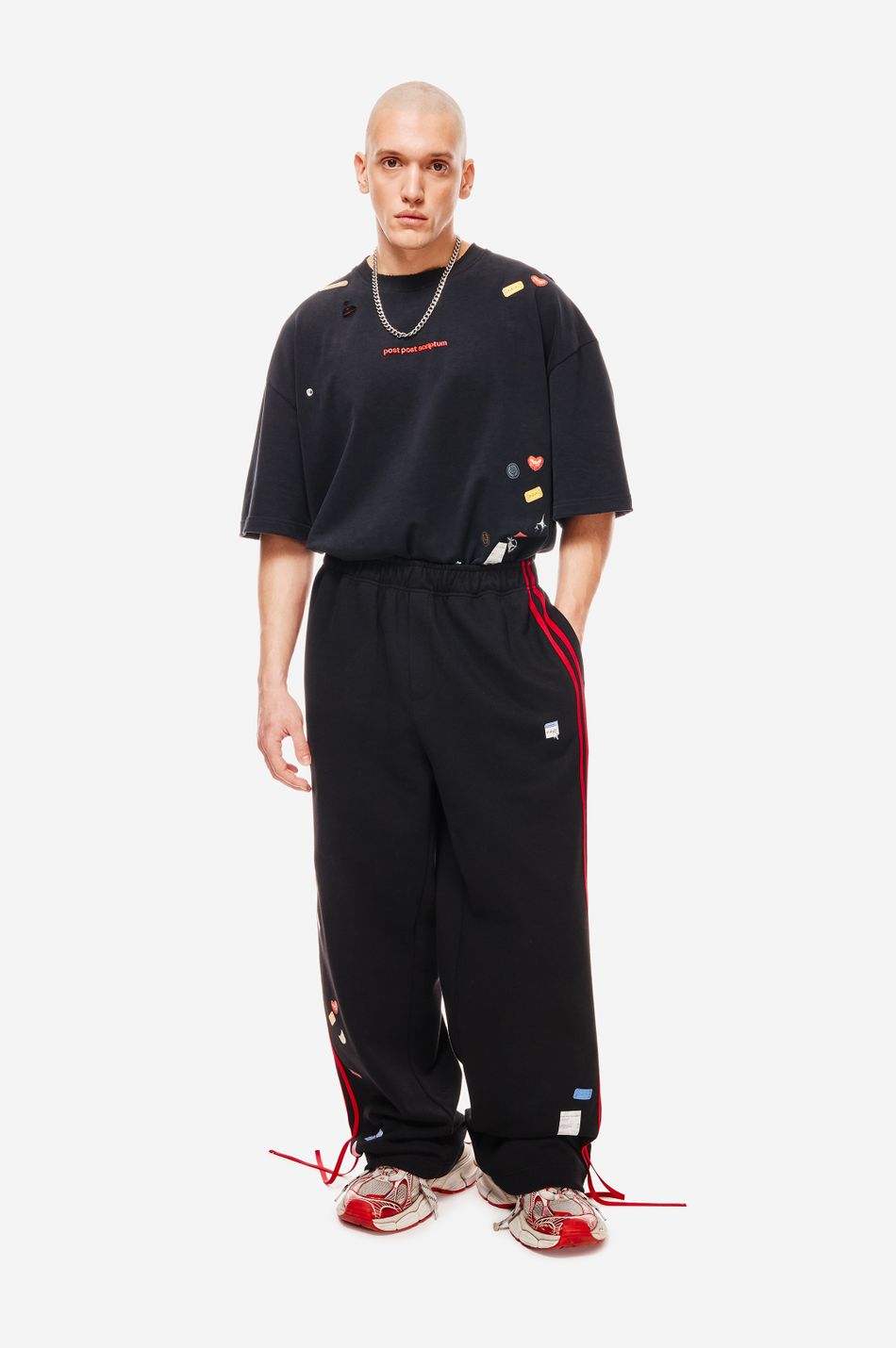 при пошиве брюк свободного кроя с широким эластичным поясом взяли мягкий хлопок. модель объединила в себе спортивные элементы в виде лампасов в тон по бокам и легкую романтичность, которую обеспечили бантики снизу. левую брючину украсили небольшой контрастной вышивкой с логотипом бренда.