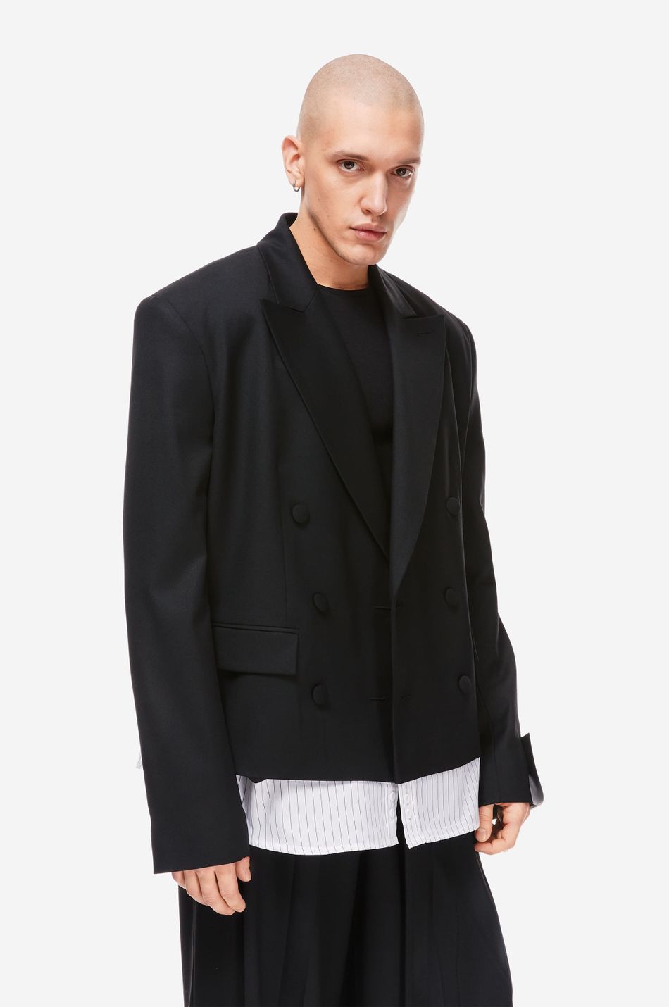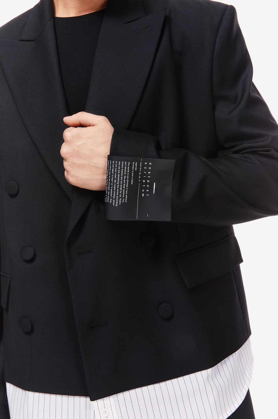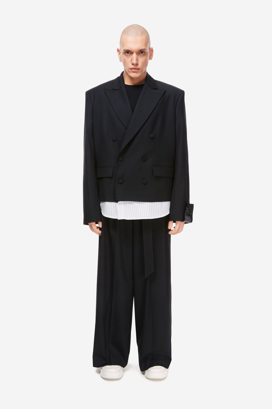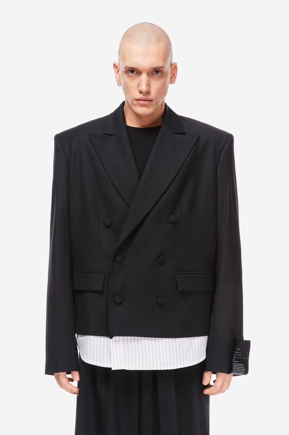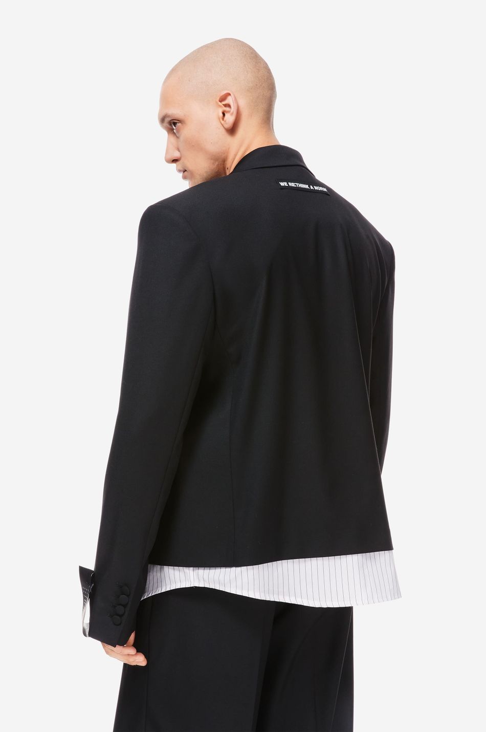 Двубортный жакет прямого кроя с декоративной вставкой в виде нижнего края рубашки — визуальный приём, создающий стильный, многослойный образ. Выполнен из плотной костюмной ткани с добавлением eco-переработанных recycle волокон. Обтянутые тканью пуговицы, широкие лацканы и фирменный патч-манифест на рукаве подчёркивают эстетику бренда. Сочетайте с широкими брюками из новой коллекции.