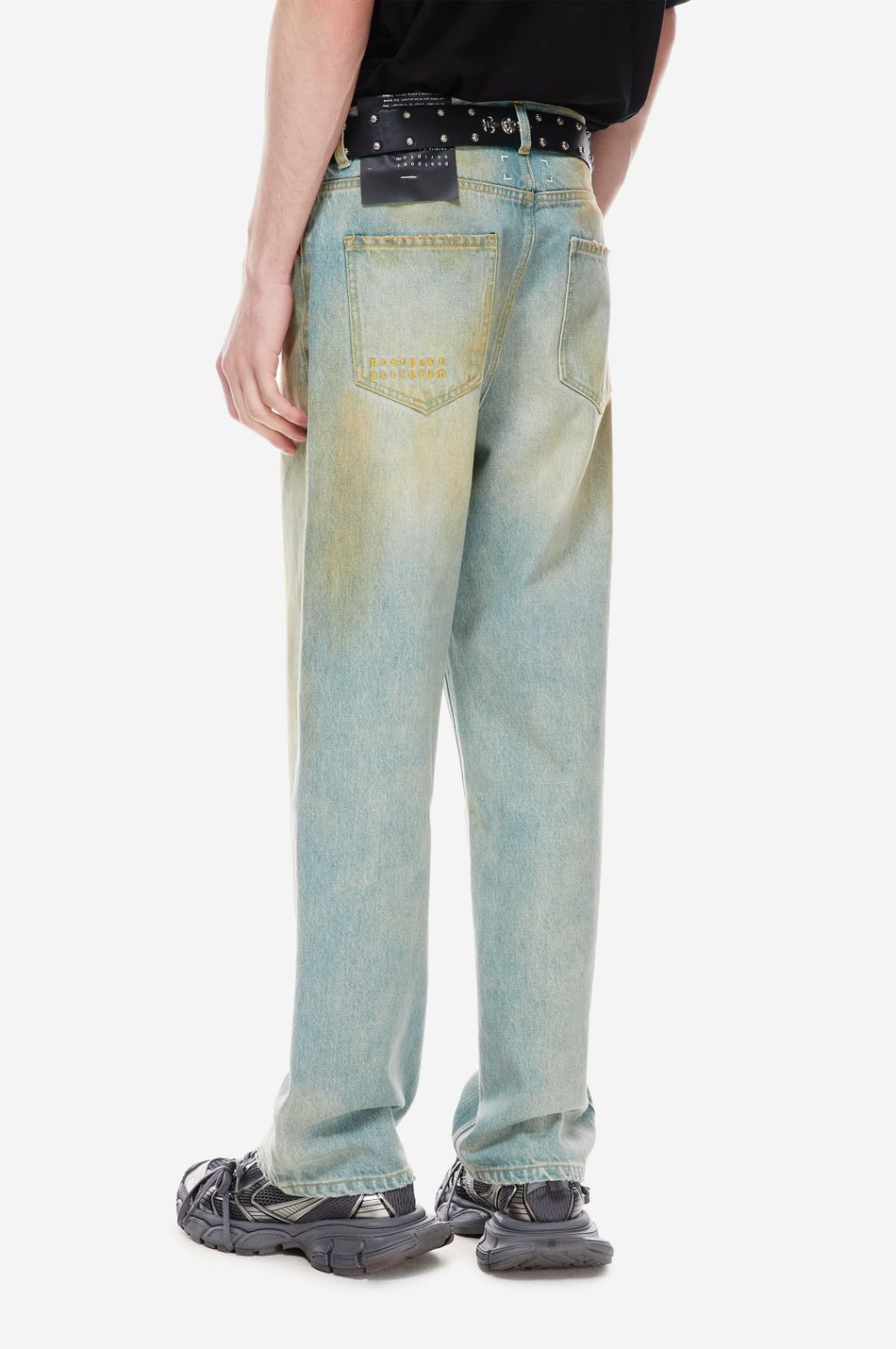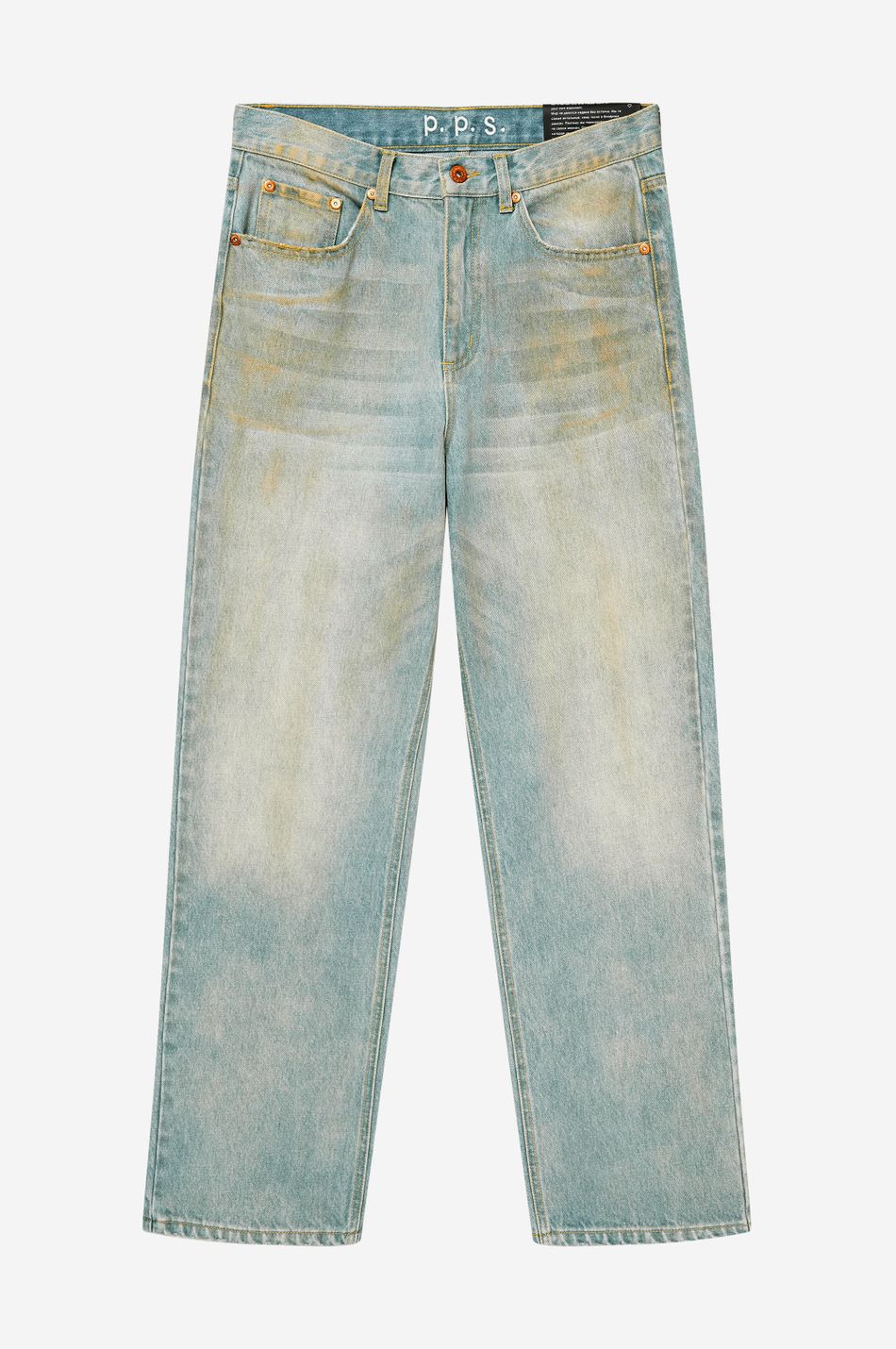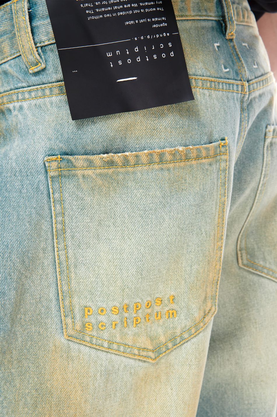 Джинсы свободного кроя со средней посадкой (Relaxed fit) выполнены из плотного денима с интенсивной стиркой для создания винтажного эффекта потертости. Необработанные края карманов и бронзовая фурнитура с гравировкой. Фирменная вышивка на заднем кармане post post scriptum и патч-манифест подчёркивают эстетику бренда. Сочетайте с футболками, топами из новой коллекции.