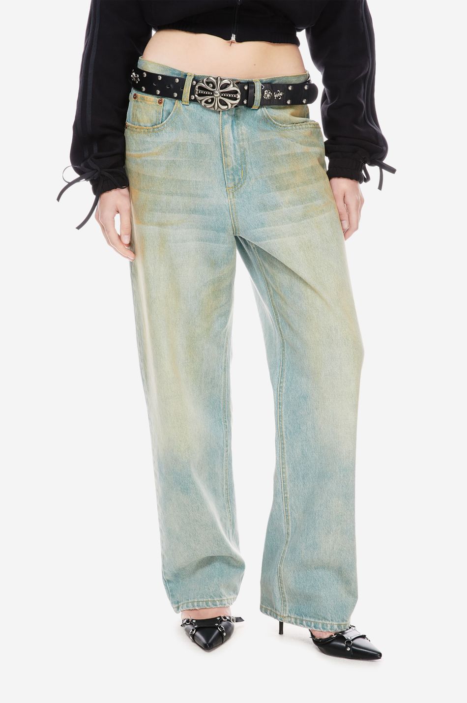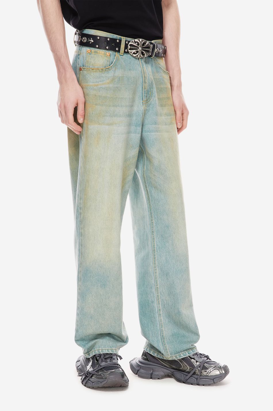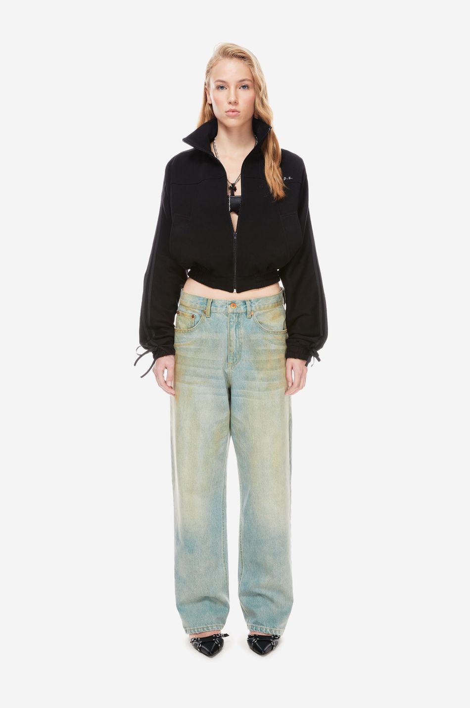 Джинсы свободного кроя со средней посадкой (Relaxed fit) выполнены из плотного денима с интенсивной стиркой для создания винтажного эффекта потертости. Необработанные края карманов и бронзовая фурнитура с гравировкой. Фирменная вышивка на заднем кармане post post scriptum и патч-манифест подчёркивают эстетику бренда. Сочетайте с футболками, топами из новой коллекции.