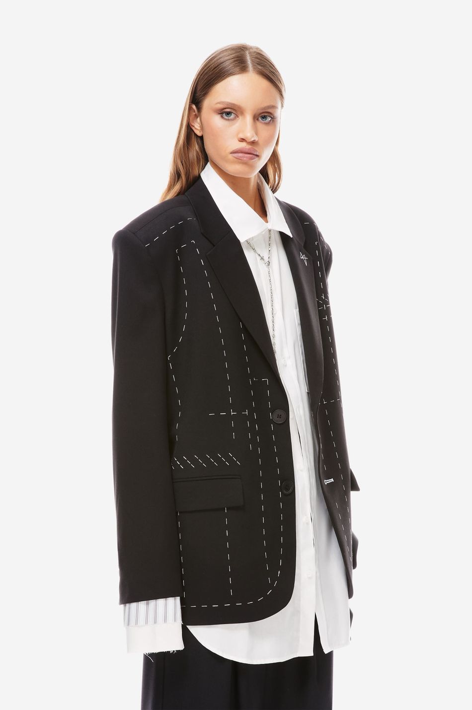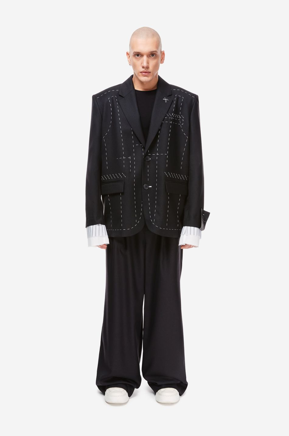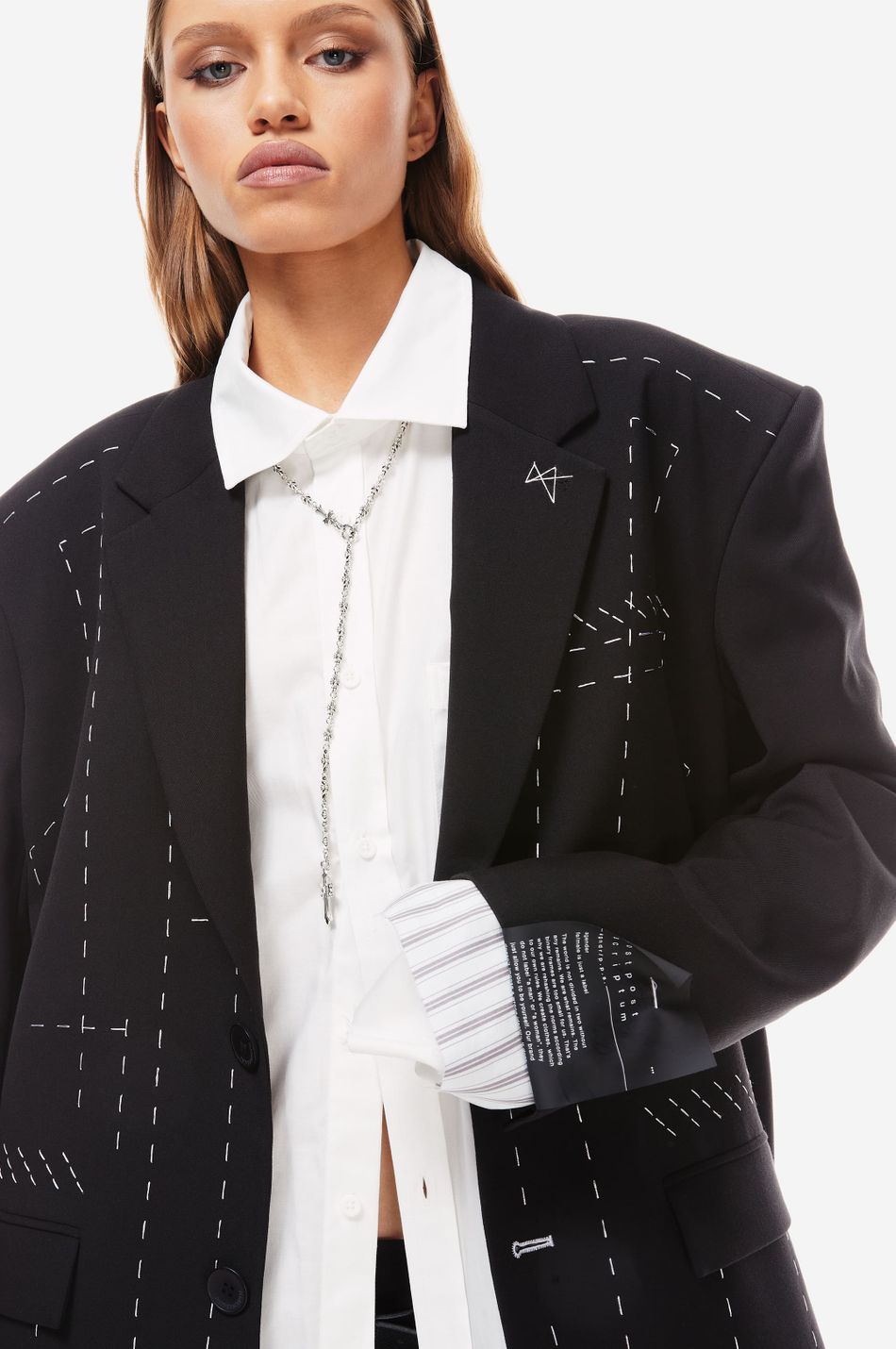 однобортный чёрный пиджак силуэта oversize, словно позаимствованный из мужского гардероба, с контрастной вышивкой в виде лекального стежка, выполненному по ручному эскизу. широкая спущенная линия плеч, карманы с клапанами и двойные комбинированные манжеты с необработанным краем. плотная костюмная ткань держит форму и движется вместе с телом. сочетайте с брюками с двойным поясом из новой коллекции.