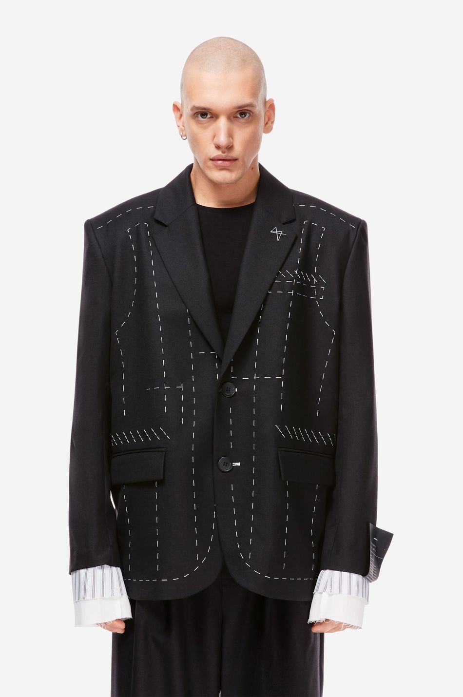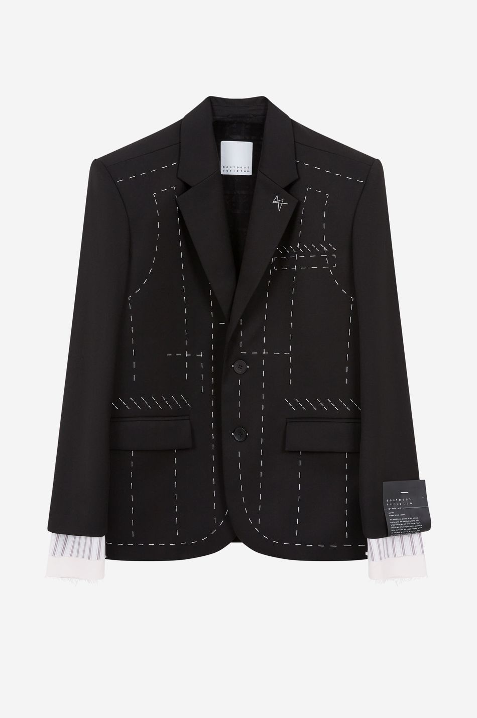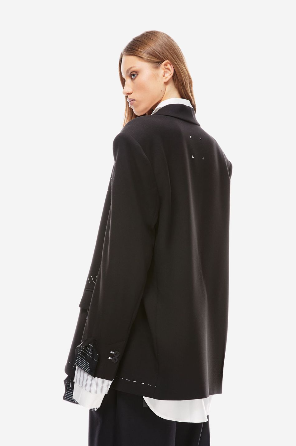 однобортный чёрный пиджак силуэта oversize, словно позаимствованный из мужского гардероба, с контрастной вышивкой в виде лекального стежка, выполненному по ручному эскизу. широкая спущенная линия плеч, карманы с клапанами и двойные комбинированные манжеты с необработанным краем. плотная костюмная ткань держит форму и движется вместе с телом. сочетайте с брюками с двойным поясом из новой коллекции.