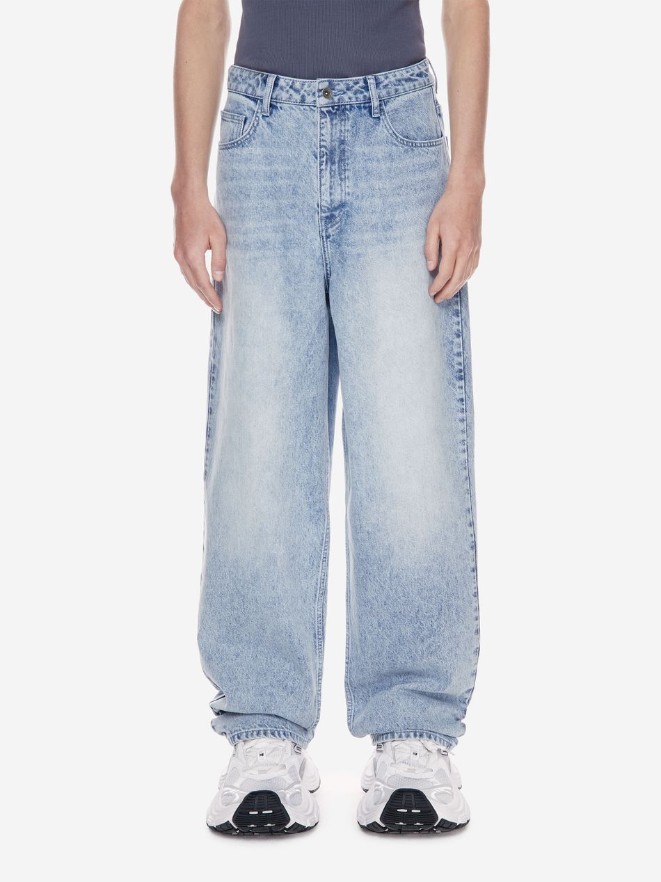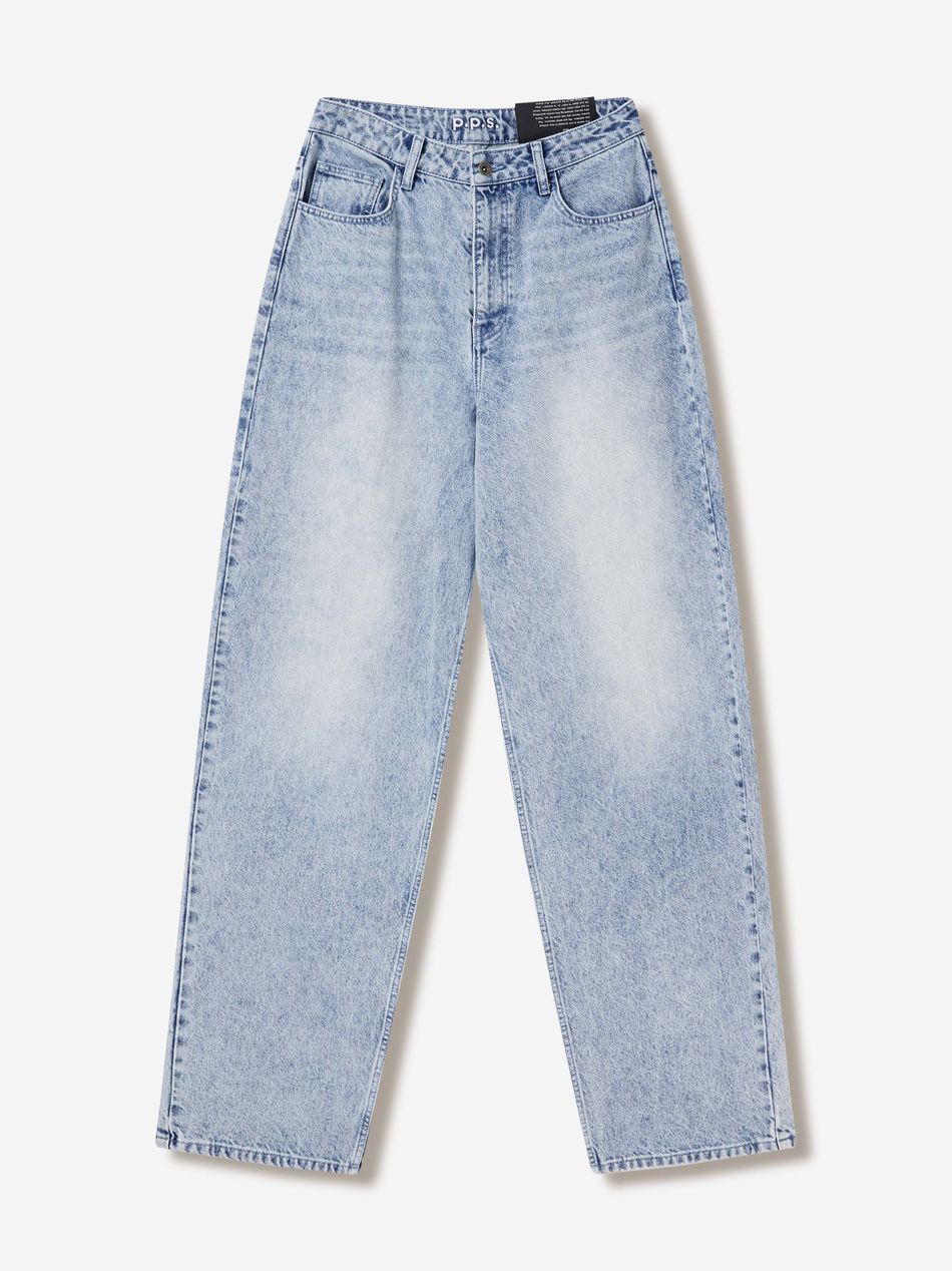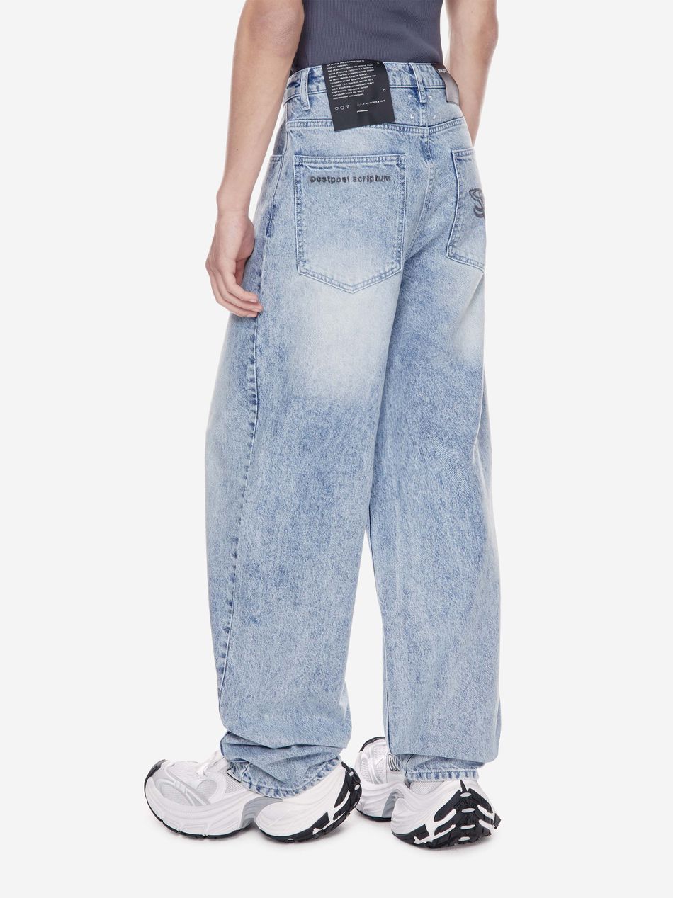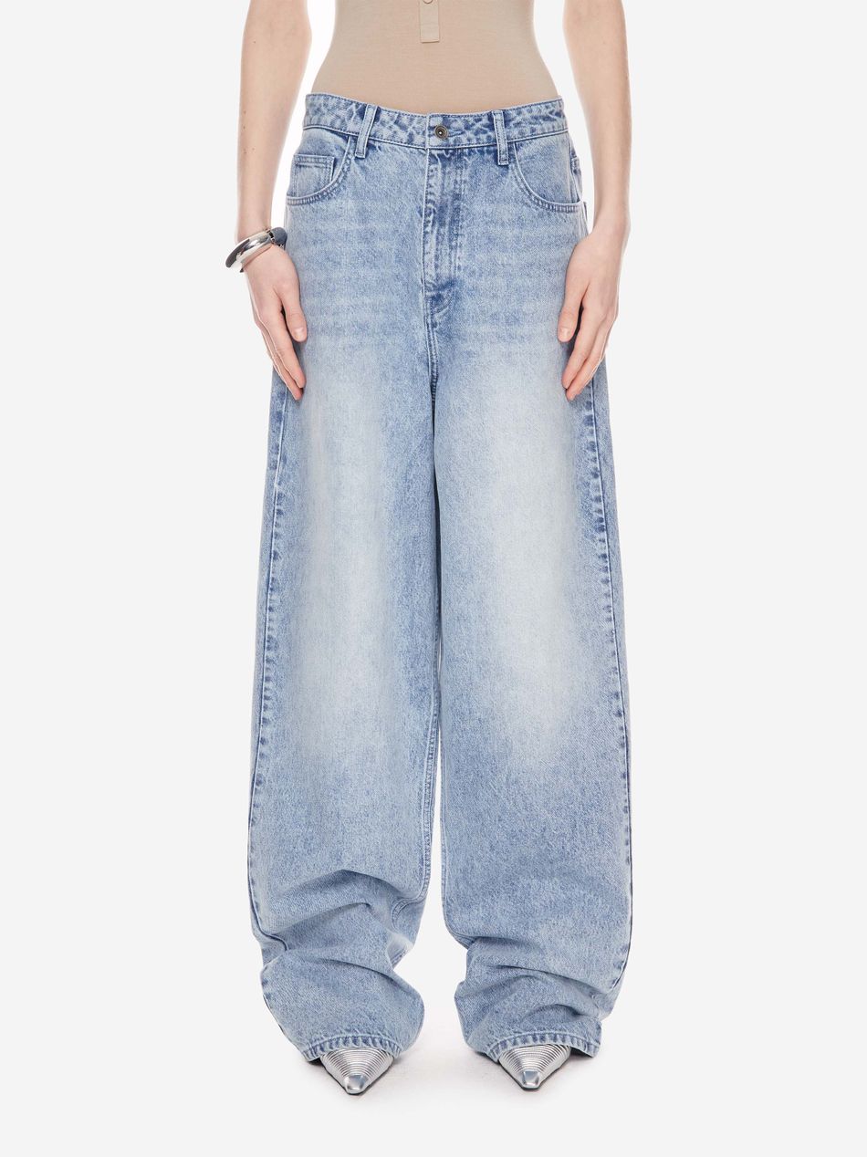 Широкие джинсы из плотного денима с винтажной обработкой, подчёркивающей глубину цвета и характер изделия.