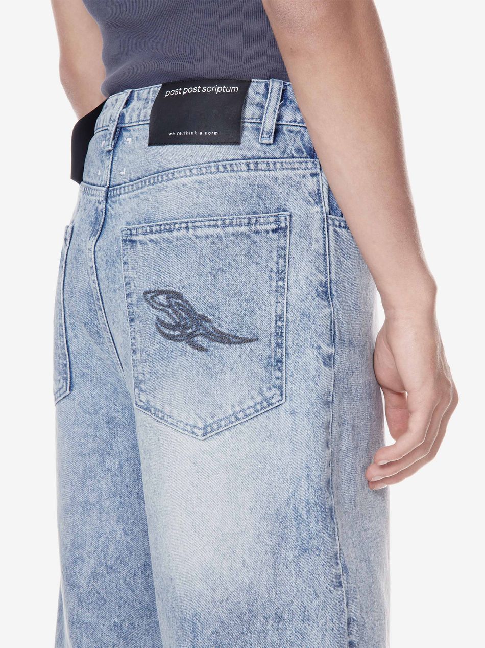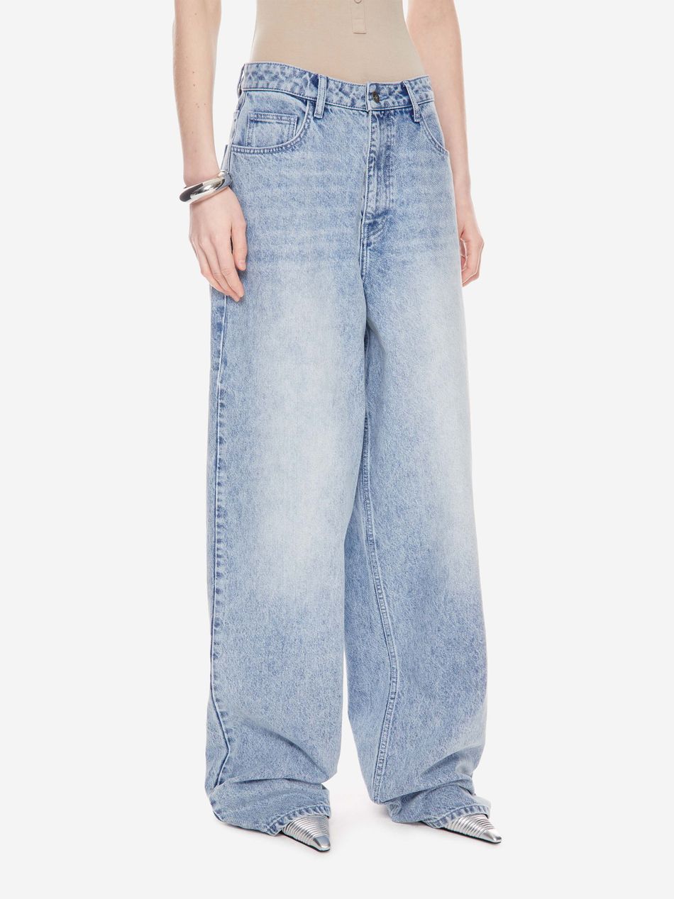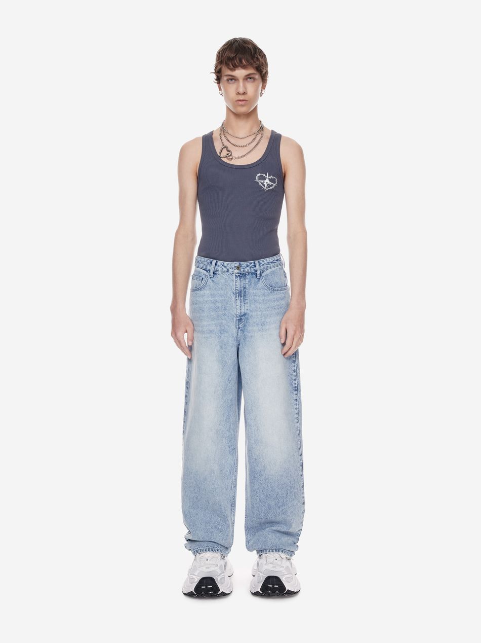 Широкие джинсы из плотного денима с винтажной обработкой, подчёркивающей глубину цвета и характер изделия.