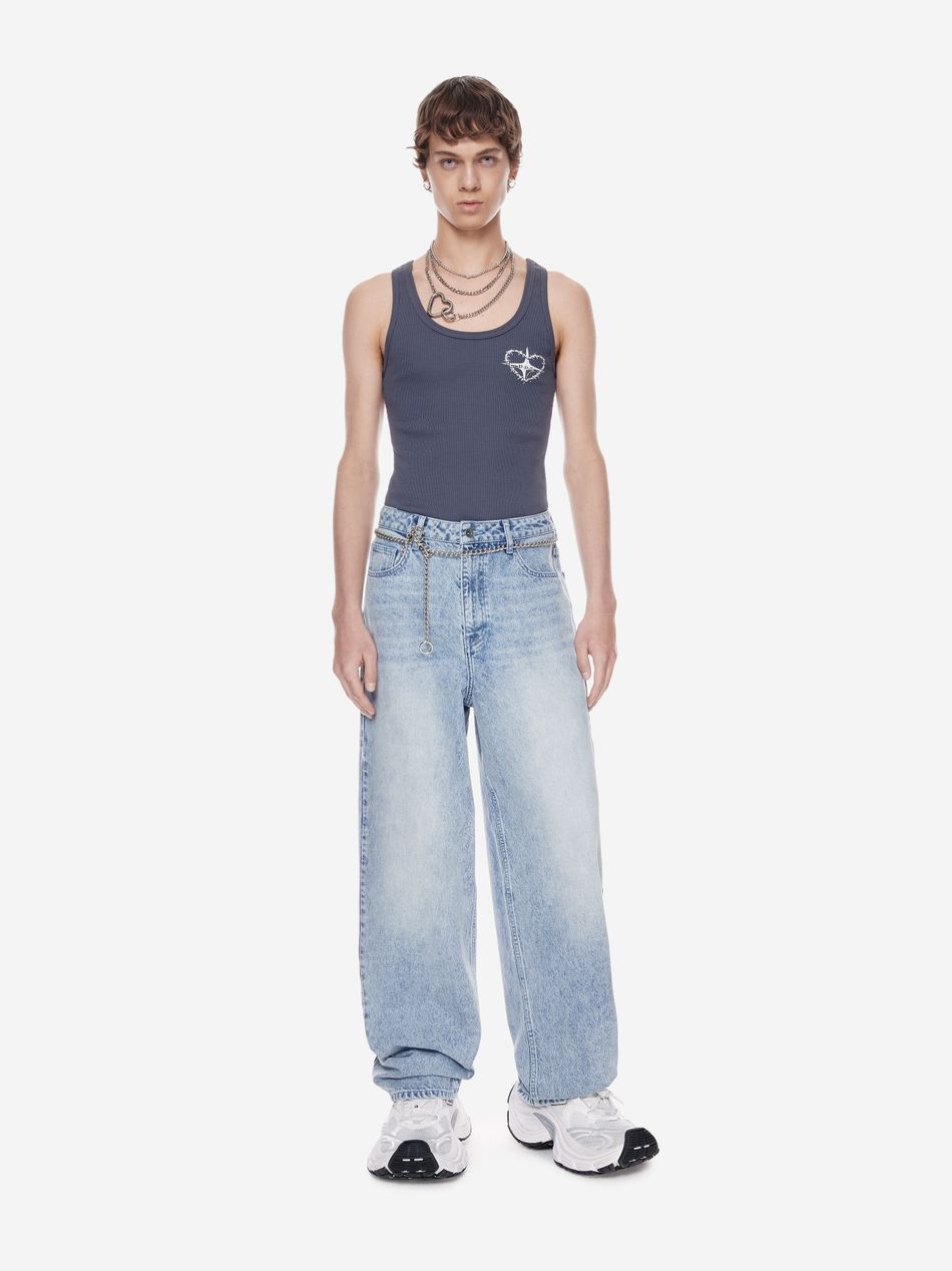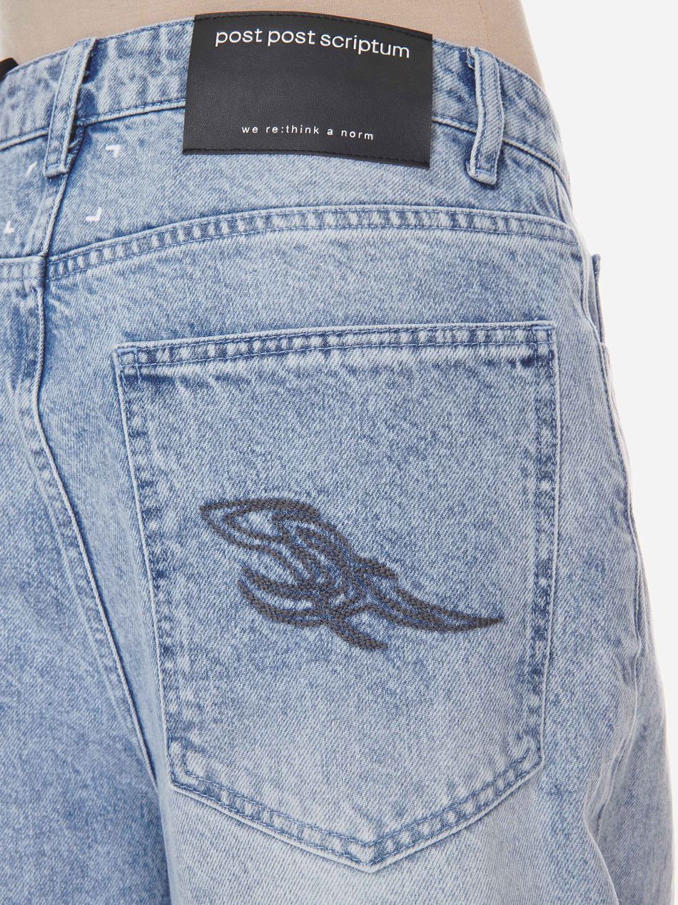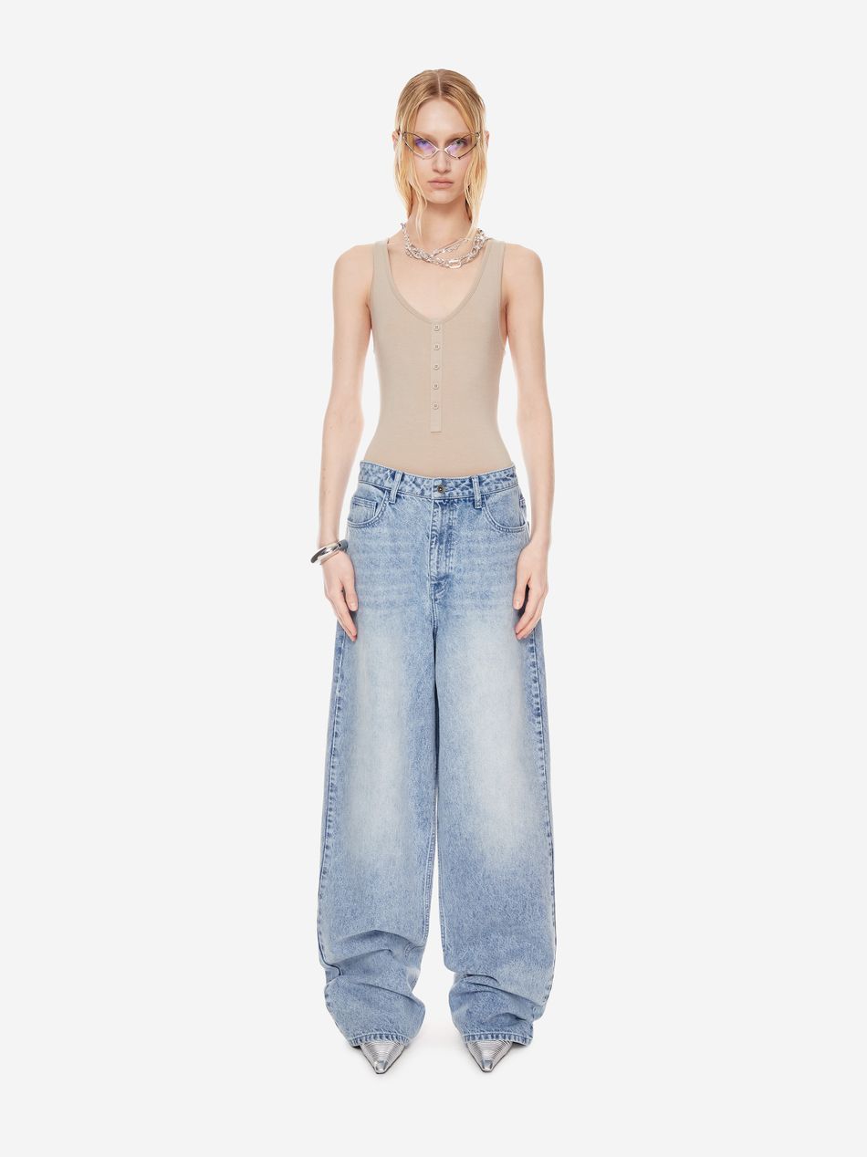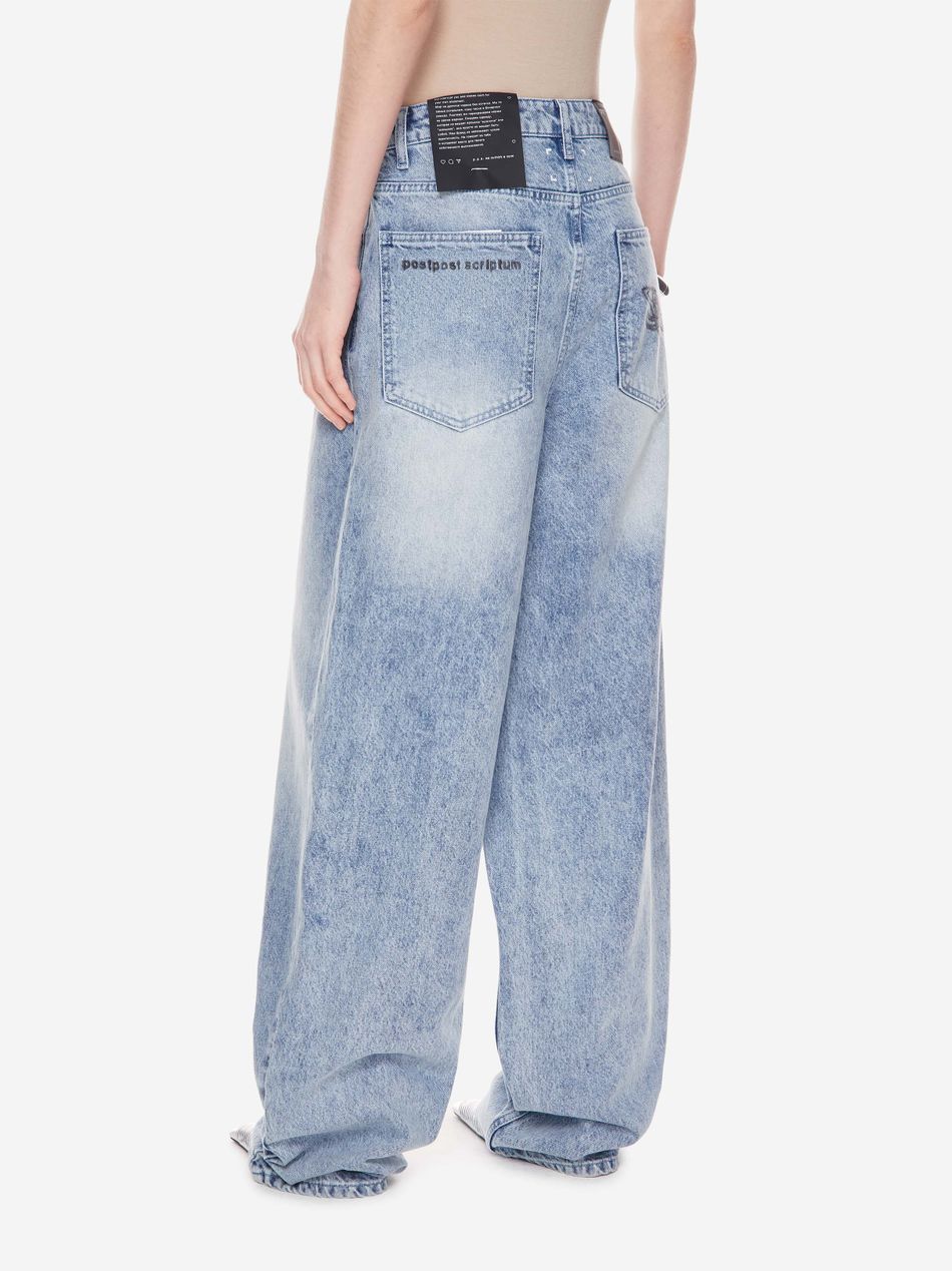 Широкие джинсы из плотного денима с винтажной обработкой, подчёркивающей глубину цвета и характер изделия.