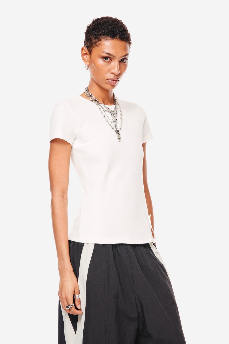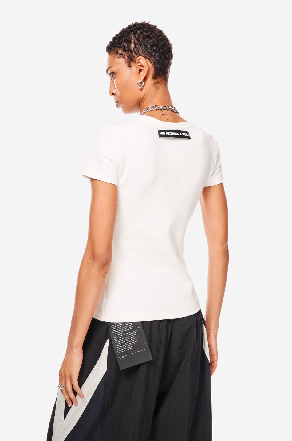 футболка приталенного кроя из смесового хлопка. модель с круглым вырезом, короткими рукавами и биркой со слоганом сзади"