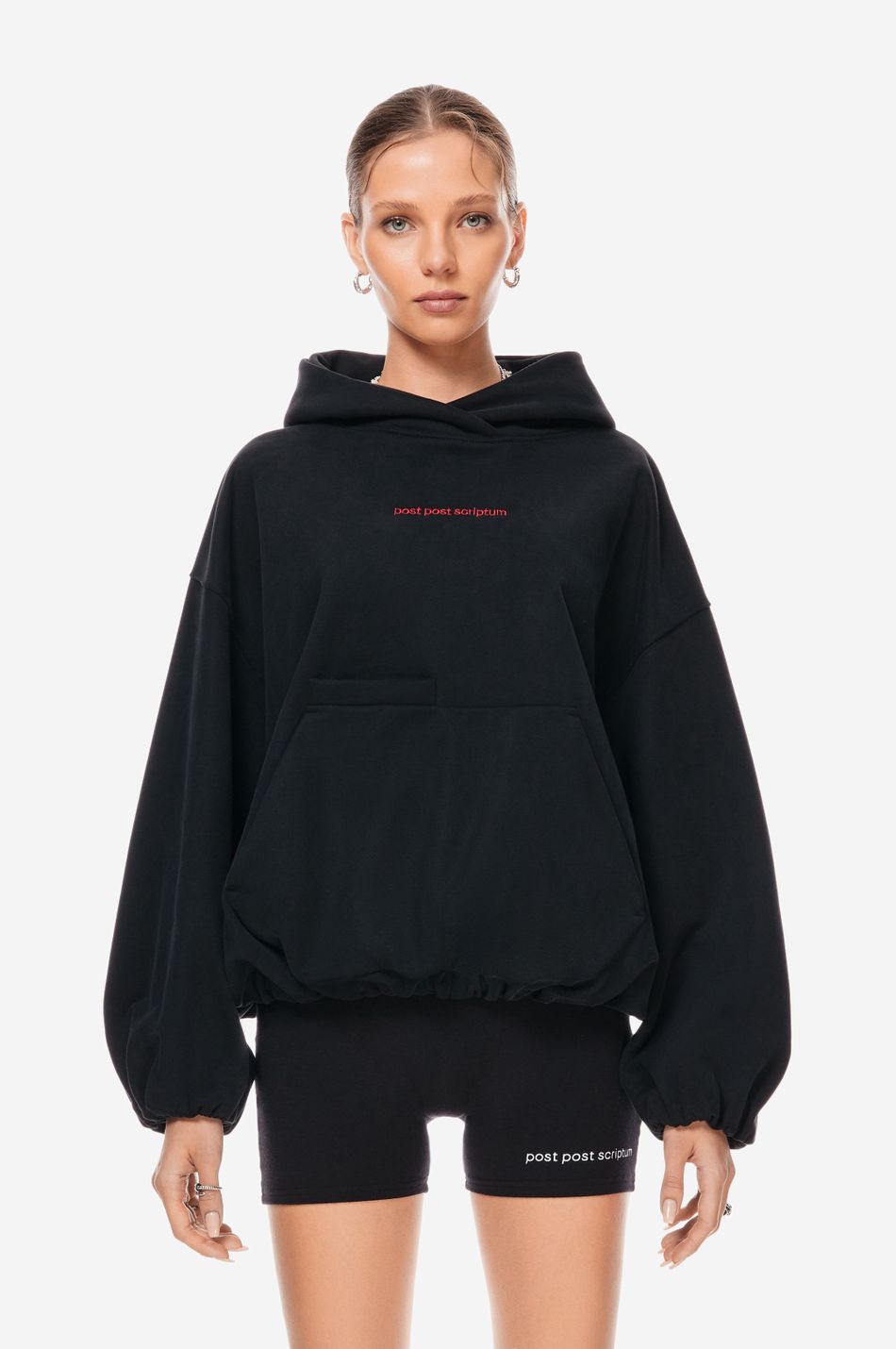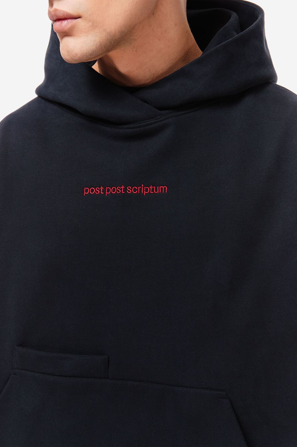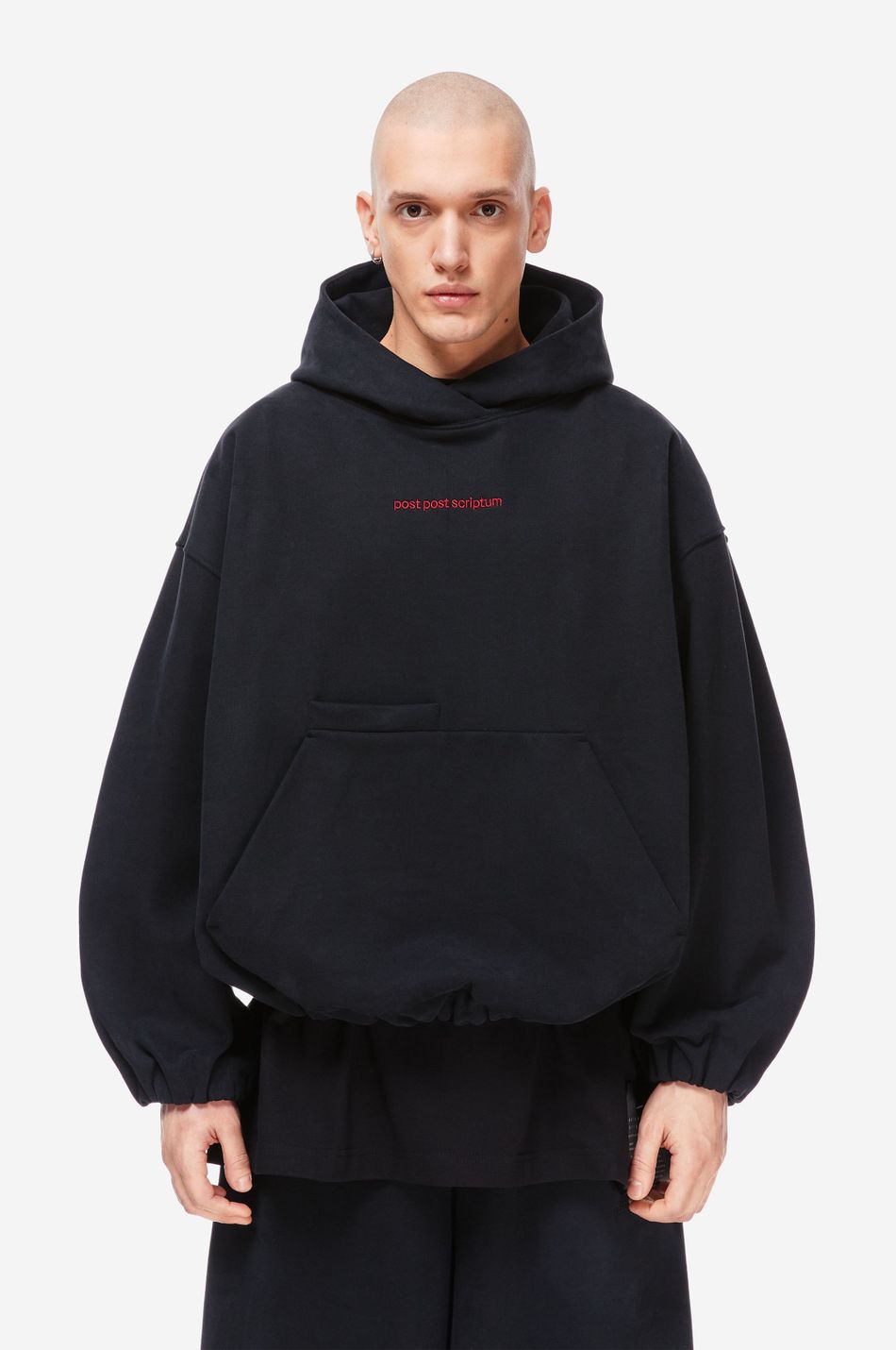 Худи выполнен из 100% хлопкового трикотажа плотностью 470 г со специальной винтажной стиркой, которая придает ткани глубину цвета и мягкость. Фирменный крой бренда подчеркивается объемным силуэтом, спущенными плечами, перекрывающимся вырезом плавно переходящим в массивный капюшон. Вышитый красный логотип “post post scriptum” спереди добавляет контрастный акцент. Просторный передний карман, эластичные манжеты и собранный на резинку подол обеспечивают комфортную посадку и стильный баланс между расслабленным и продуманным дизайном
