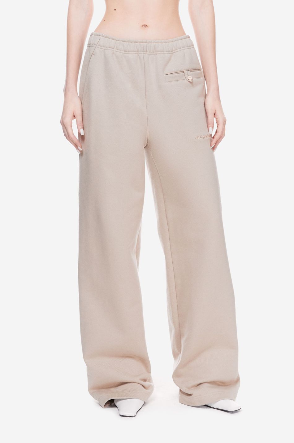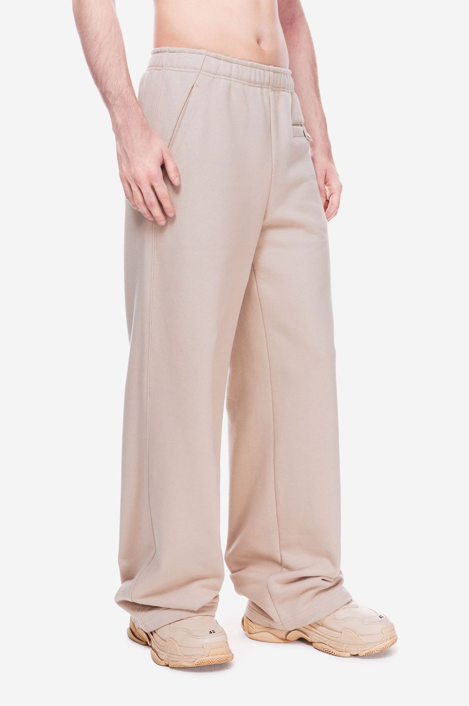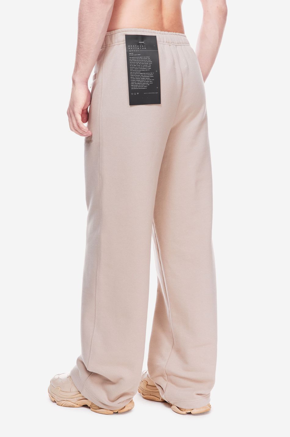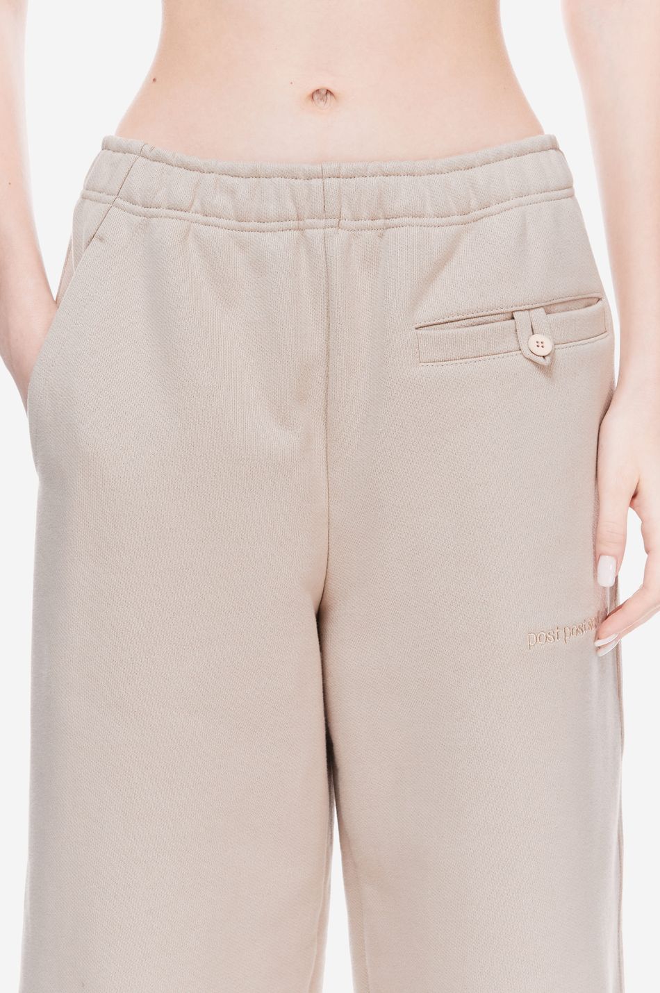 Брюки прямого кроя из тяжёлого хлопкового трикотажа плотностью 460 г/м² с питч-эффектом — бархатистой матовой поверхностью. Спереди — один прорезной карман с клапаном и пуговицей как функциональный fashion-акцент, один боковой карман. Эластичный пояс на резинке с внутренним шнурком обеспечивает комфортную посадку. Вышивка post post scriptum на бедре и патч-манифест сзади подчёркивают эстетику бренда. Сочетайте с худи или анораком из новой коллекции.