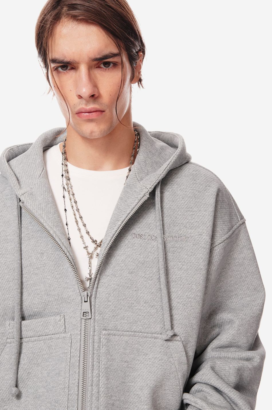 Фирменная вышивка в тон post post scriptum на груди, патч-манифест сбоку и вышитые вручную скобки на спинке подчёркивают эстетику бренда.