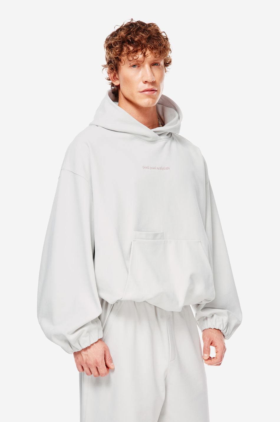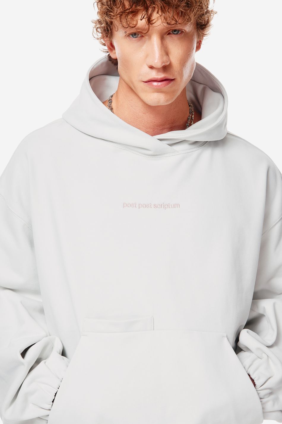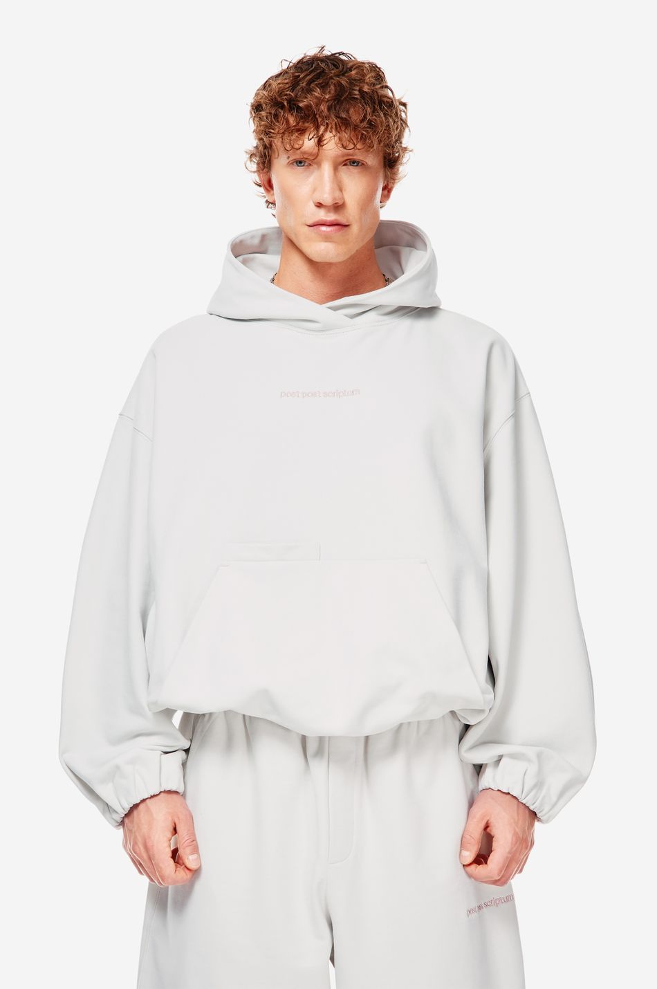 Худи выполнен из 100% хлопкового трикотажа плотностью 470 г со специальной винтажной стиркой, которая придает ткани глубину цвета и мягкость. Фирменный крой бренда подчеркивается объемным силуэтом, спущенными плечами, перекрывающимся вырезом плавно переходящим в массивный капюшон. Вышитый красный логотип “post post scriptum” спереди добавляет контрастный акцент. Просторный передний карман, эластичные манжеты и собранный на резинку подол обеспечивают комфортную посадку и стильный баланс между расслабленным и продуманным дизайном
