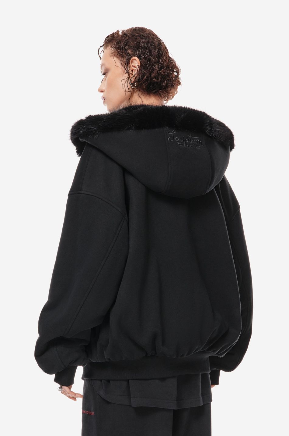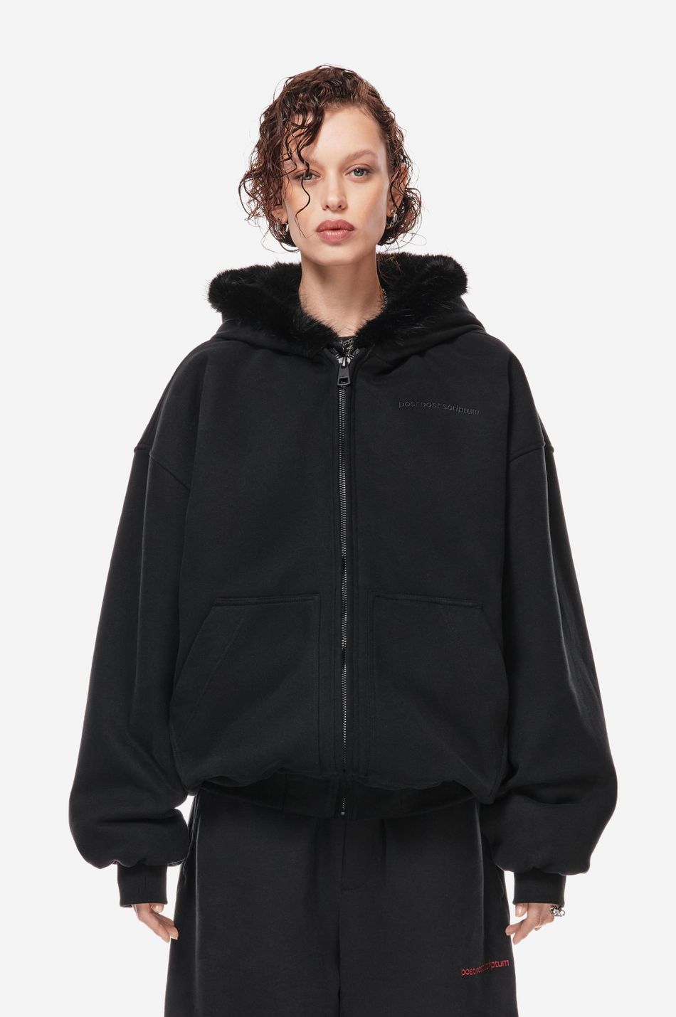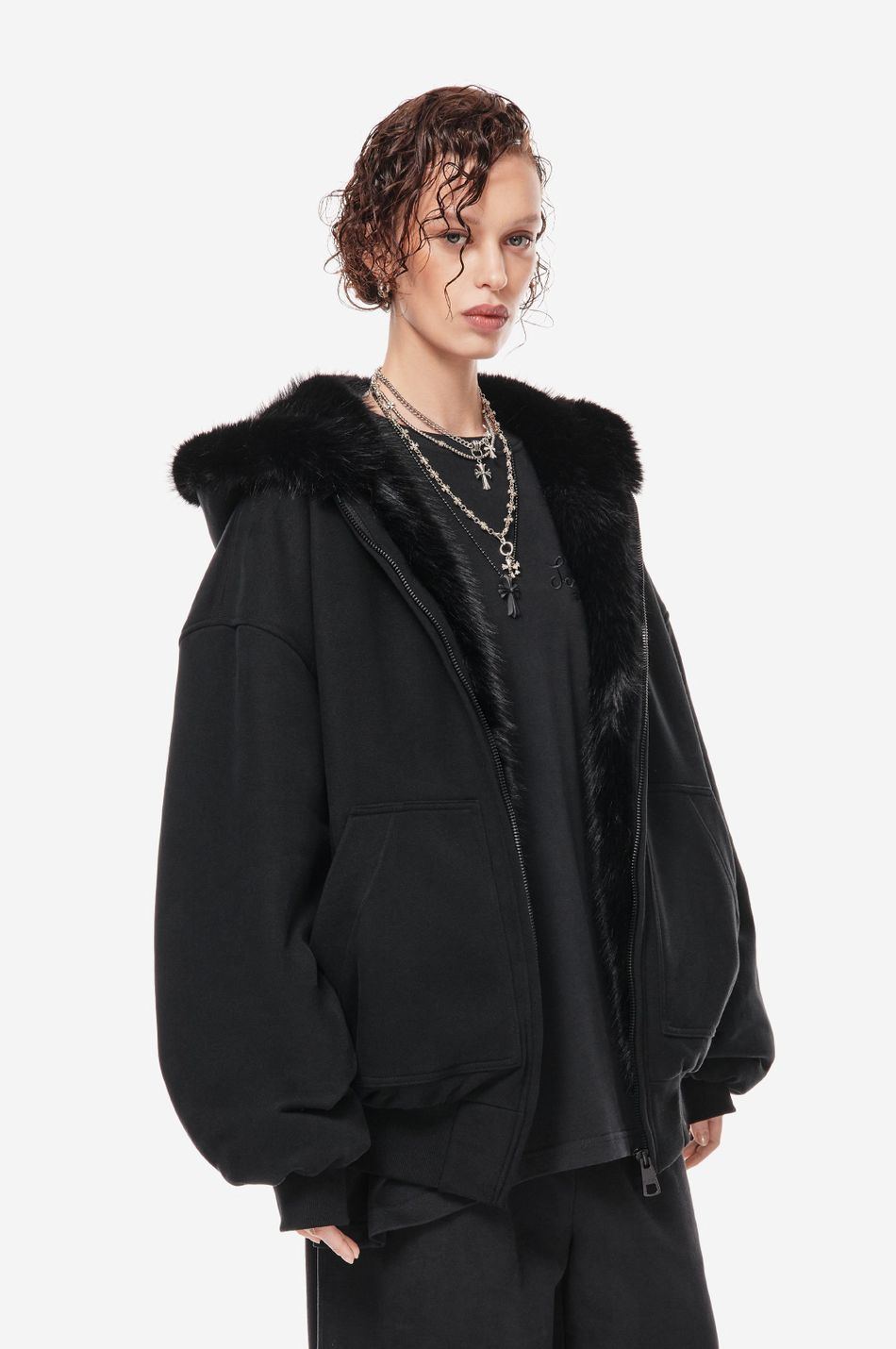 объёмный бомбер фирменного оверсайз кроя с отделкой капюшона искусственным мехом в тон. функциональная молния, карманы-кенгуру и плотные трикотажные манжеты делают модель удобной для повседневного ношения.