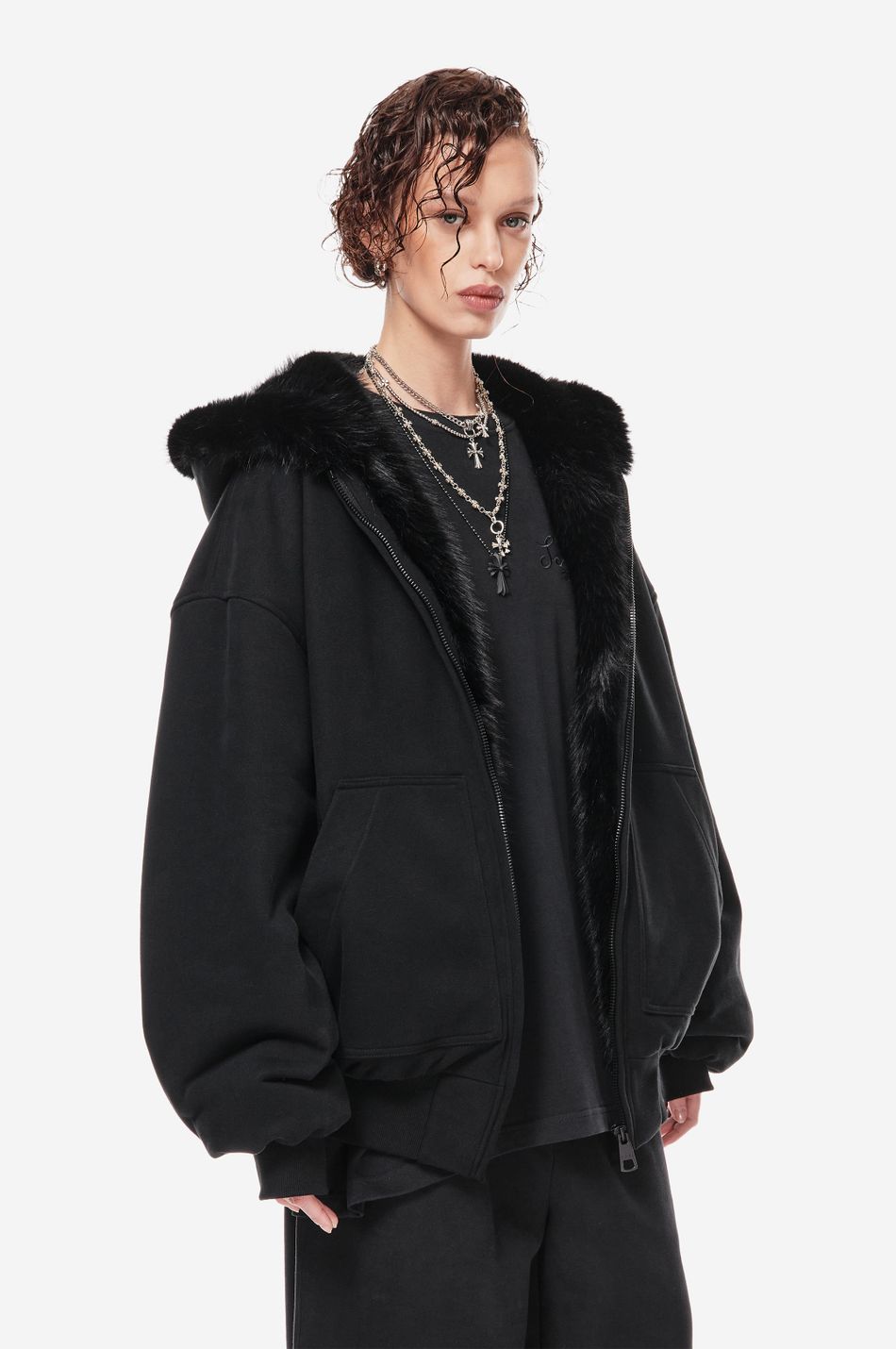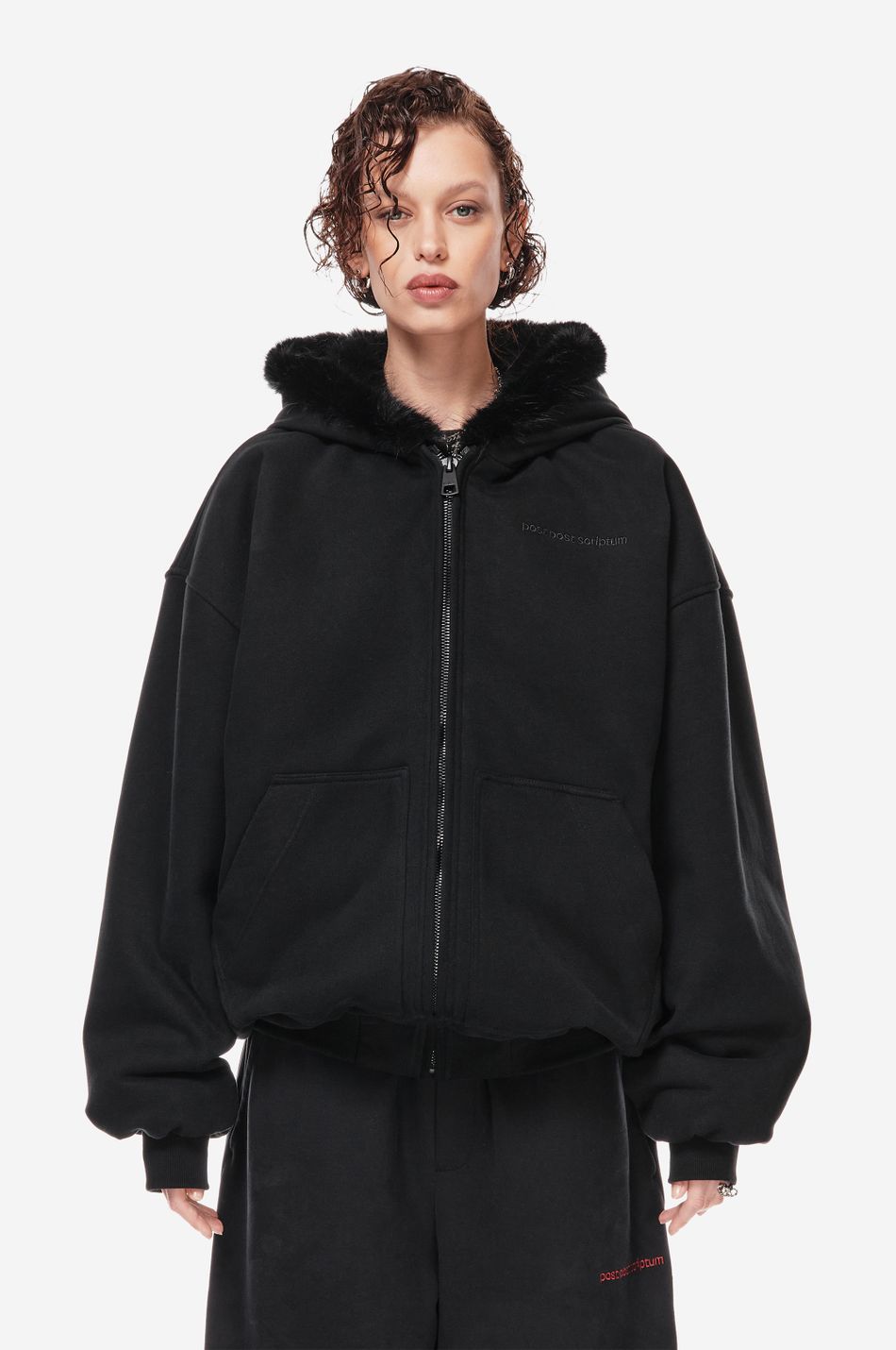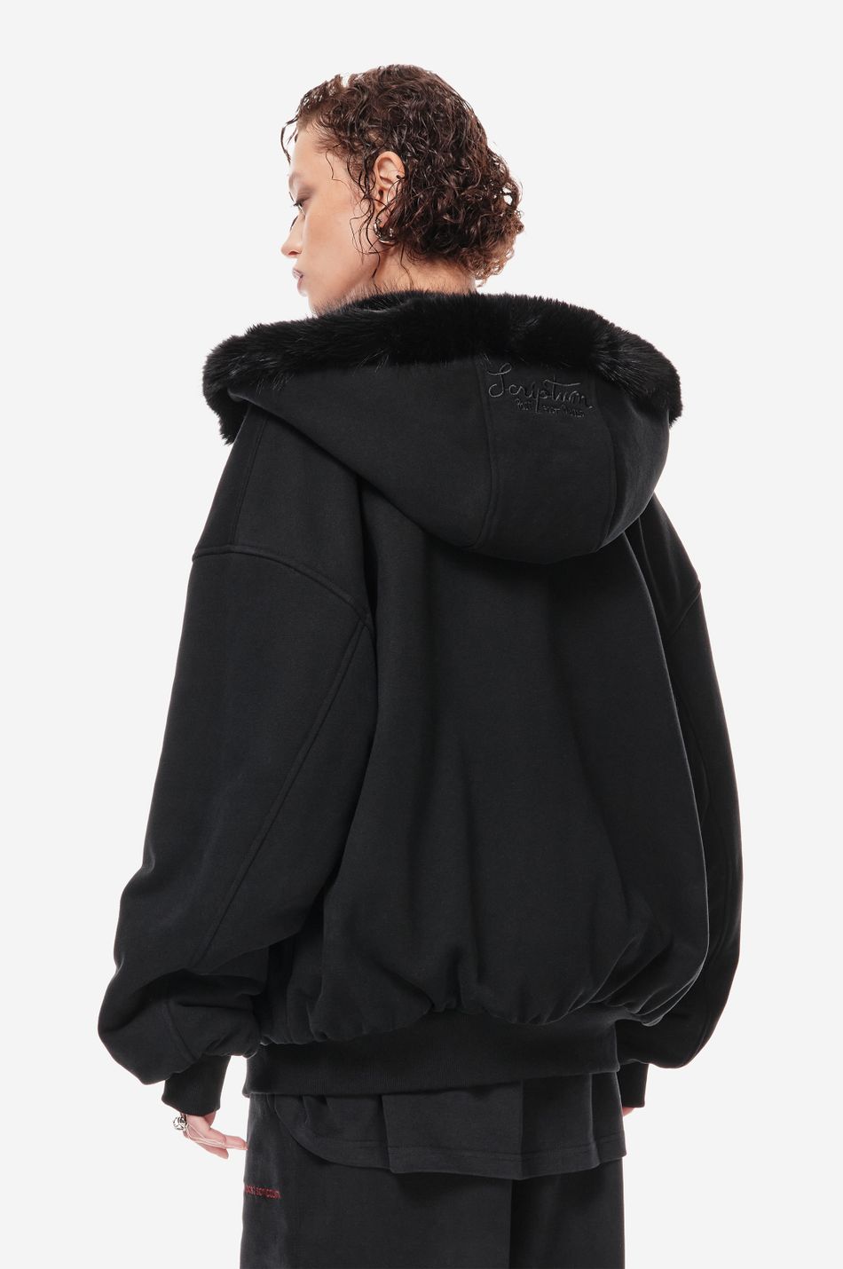 объёмный бомбер фирменного оверсайз кроя с отделкой капюшона искусственным мехом в тон. функциональная молния, карманы-кенгуру и плотные трикотажные манжеты делают модель удобной для повседневного ношения.