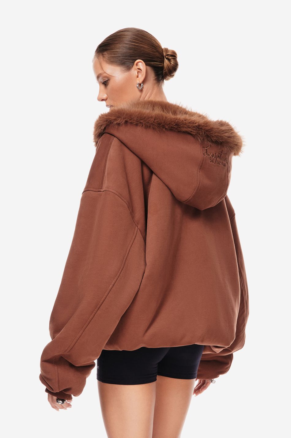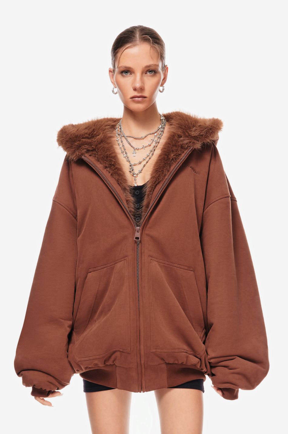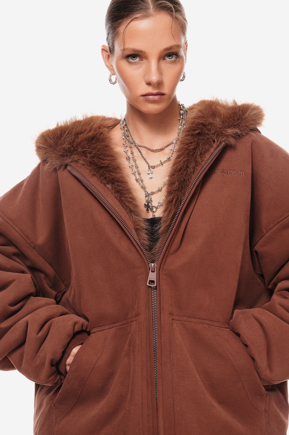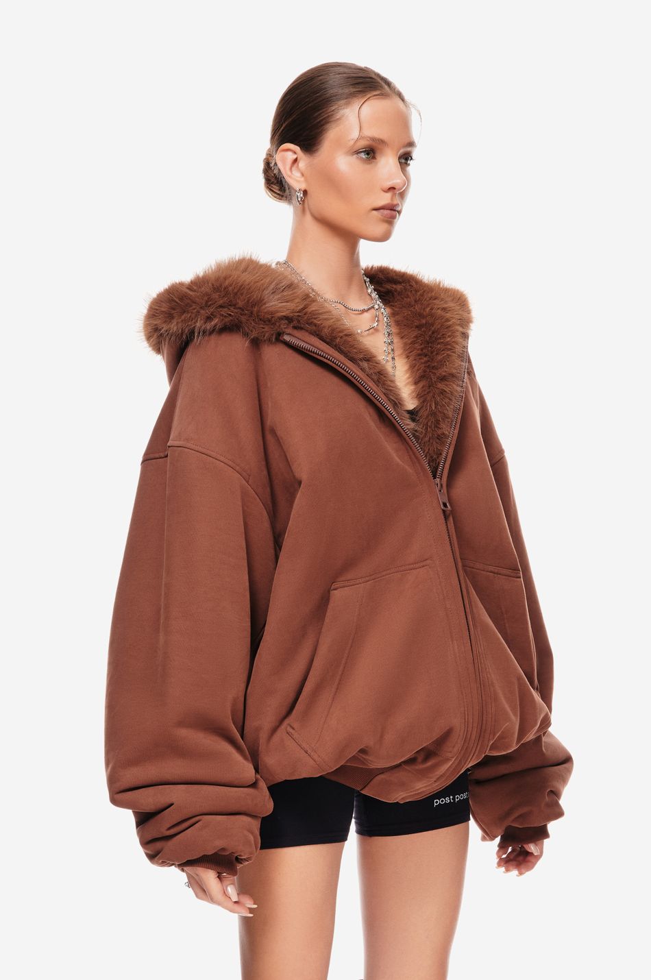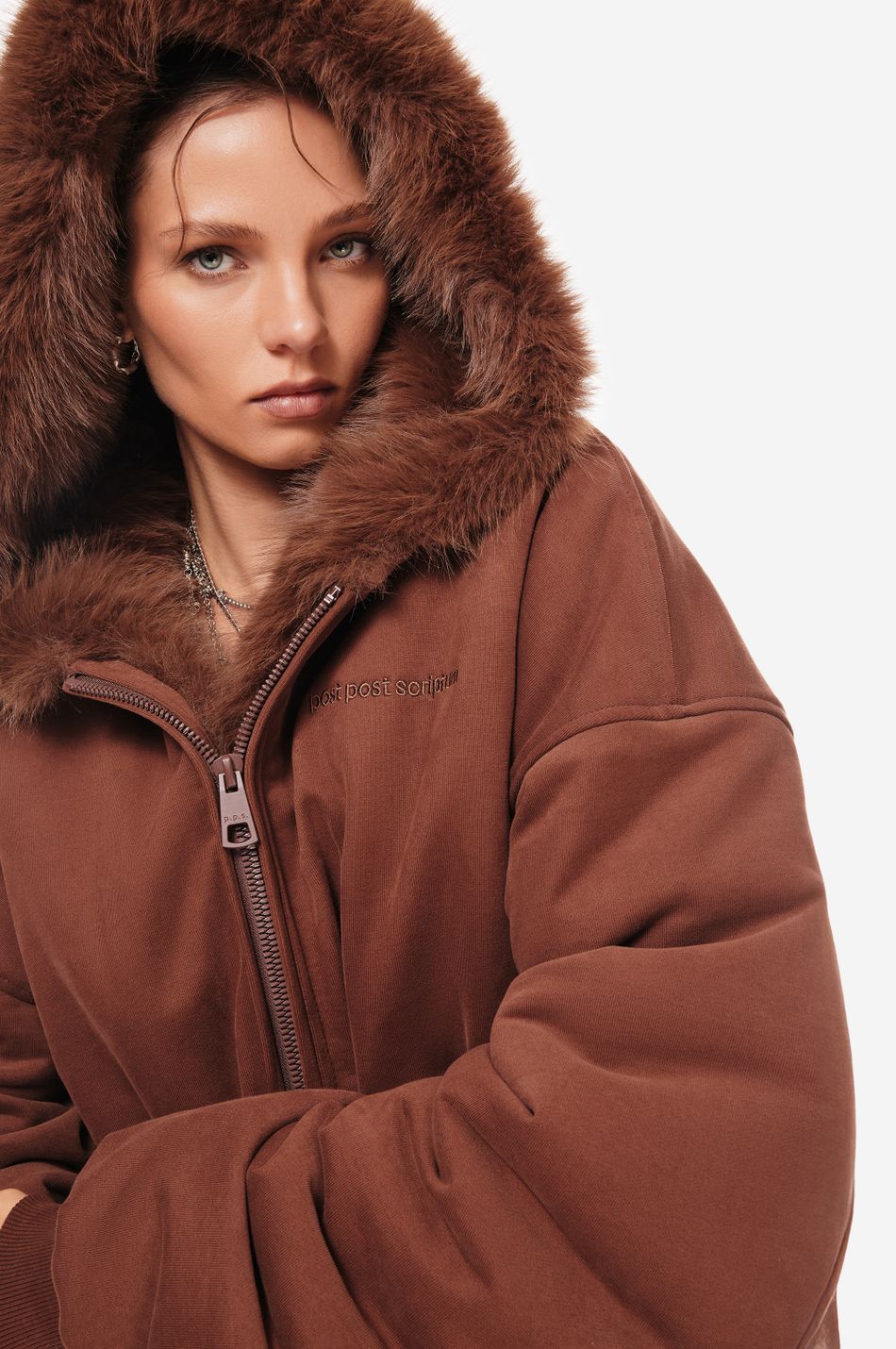 объёмный бомбер фирменного оверсайз кроя с отделкой капюшона искусственным мехом в тон. функциональная молния, карманы-кенгуру и плотные трикотажные манжеты делают модель удобной для повседневного ношения.