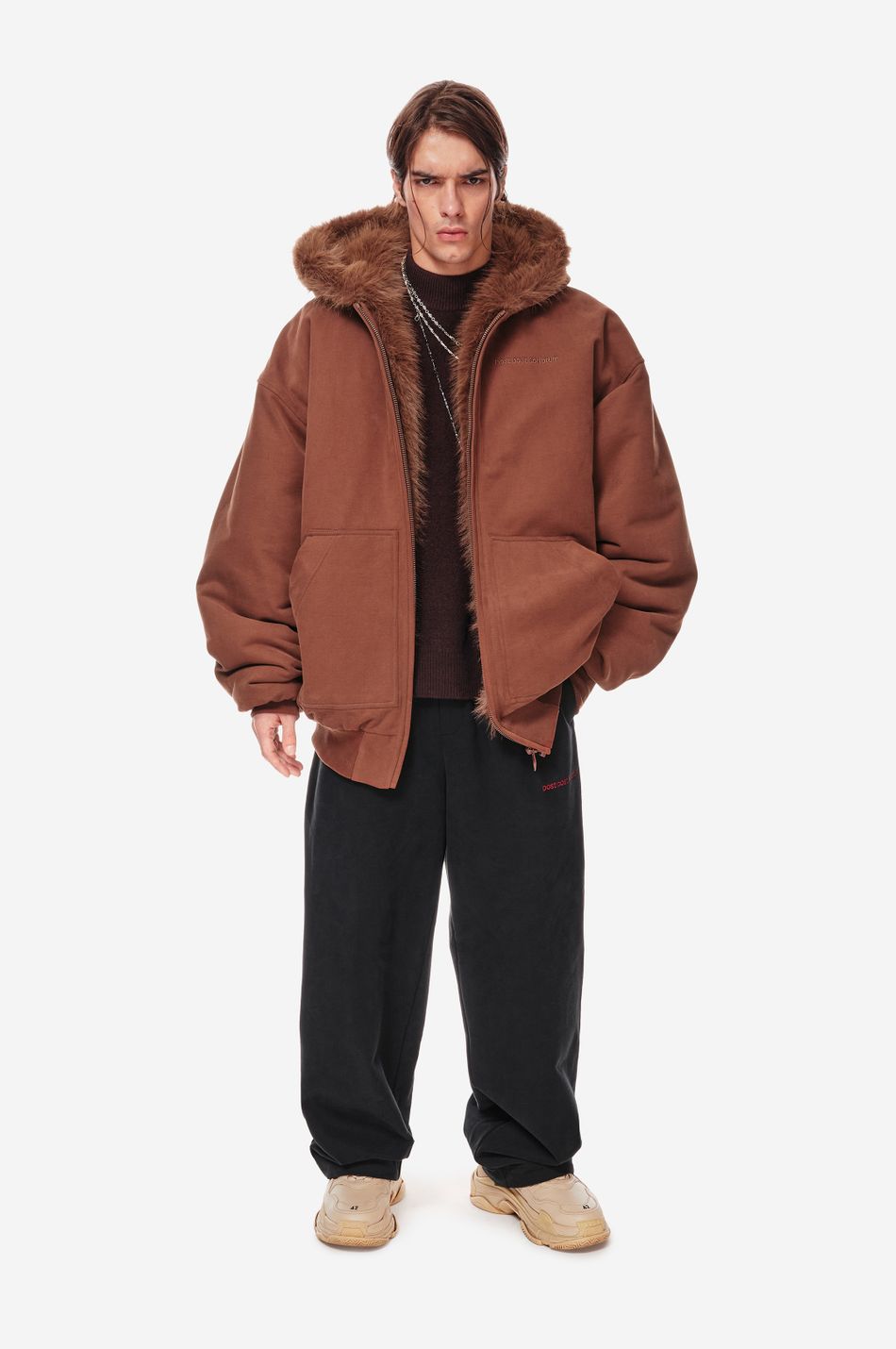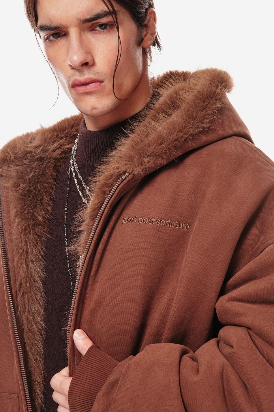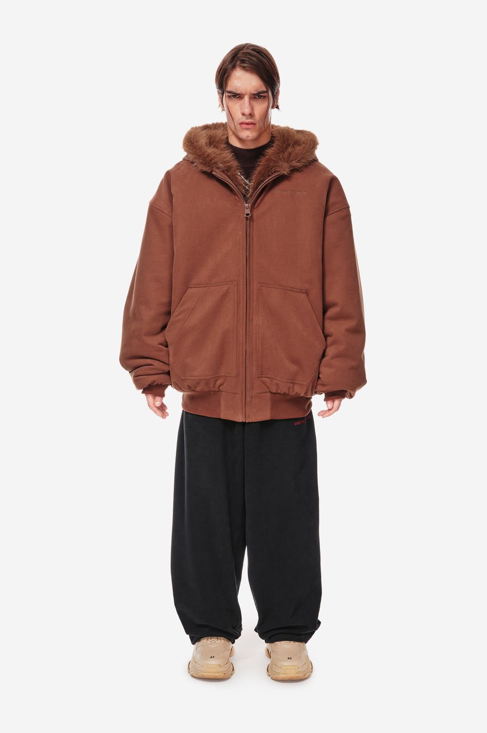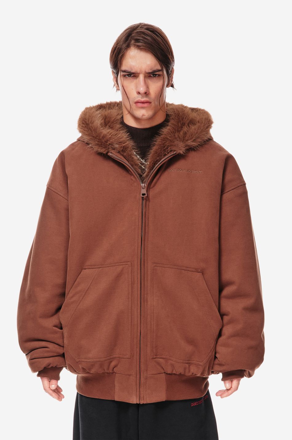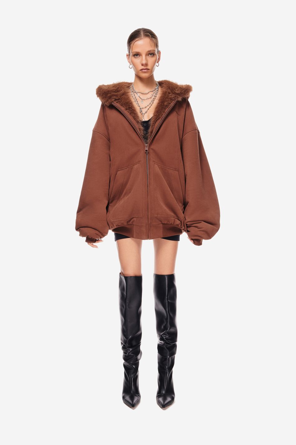объёмный бомбер фирменного оверсайз кроя с отделкой капюшона искусственным мехом в тон. функциональная молния, карманы-кенгуру и плотные трикотажные манжеты делают модель удобной для повседневного ношения.