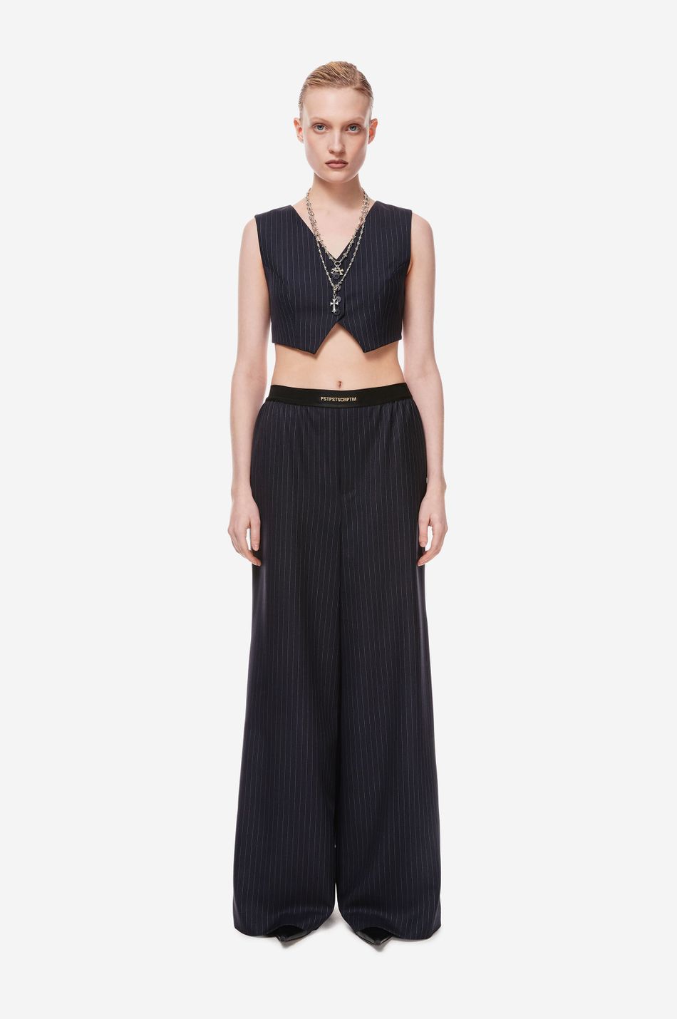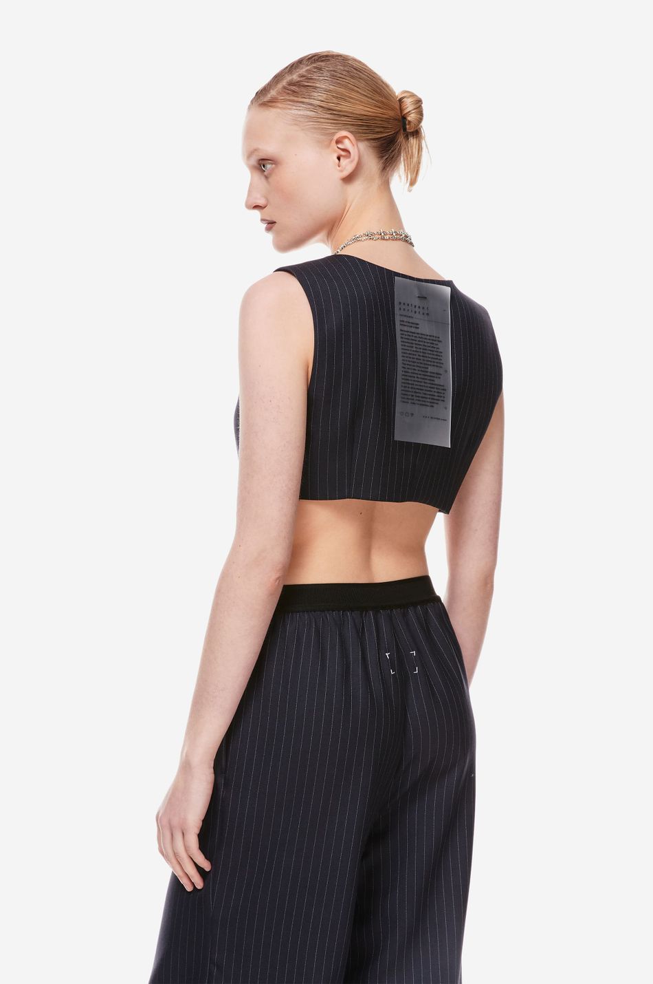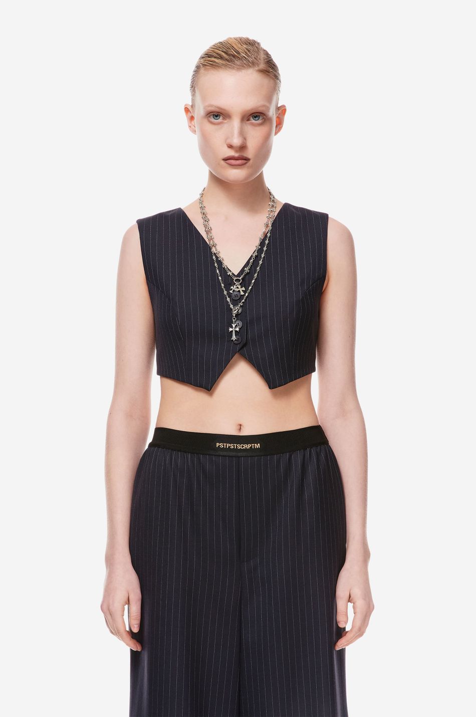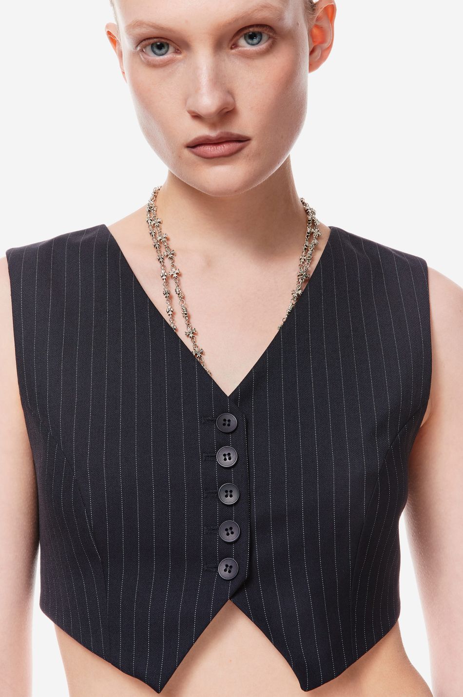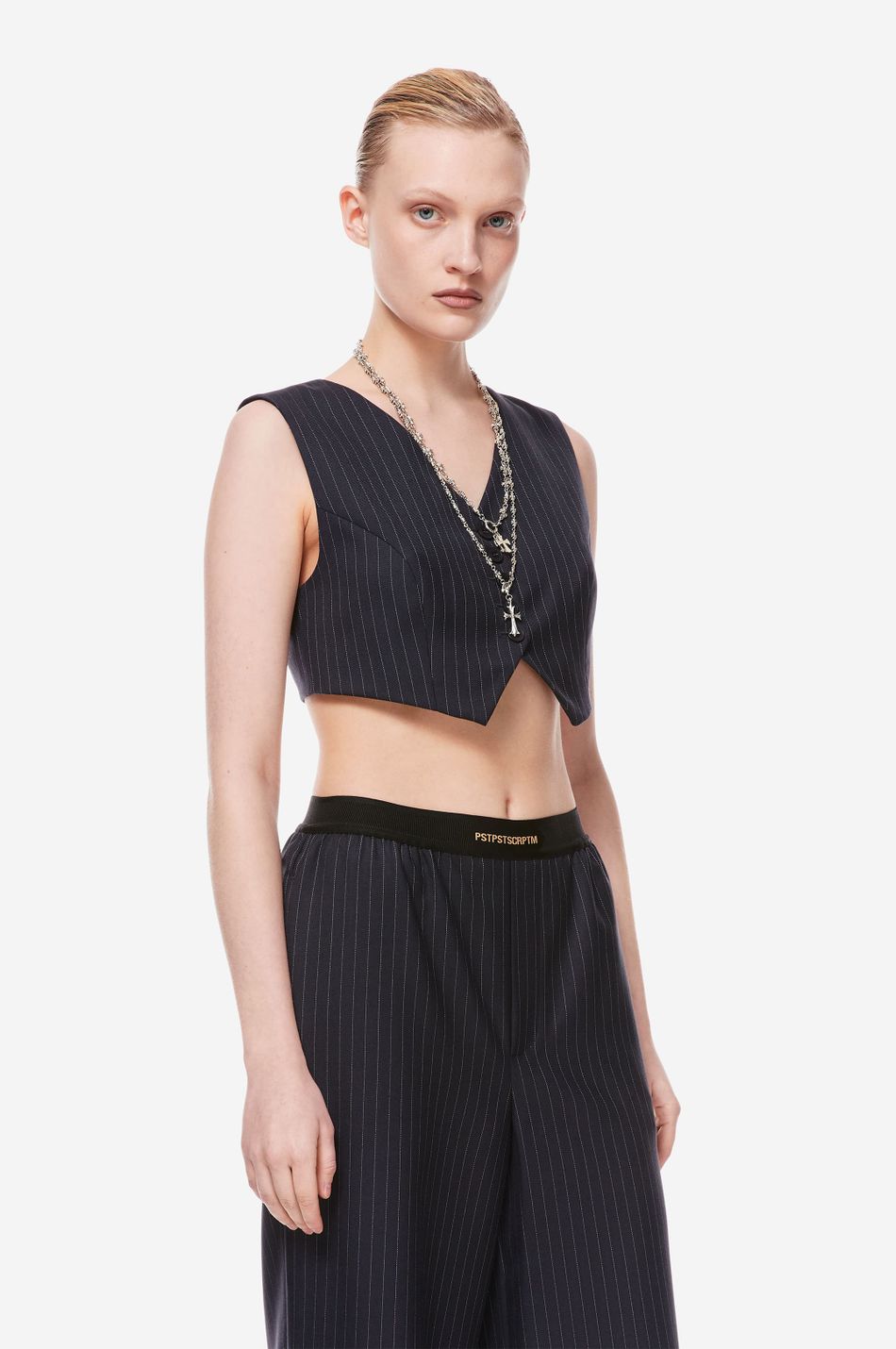 кроп-жилет — наш свежий взгляд на костюмные формы с вайбом наивности. тема Self Comfort управляет знакомыми силуэтами и долговечными материалами в костюмах, со свежими деталями и пропорциями, обновляющими классику. подчеркни сексуальность, надевая жилет на голое тело в качестве топа или дополни его жакетом и рубашкой из коллекции p.p.s. для официального образа.