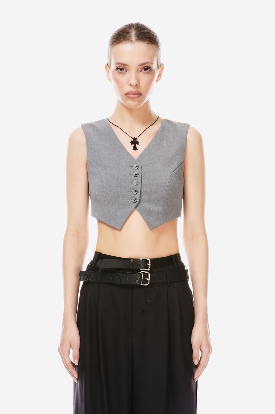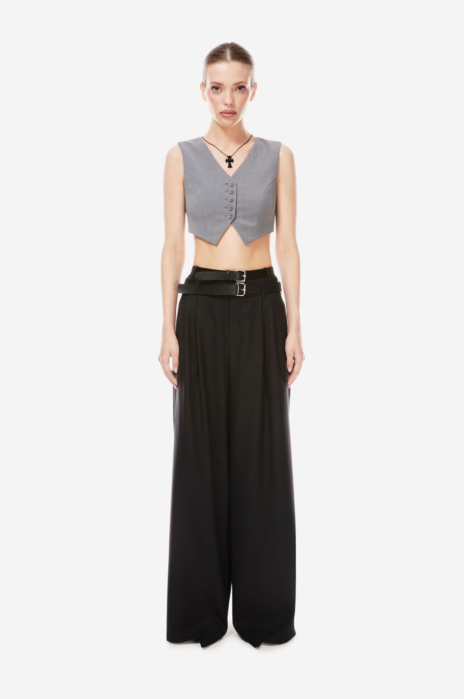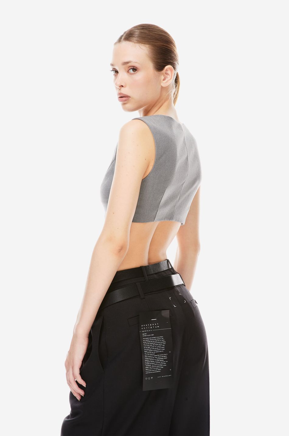кроп-жилет — наш свежий взгляд на костюмные формы с вайбом наивности. тема Self Comfort управляет знакомыми силуэтами и долговечными материалами в костюмах, со свежими деталями и пропорциями, обновляющими классику. подчеркни сексуальность, надевая жилет на голое тело в качестве топа или дополни его жакетом и рубашкой из коллекции p.p.s. для официального образа.