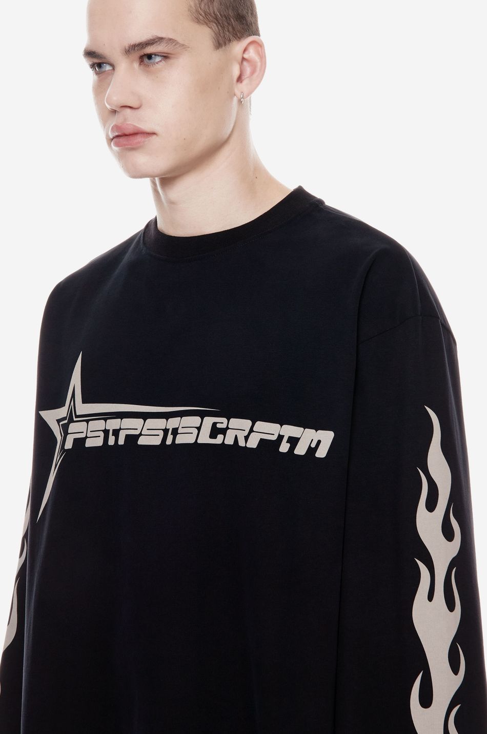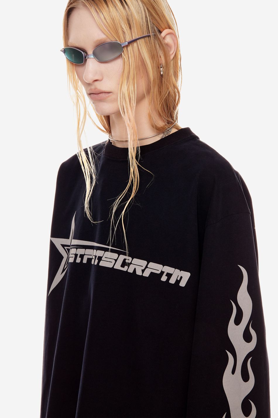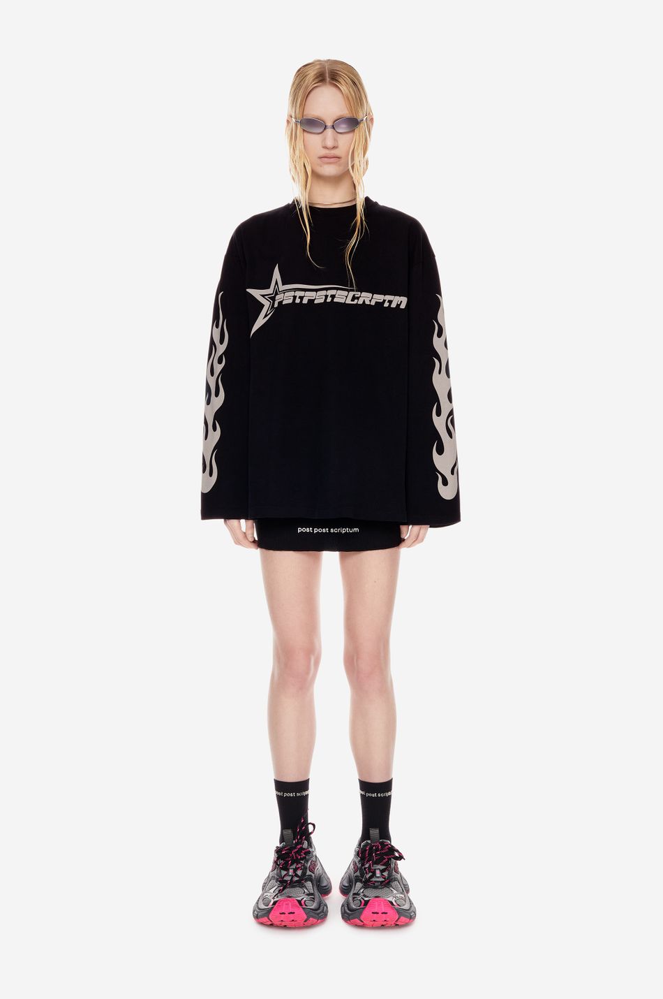 Лонгслив образ гоночной графики и символов скорости. Контрастные принты формируют динамичную композицию, вдохновлённую культурой автоспорта.