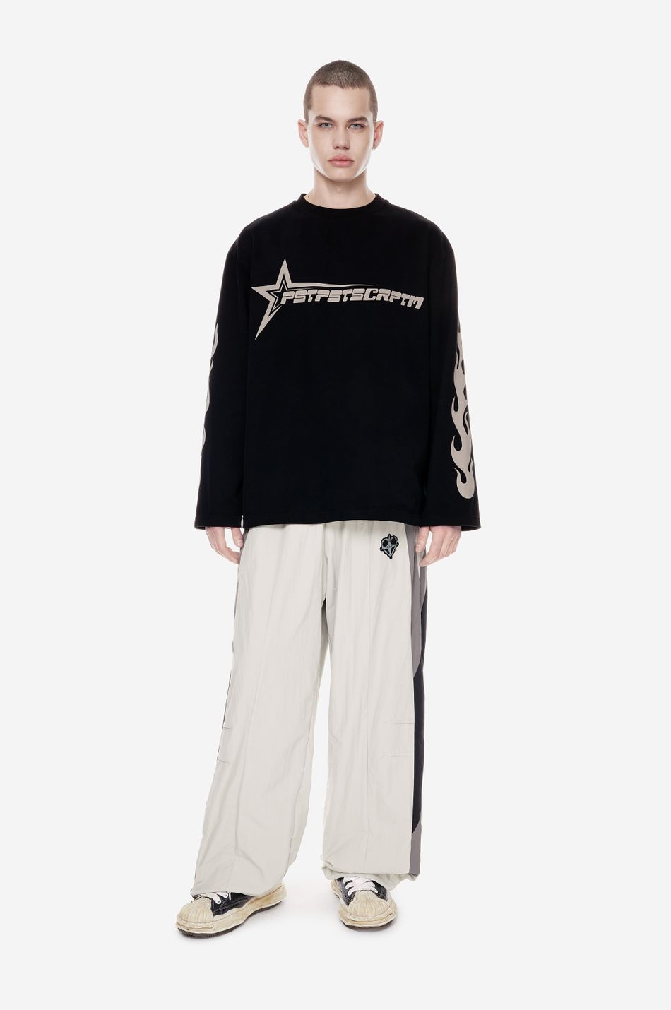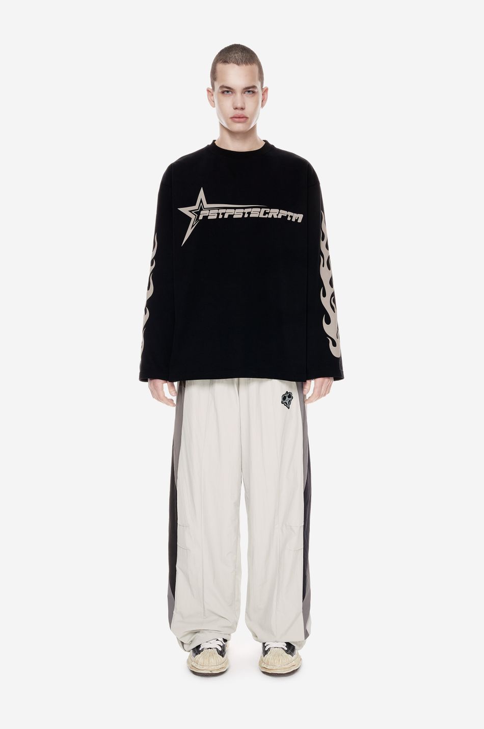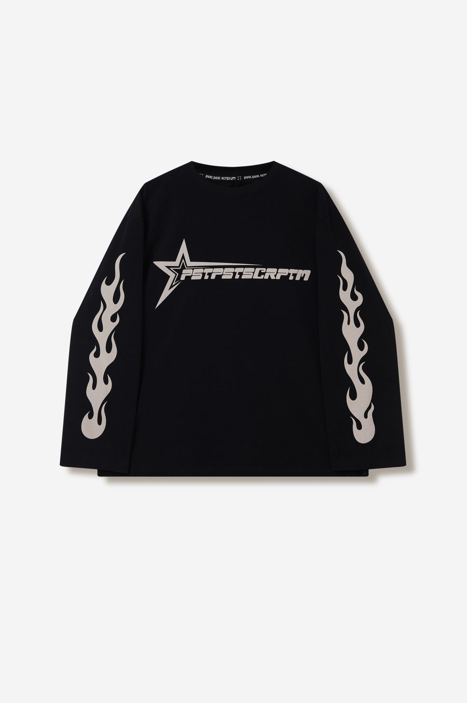 Лонгслив образ гоночной графики и символов скорости. Контрастные принты формируют динамичную композицию, вдохновлённую культурой автоспорта.