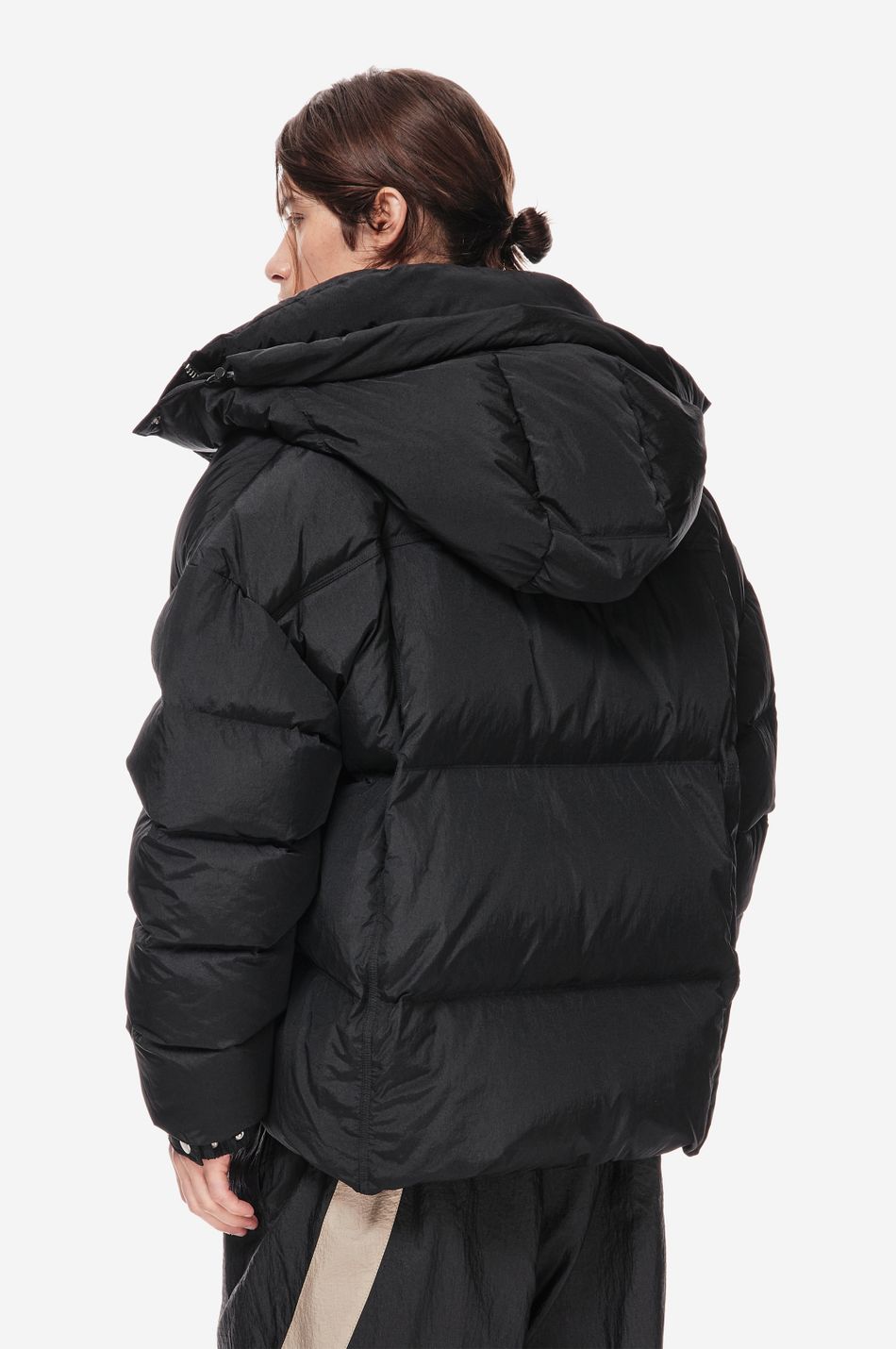 LOOM PUFF — архитектурный силуэт в оверсайз-пуховике. функциональные элементы — регулируемый капюшон, высокая стойка и система кулис — определяют скульптурный крой. узнаваемость бренда проявляется в деталях: металлические буквы post post scriptum и гравировка на фурнитуре. вещь, сочетающая утилитарность и эстетику для температуры до –25 °C.
