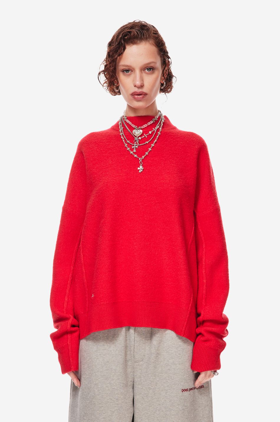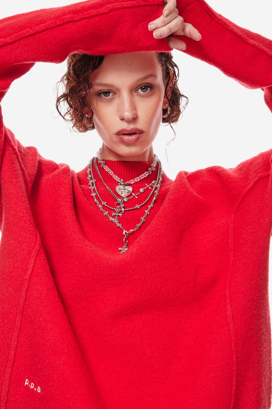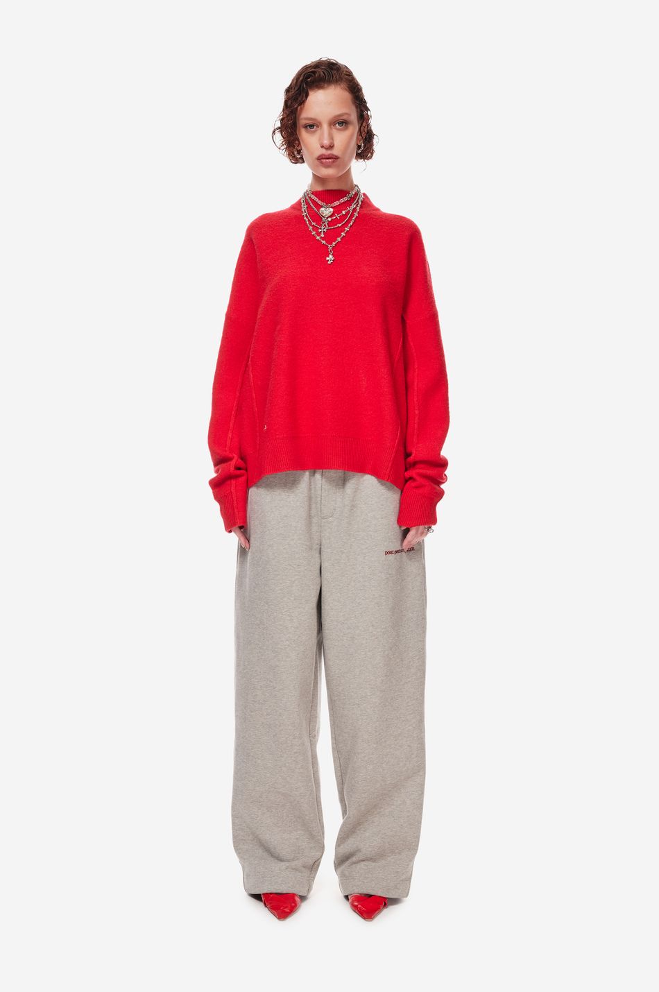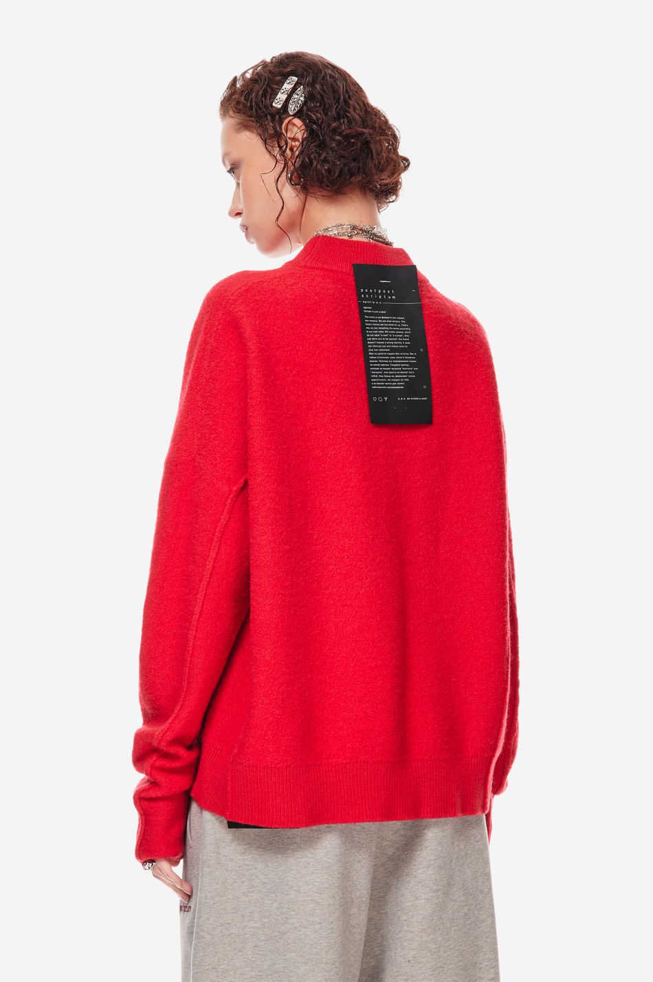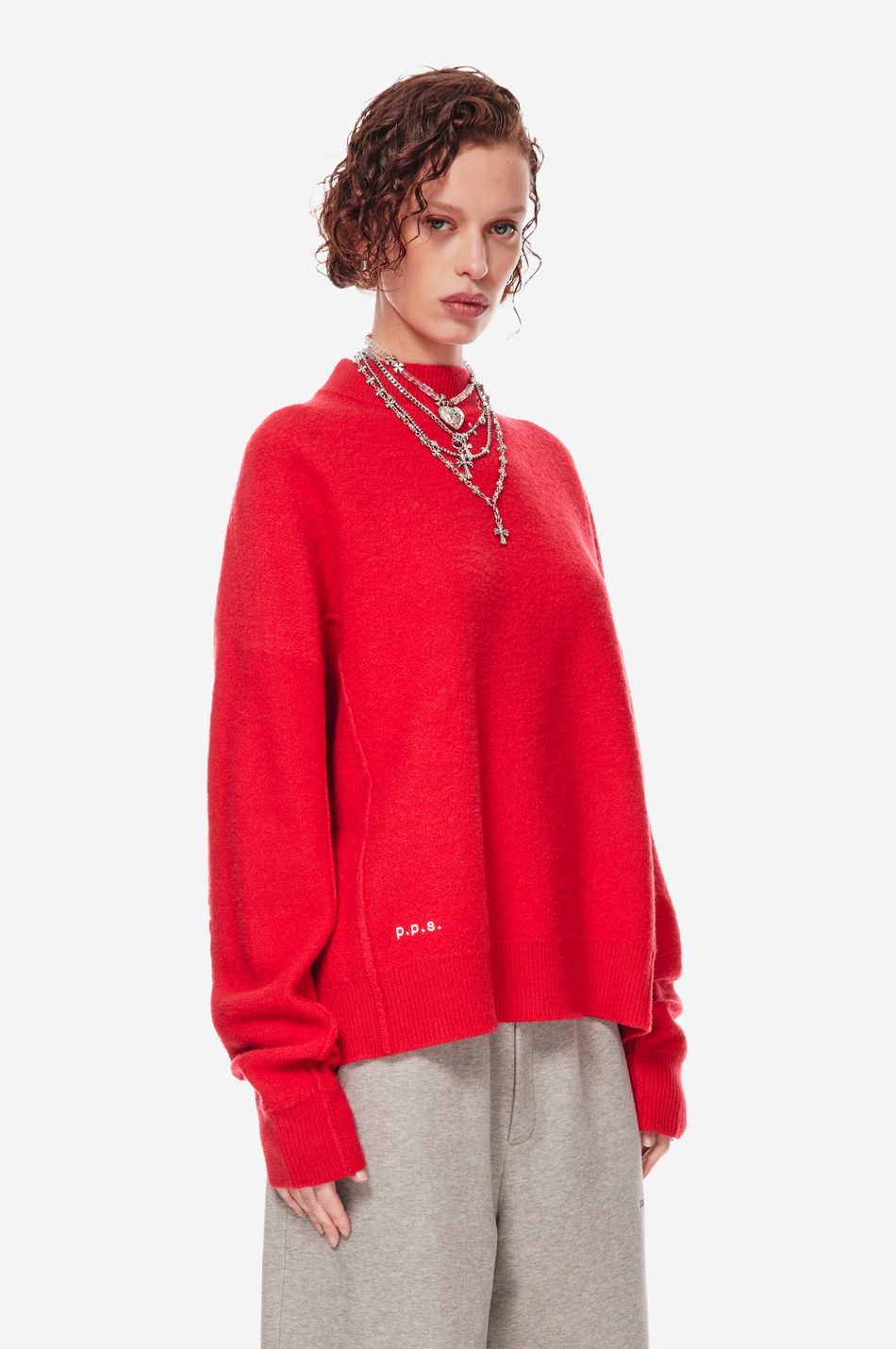 для изготовления свитера объемного силуэта использовали качественную мягкую шерсть приятно прилегающую к телу. дополнительный объем добавляют спущенный плечевой шов и удлиненные рукава с манжетами в рубчик, закрывающими ладони. модель с воротником-стойкой, декоративными швами и вышивкой снизу.
