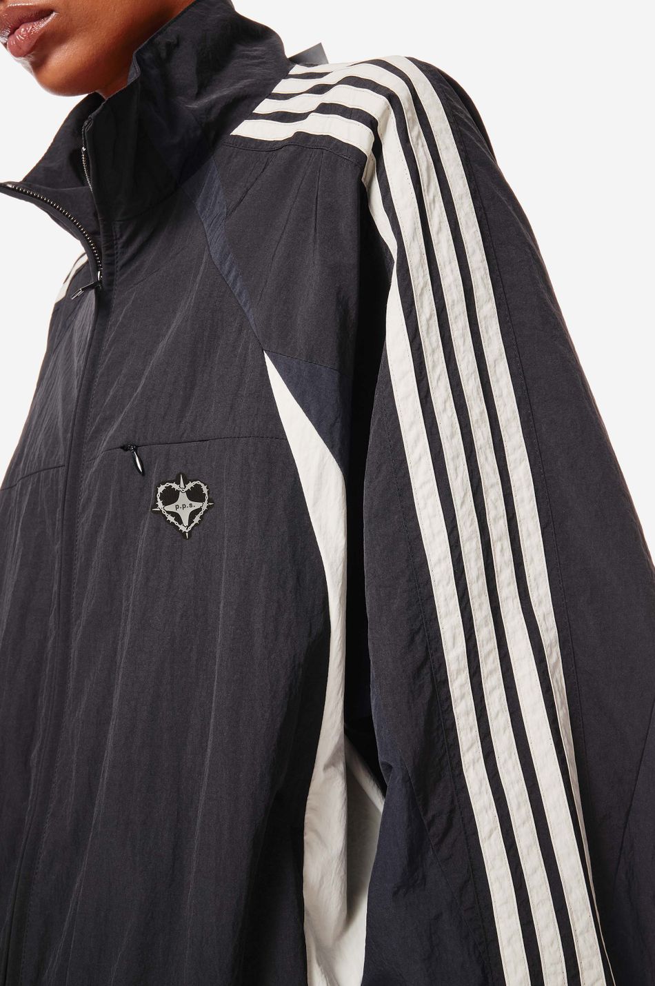 олимпийка chrome heart — переосмысление архивного спортивного силуэта в эстетике Y2K. контрастные вставки и лампасы формируют динамичный образ на стыке спорта, урбанистики и индивидуального стиля.