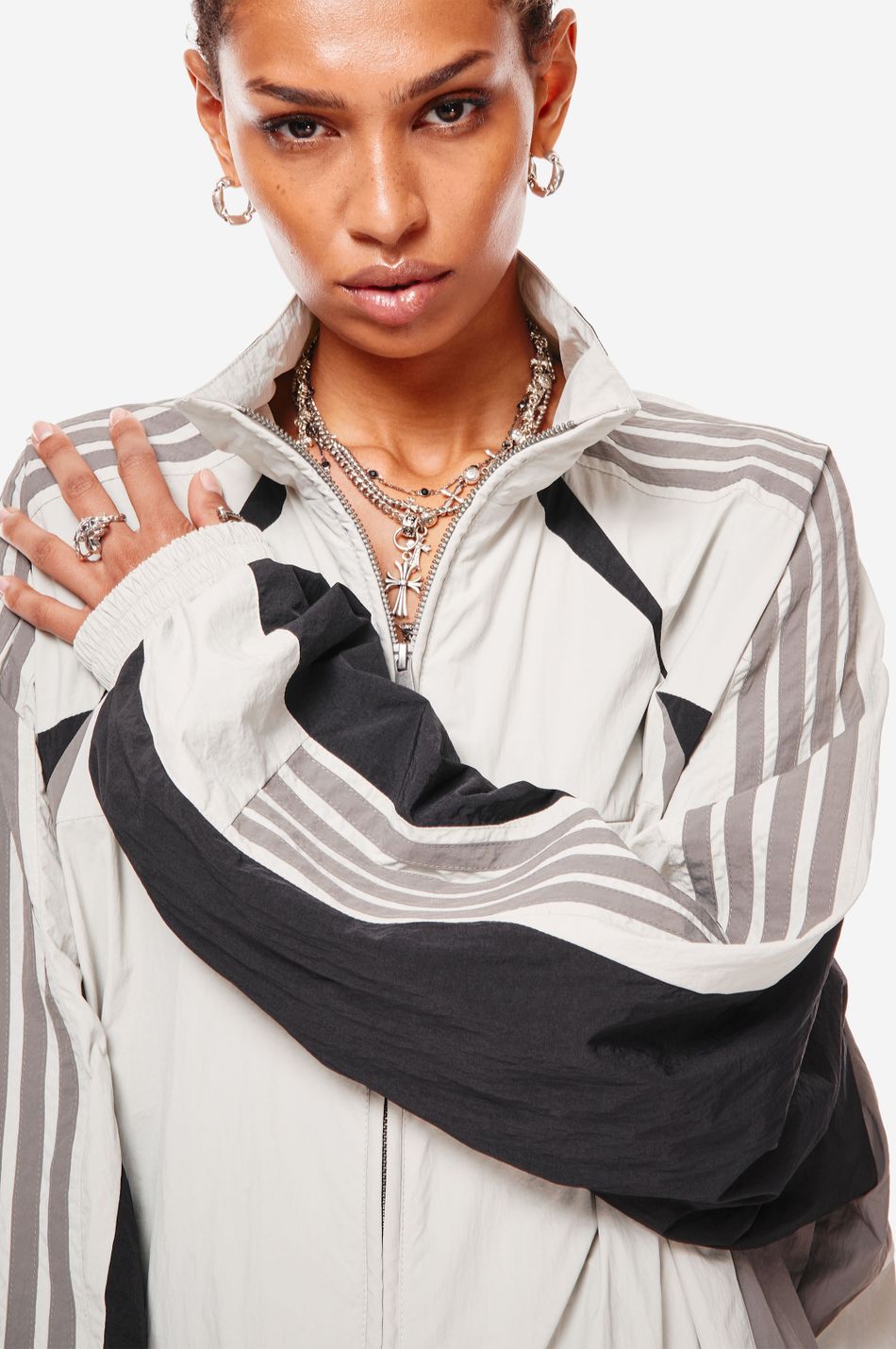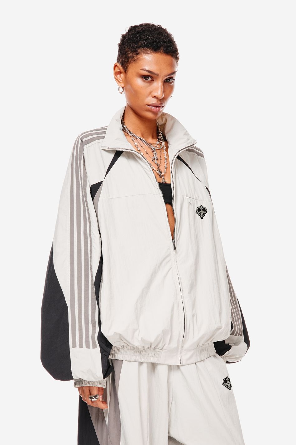 олимпийка chrome heart — переосмысление архивного спортивного силуэта в эстетике Y2K. контрастные вставки и лампасы формируют динамичный образ на стыке спорта, урбанистики и индивидуального стиля.