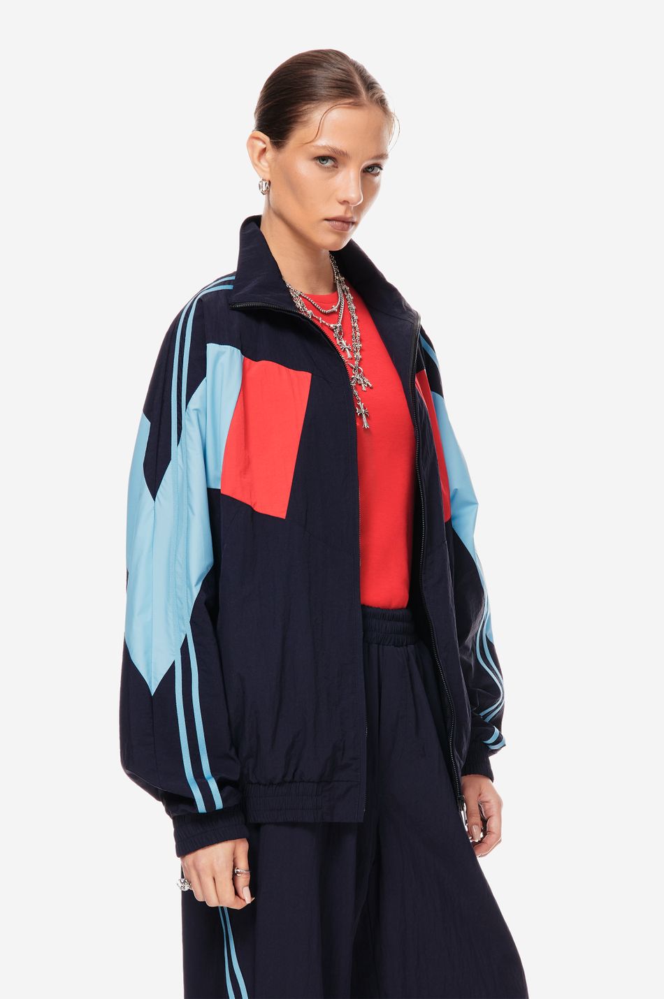 new retro — олимпийка, вдохновлённая эстетикой 90-х, где графичные цветовые блоки и динамичные линии формируют современную архитектуру силуэта. фирменная вышивка p.p.s. на воротнике и контрастные детали подчёркивают ДНК post post scriptum.