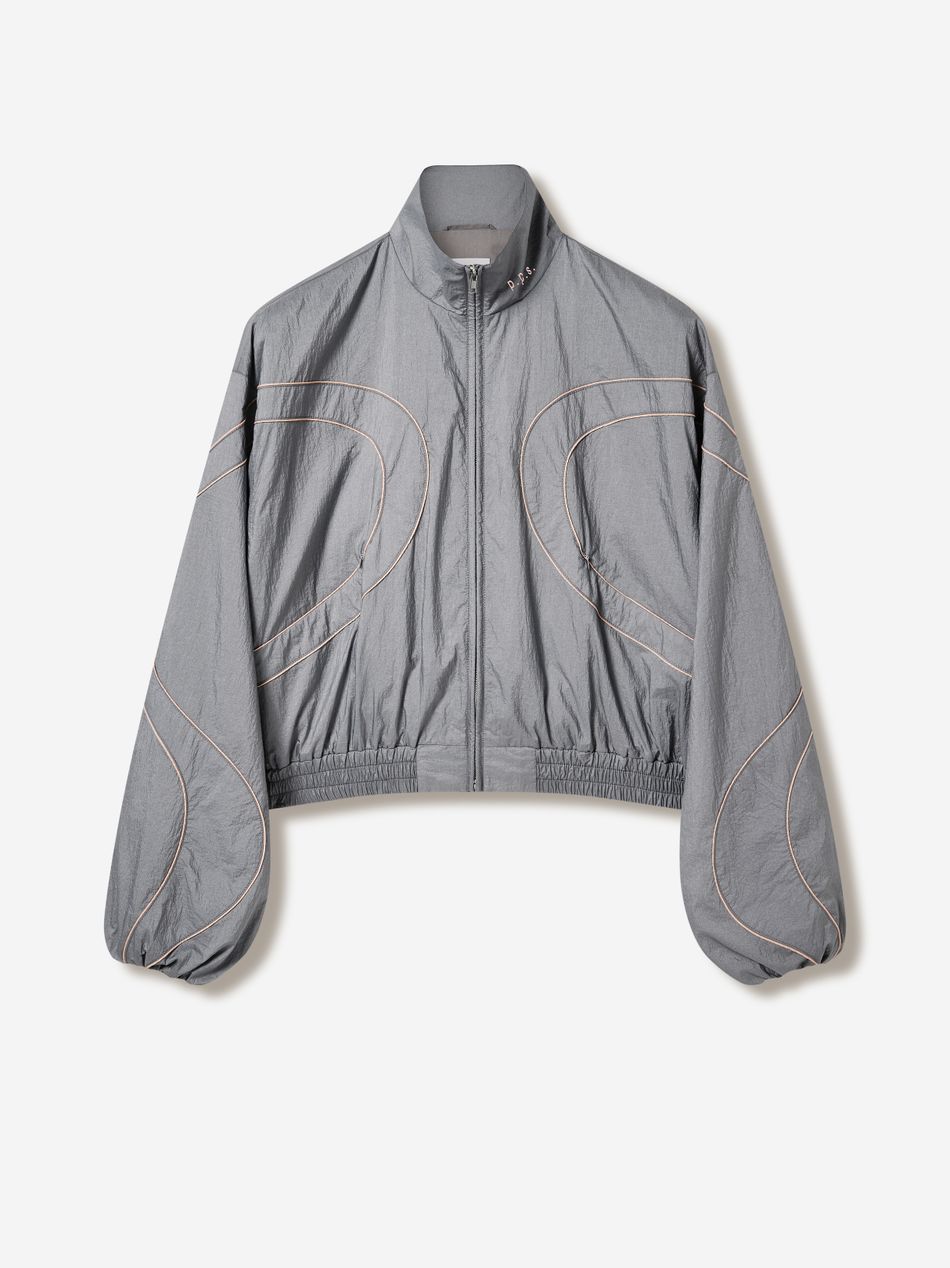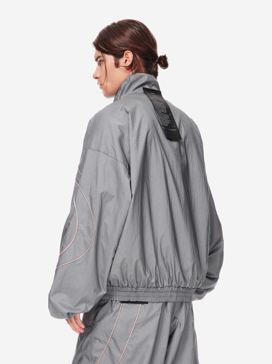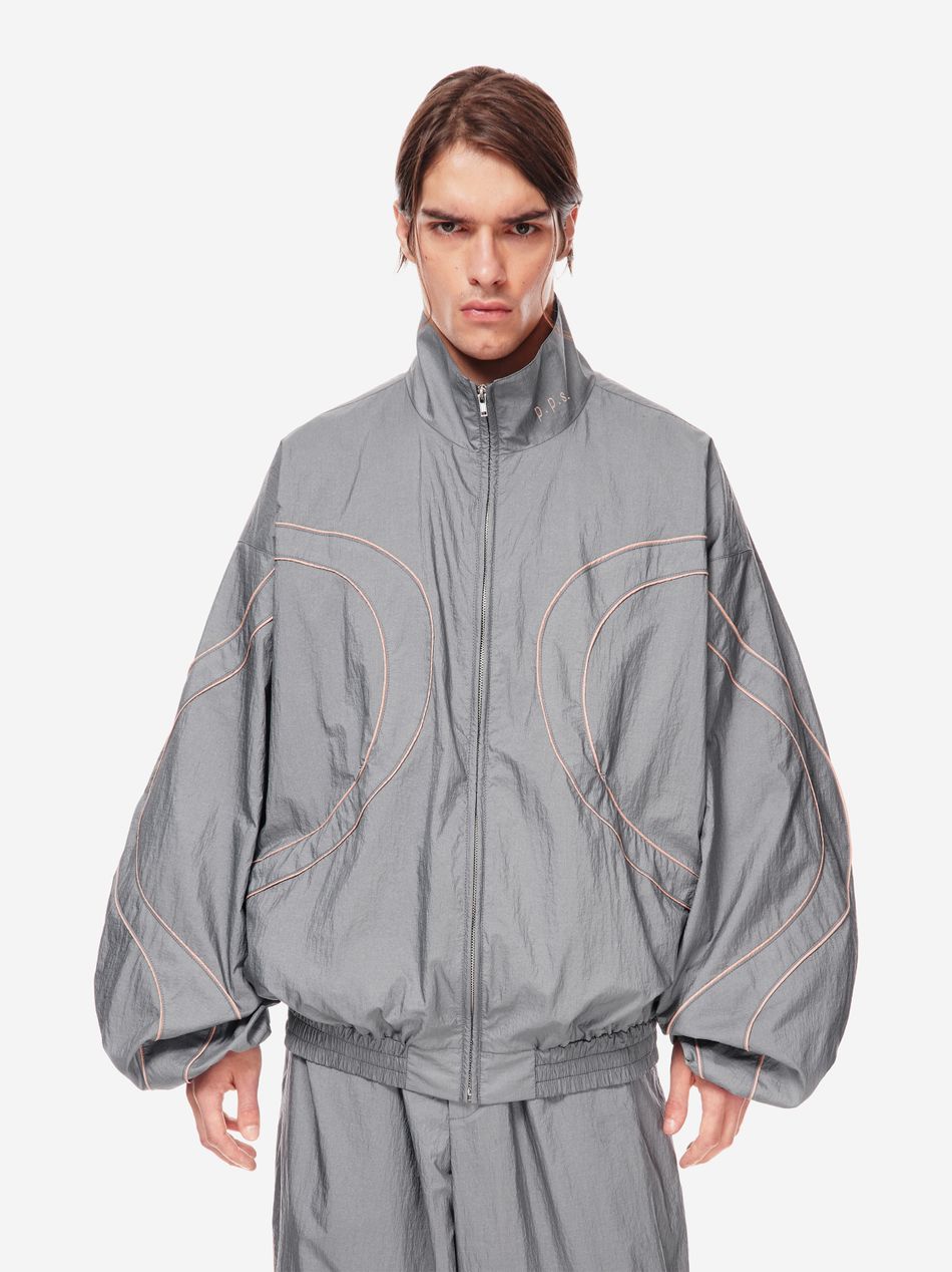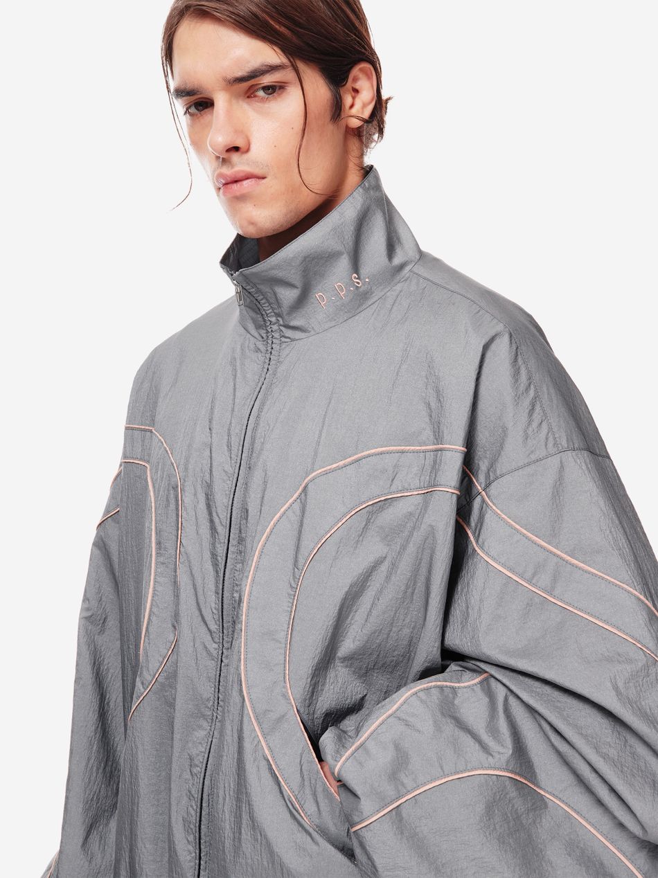 олимпийка свободного силуэта из лёгкой нейлоновой ткани с хлопковой подкладкой. фигурные контрастные вставки образуют графичную динамику кроя. застёжка на молнию и эластичный пояс формируют комфортную посадку. объёмные рукава со спущенной линией плеча дополнены резинкой внизу. фирменные детали — вышивка «скобки» на спине, логотип p.p.s. и патч-манифест.