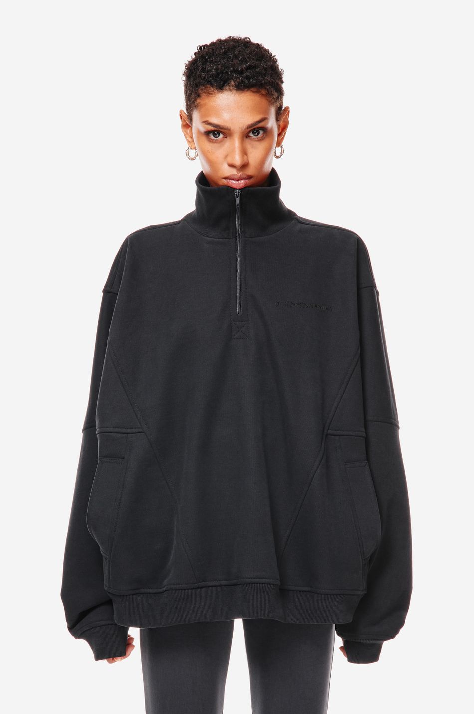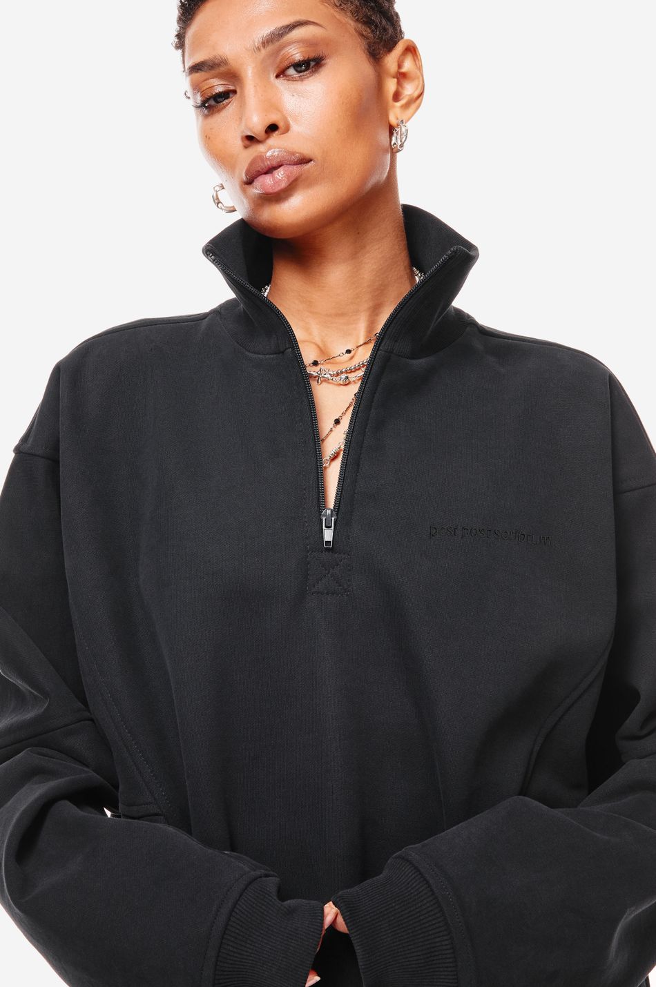 Фирменная вышивка post post scriptum на груди и патч-манифест подчёркивают эстетику бренда.