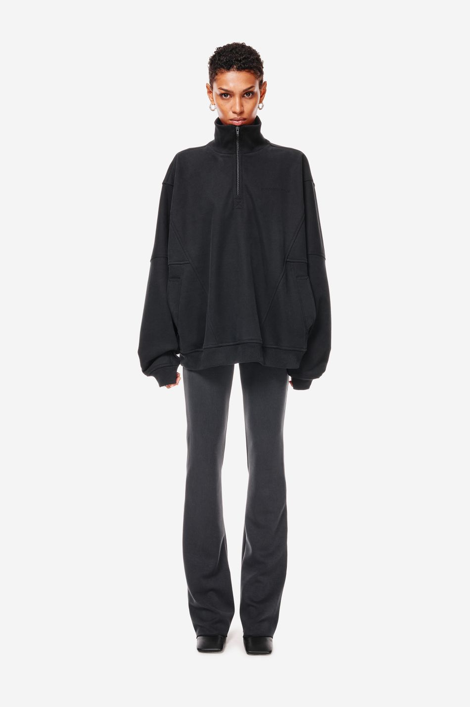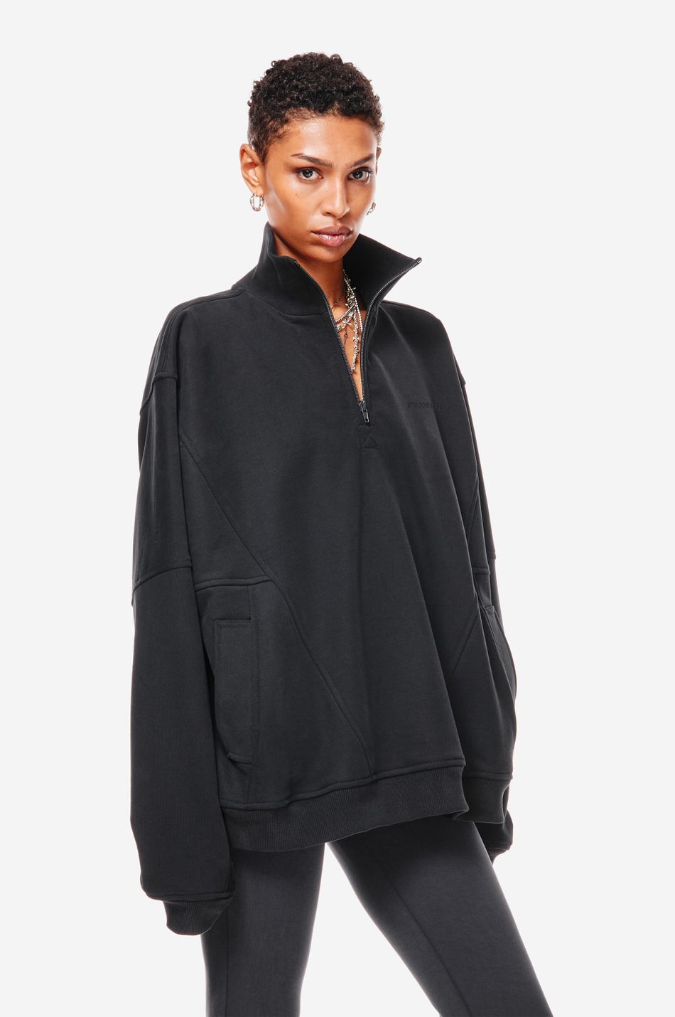 Фирменный крой с пониженной линией плеч, воротник-стойка на молнии.