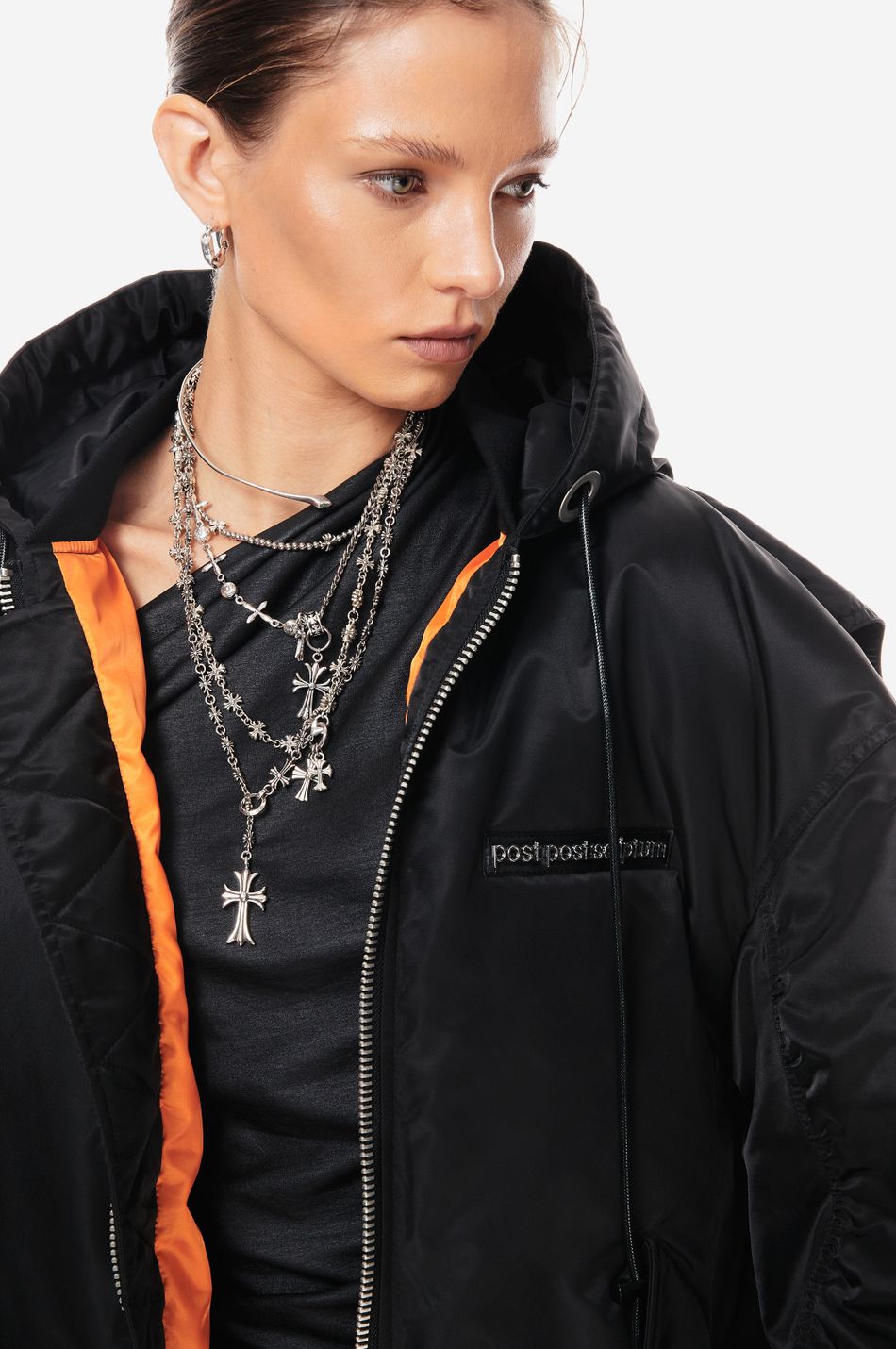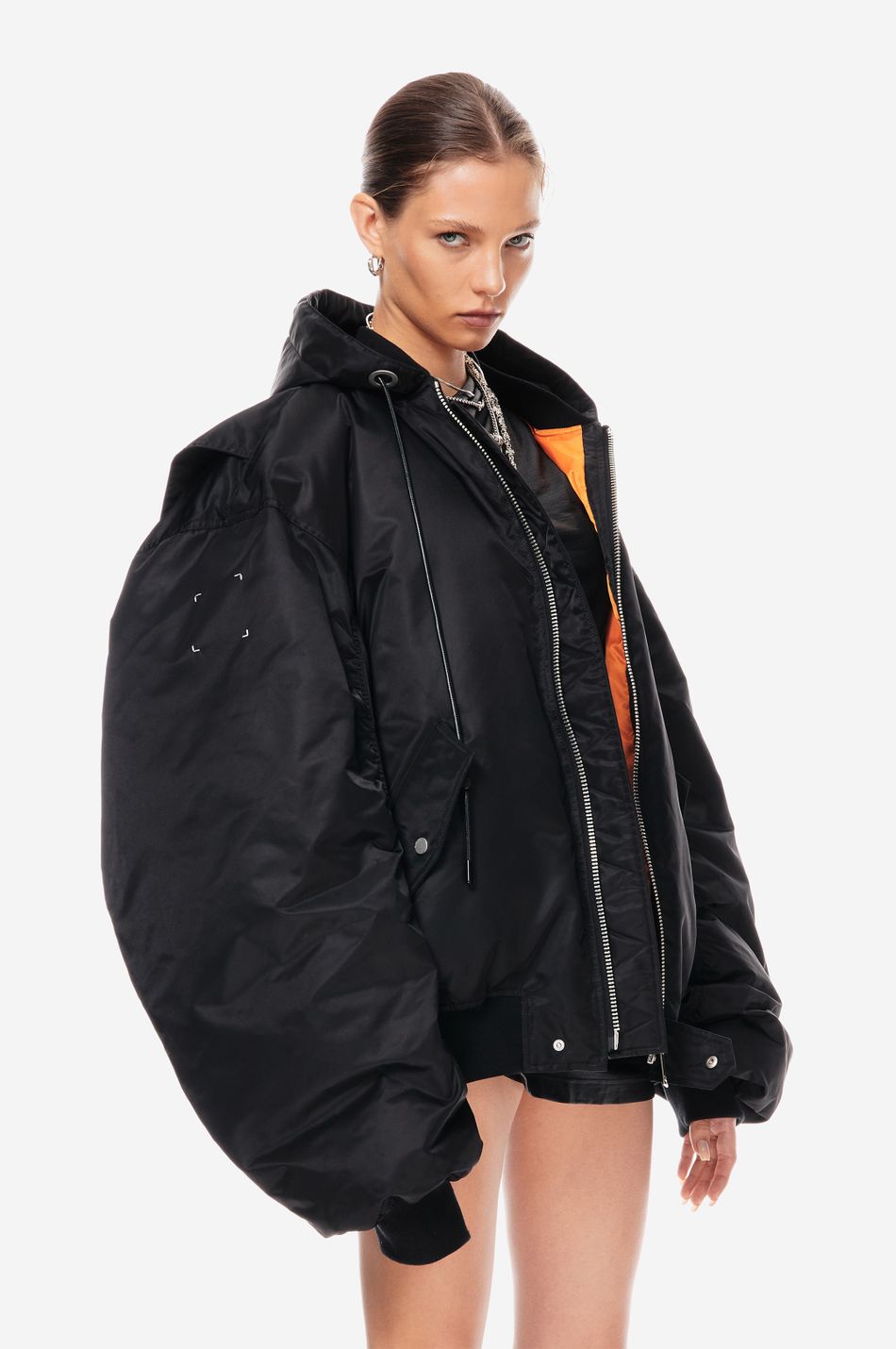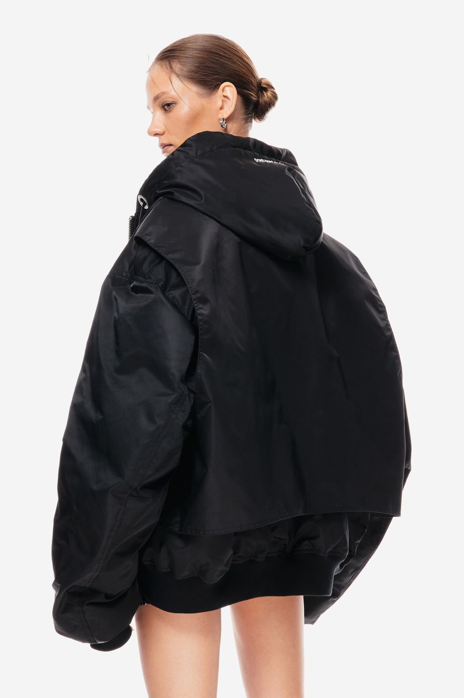 UNIT 28 — архивный силуэт в современной интерпретации. оверсайз-бомбер из экологичного нейлона с пуховым утеплением. узнаваемые коды бренда: металлический логотип, вышитые скобки, гравировка на фурнитуре. создан для температур до -25°C.